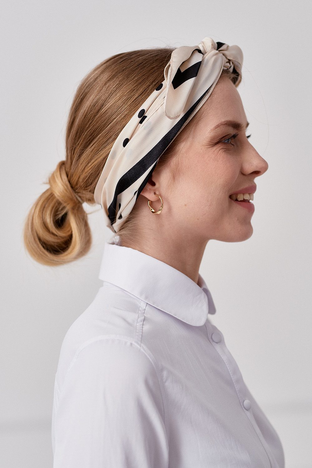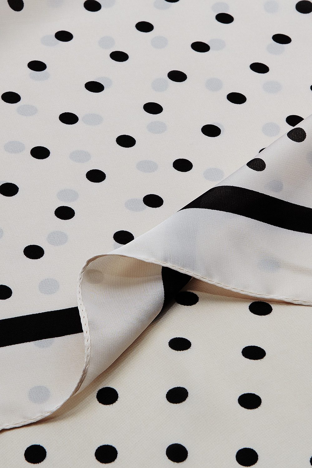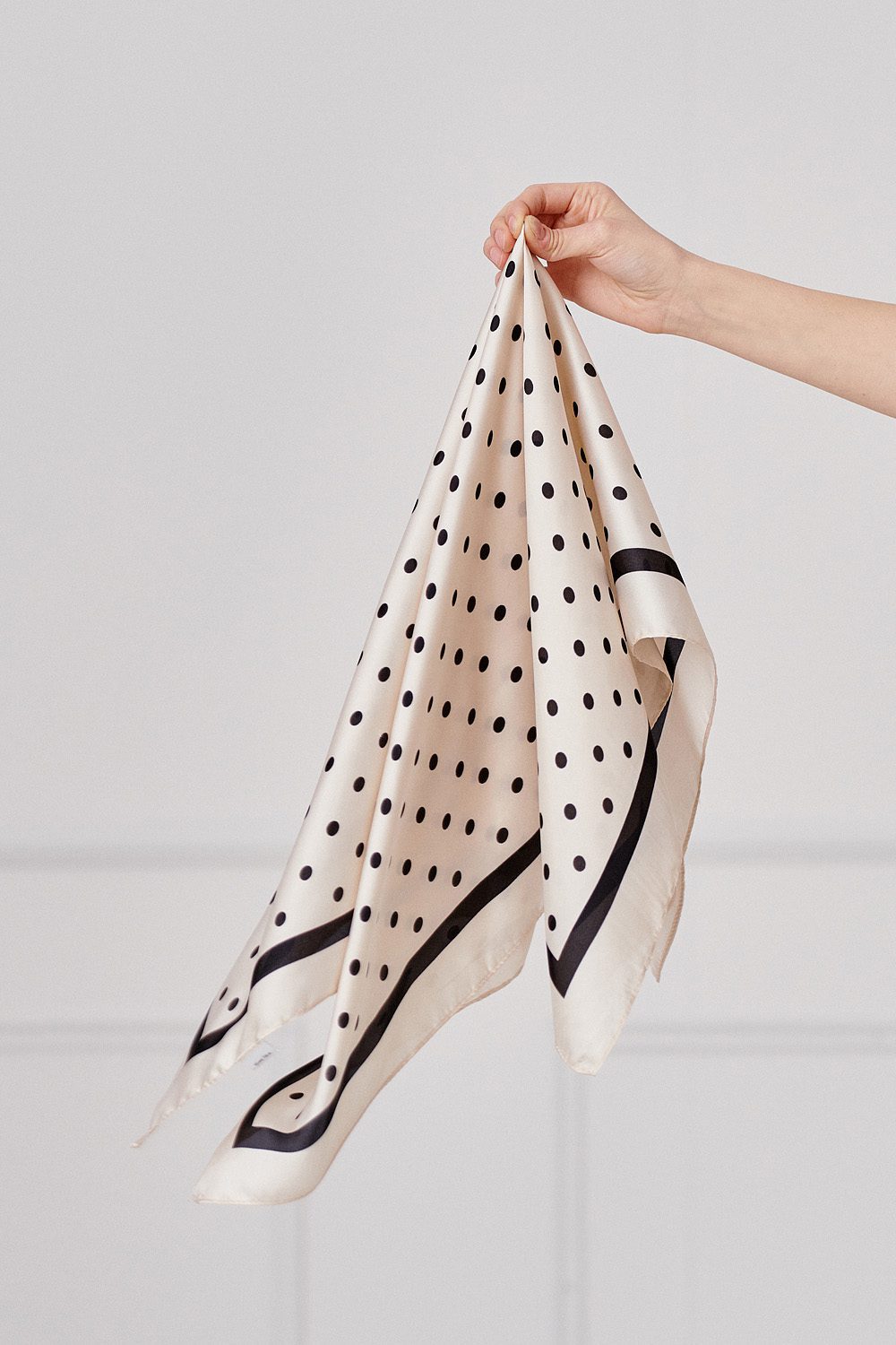 Ponadczasowy wzór apaszki w czarne groszki na kremowym tle przywodzi na myśl zarówno klasykę i elegancję, jak i styl pin-up. To motyw, który może być uzupełnieniem, a także głównym elementem nadającym charakteru.