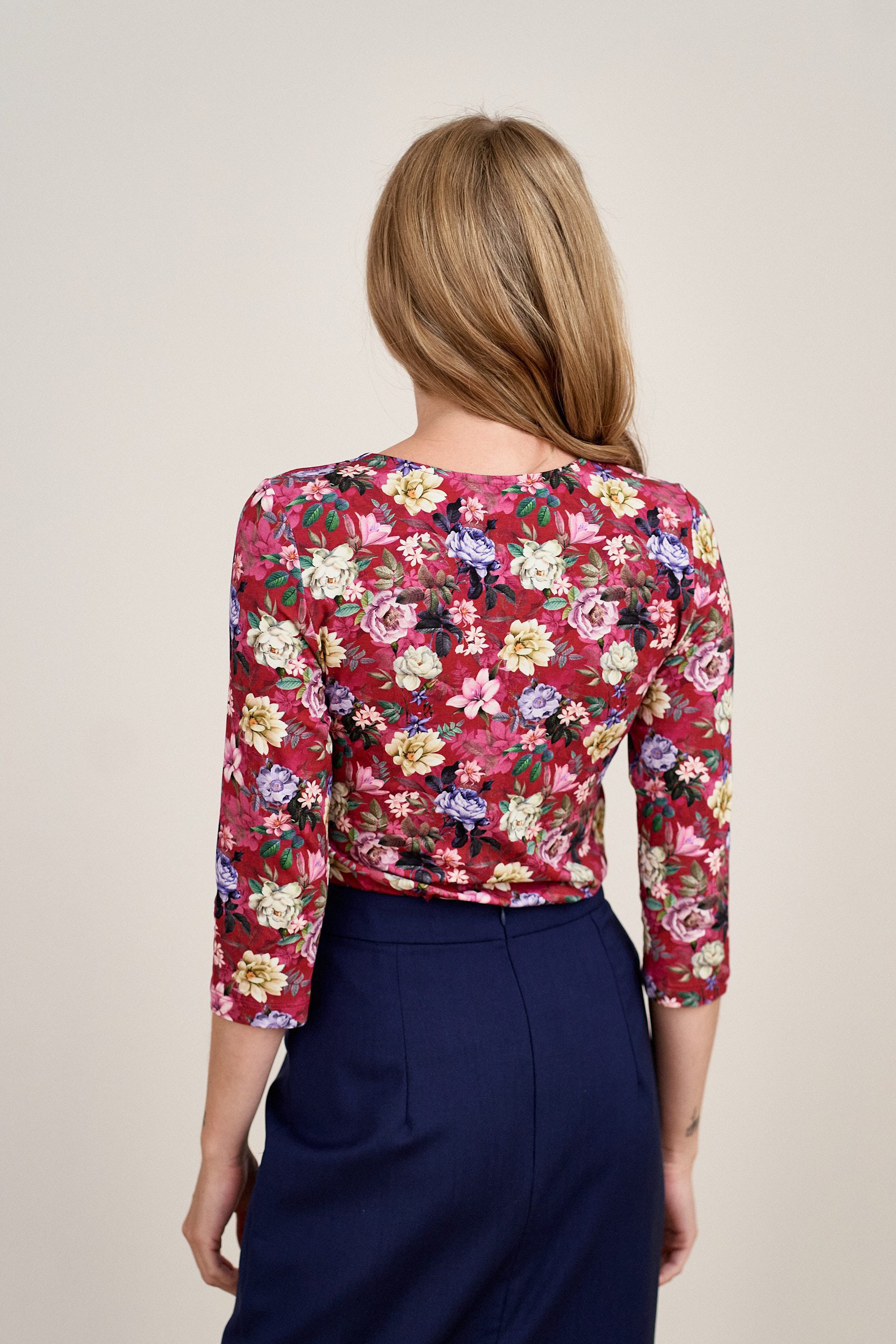 Uszyta jest z dzianiny wiskozowej z domieszką elastanu – materiału o wielu zaletach. Dzięki właściwościom higroskopijnym materiał zapewnia komfort noszenia w każdej sytuacji. Zawartość elastanu umożliwia dopasowanie do figury, dzięki niemu dzianina pracuje i dobrze się układa. Jest także miękka i bardzo przyjemna w dotyku. Poprzez stały dopływ powietrza nie pozwoli się spocić. Łączy w sobie elegancki wygląd ze swobodą ruchu: szyk i praktyczność, czyli bluzka doskonała!