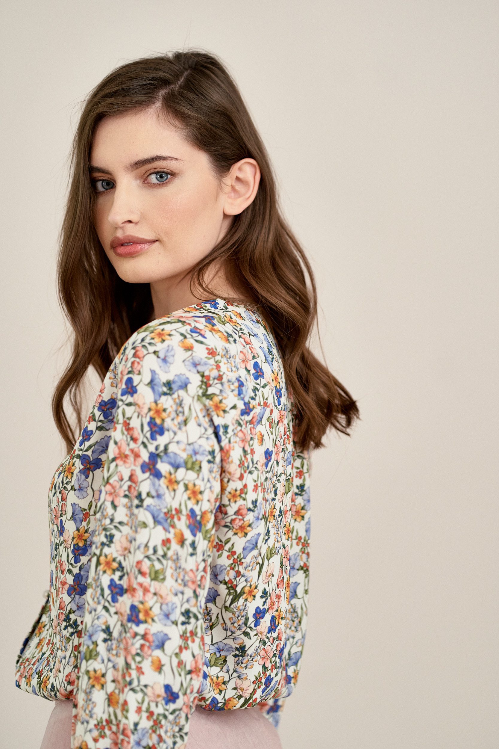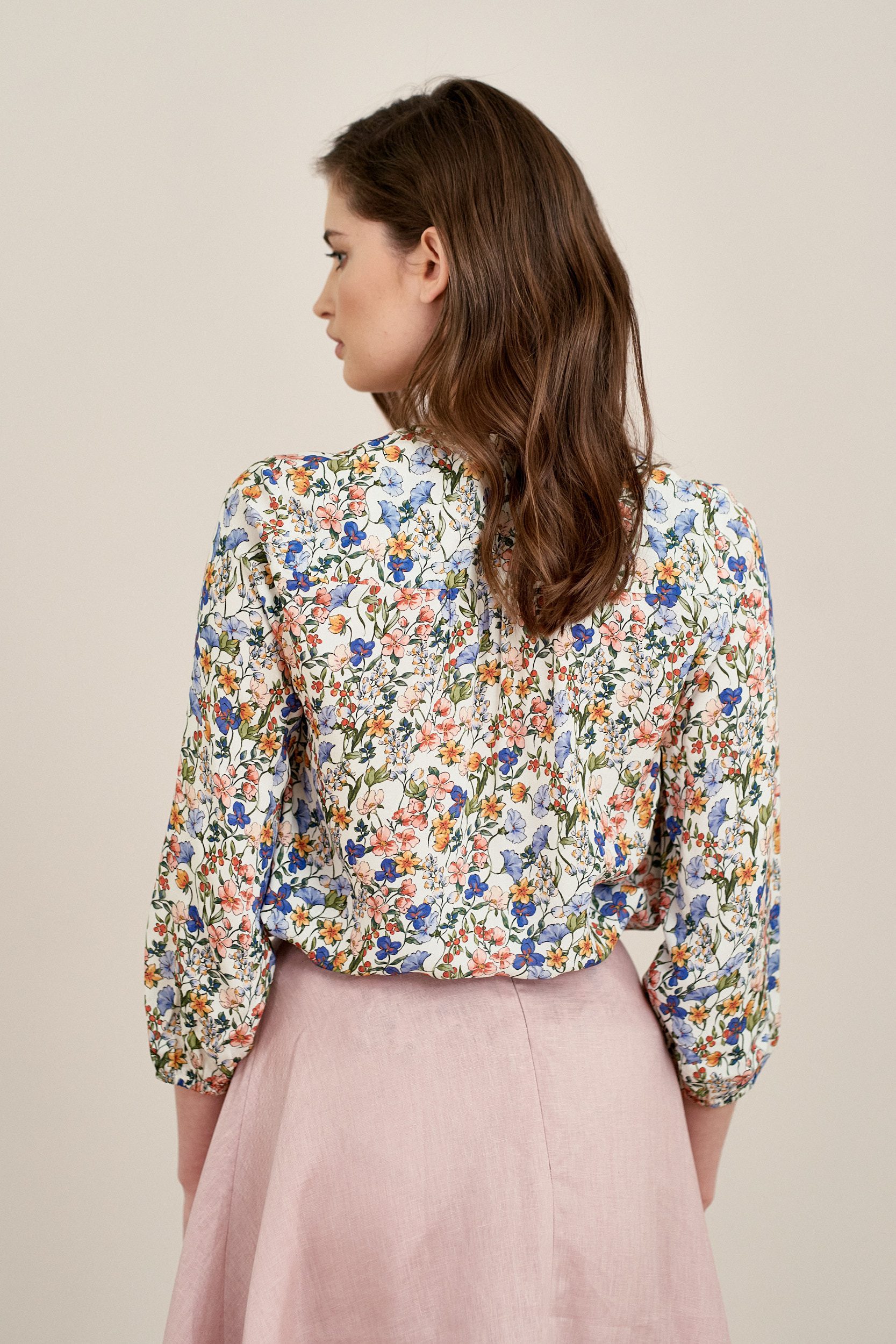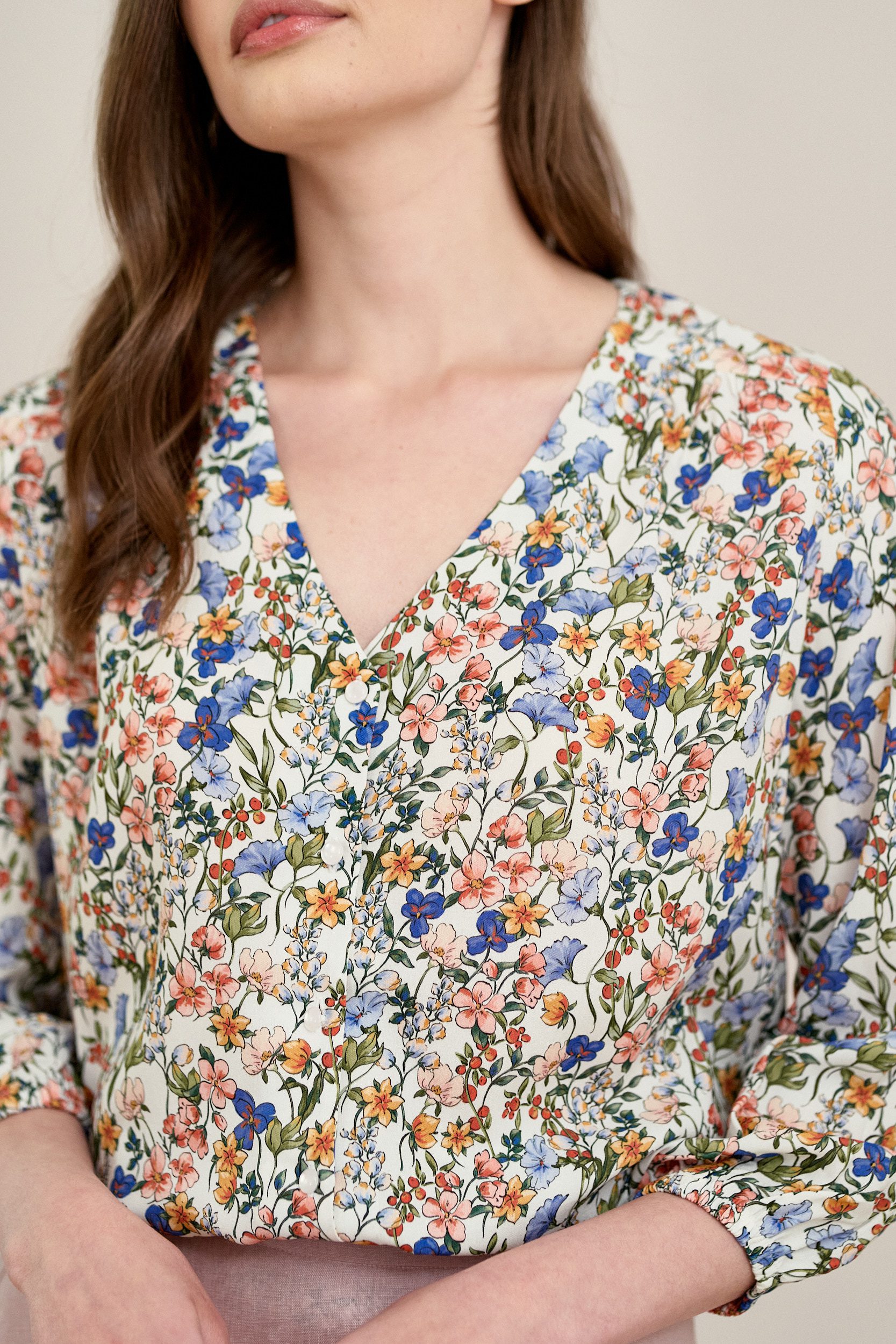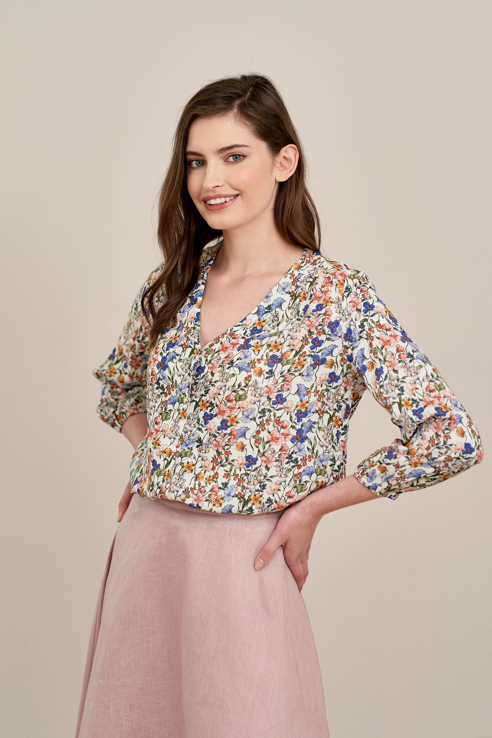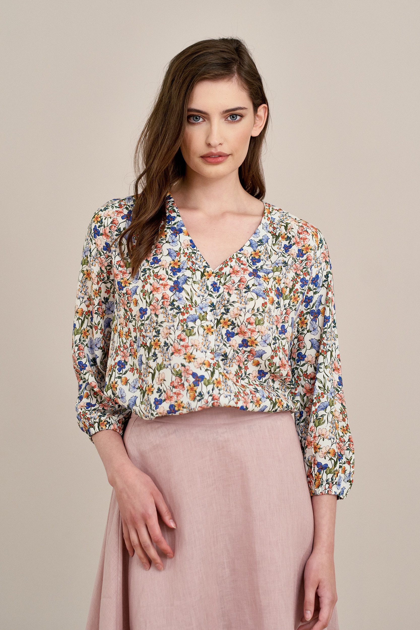 Iona to klasyczna wiskozowa bluzka zapinana na guziki. Ma dekolt w kształcie litery V oraz rękaw 3/4 z delikatnym marszczeniem przy gumce rękawa.