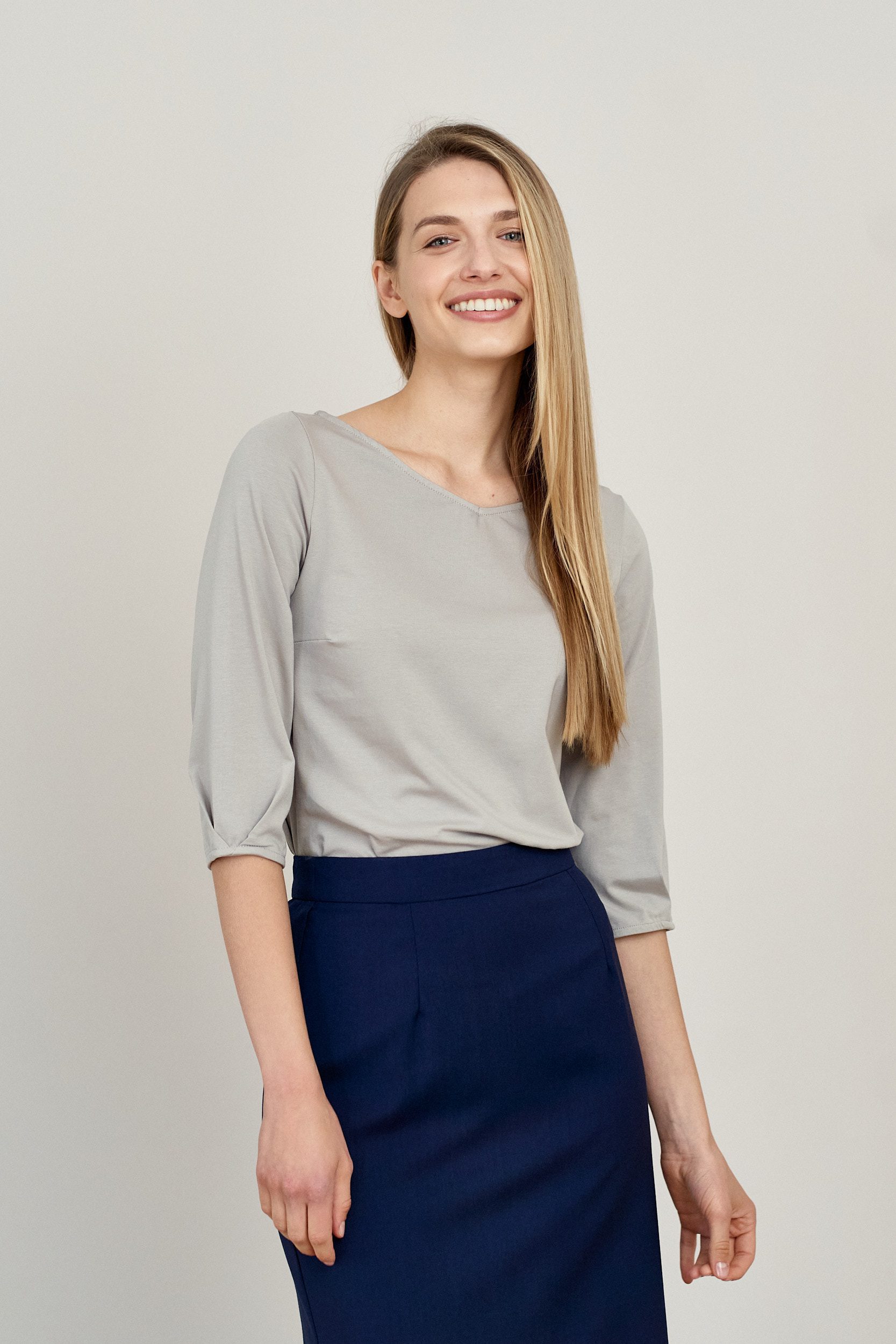 Primula to wygodna dzianinowa bluzka z dekoltem w kształcie szerokiej, zaokrąglonej litery V, z tyłu materiał zebrany jest na kształt kokardy, pod którą jest łezka. Rękaw 3/4 zakończony został dwoma ozdobnymi kontrafałdami.