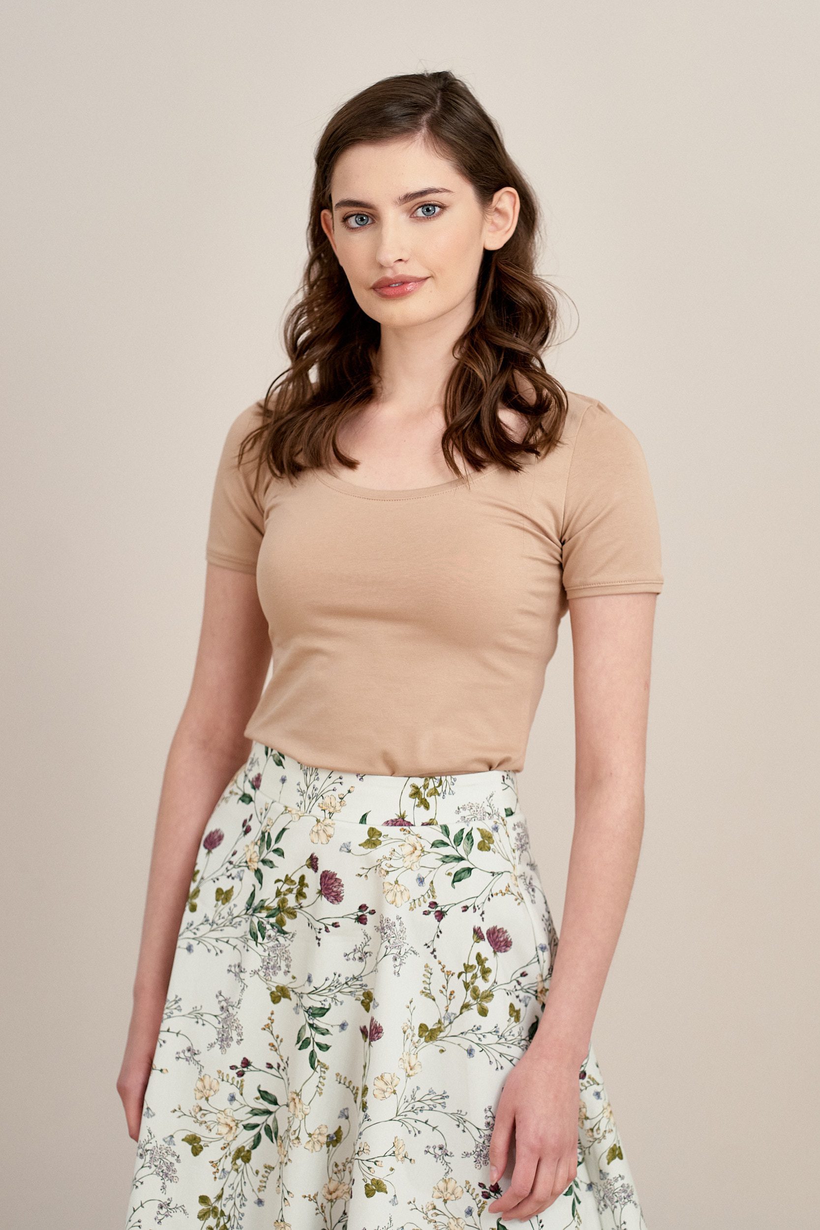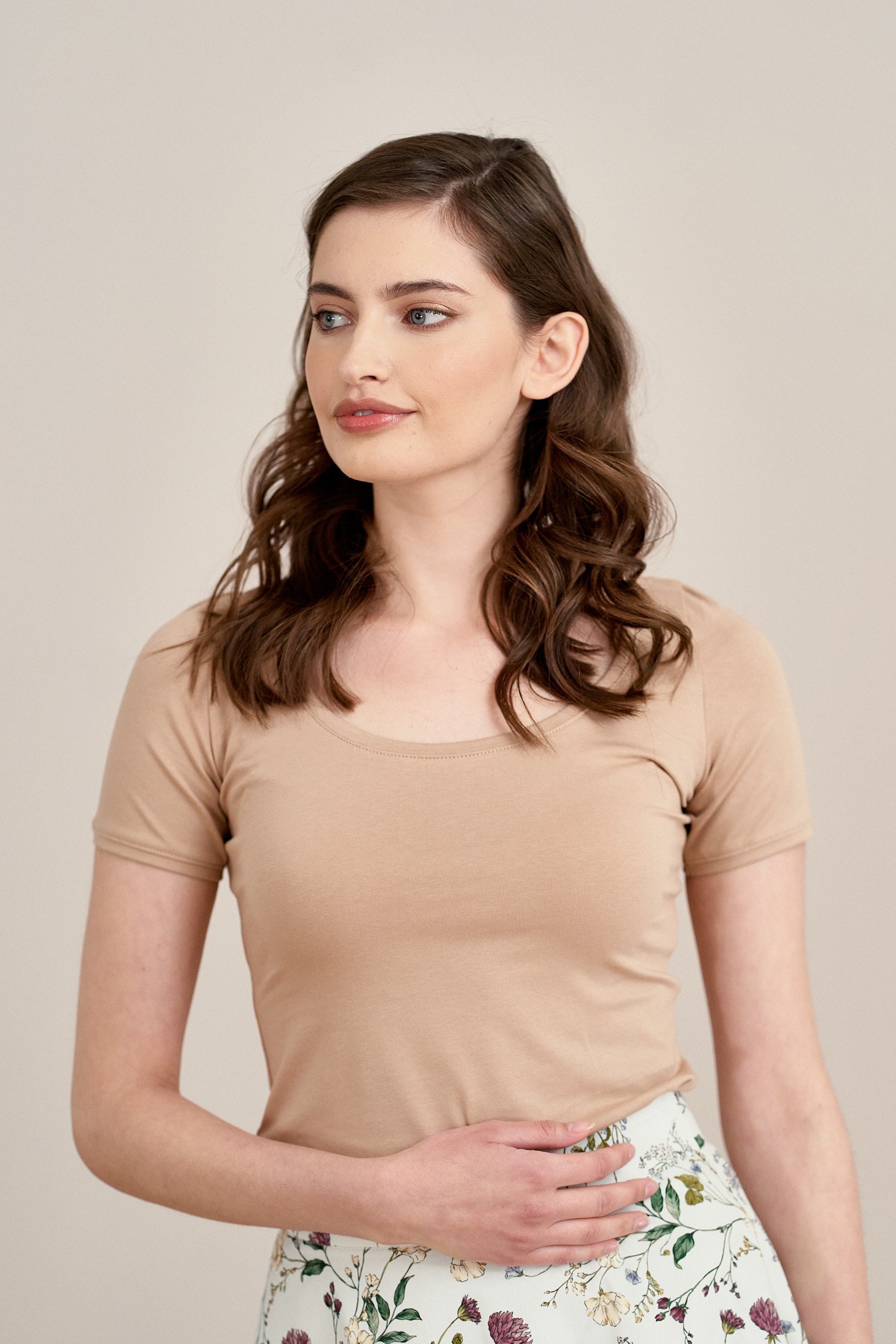 Do zalet naturalnych materiałów należy stały dopływ powietrza do skóry oraz higroskopijność. Wygodna, rozciągliwa dzianina pasuje do każdej figury i świetnie się sprawdzi w różnorodnych zestawach.