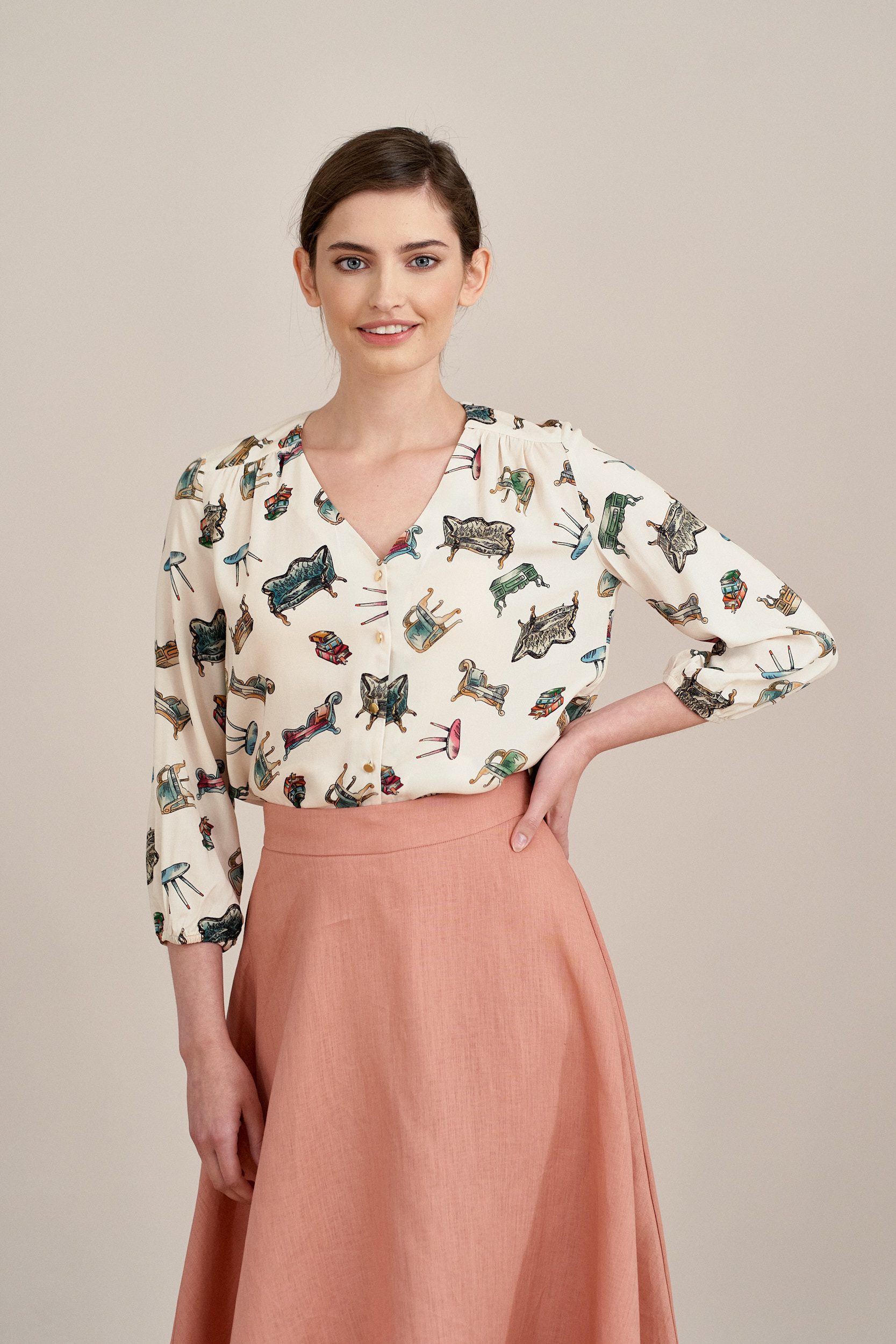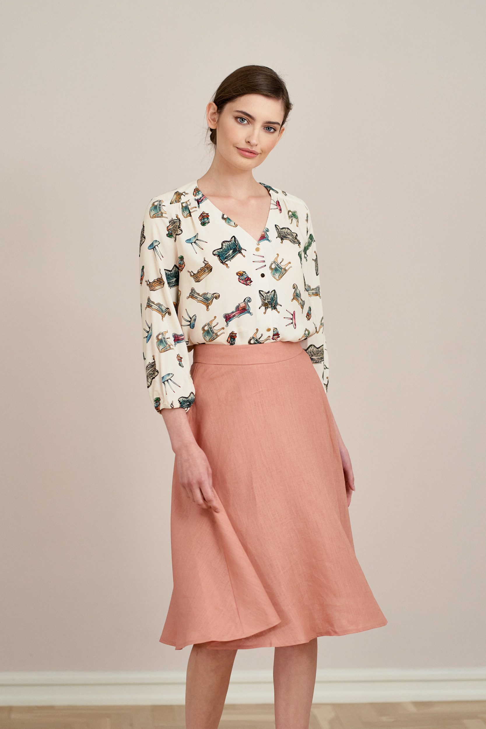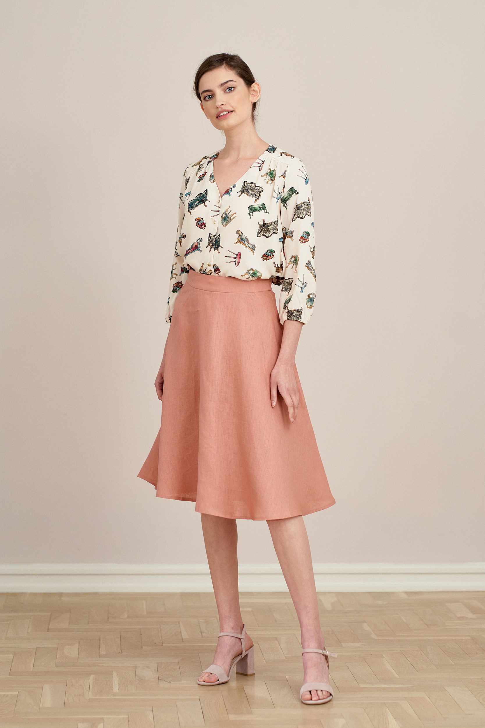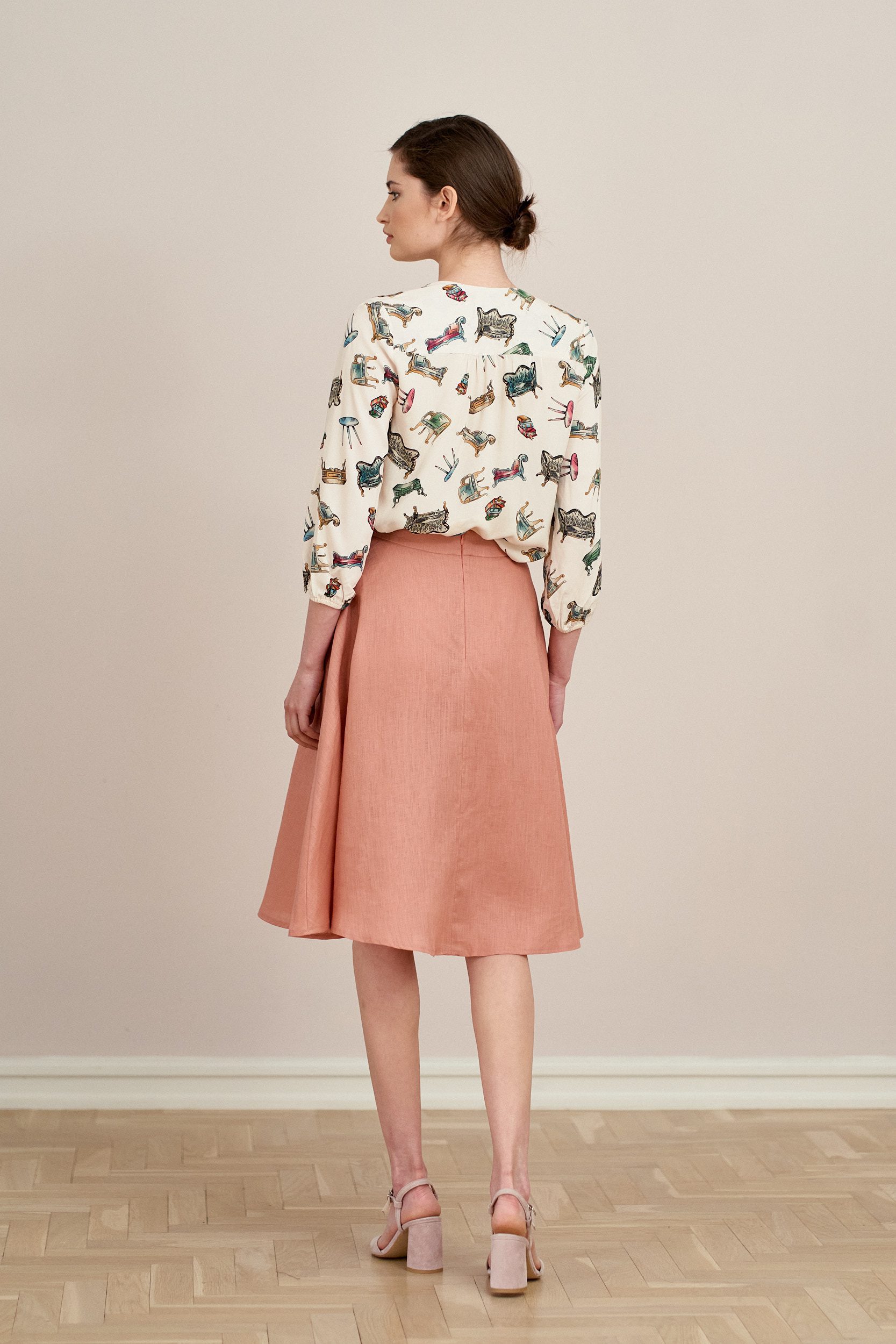Carissa to spódnica z połowy koła z odcinanym pasem. Pięknie się układa – faluje wokół sylwetki i podkreśla talię.
