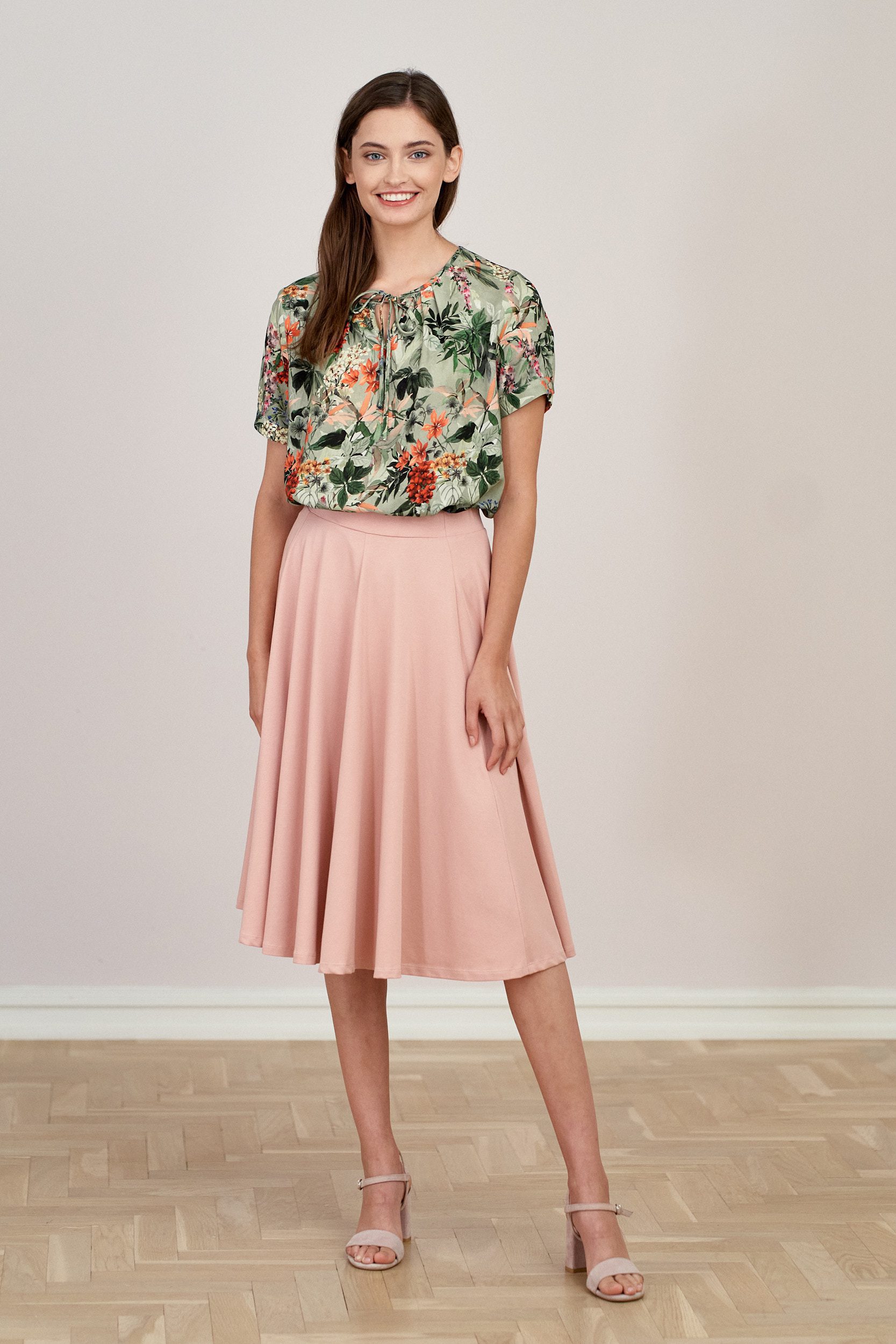 Farin to dzianinowa spódnica na szerokiej gumie, złożona z sześciu klinów tworzących całe koło. Taki fason bardzo zgrabnie układa się na sylwetce i wdzięcznie faluje wokół niej. Z pewnością sprawi, że poczujesz się szczególnie kobieco.
