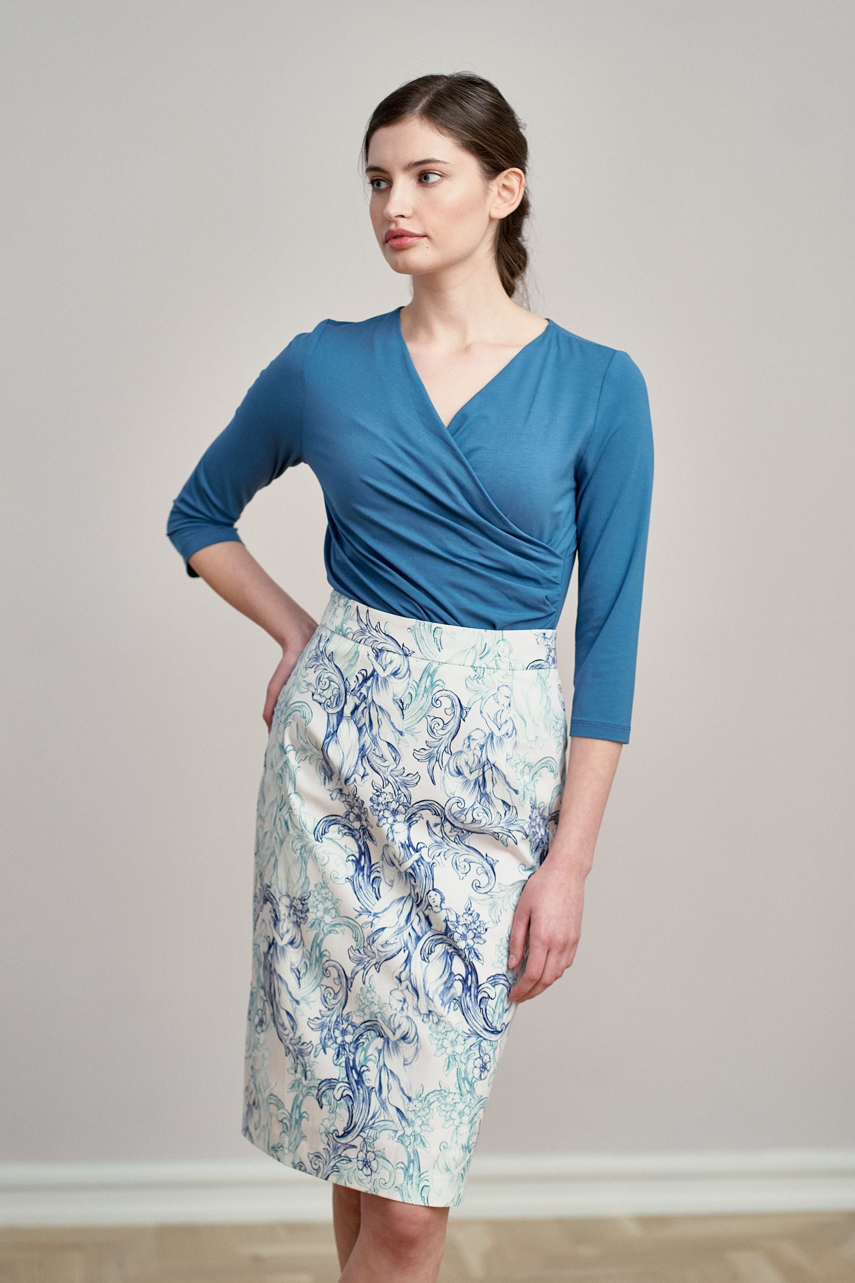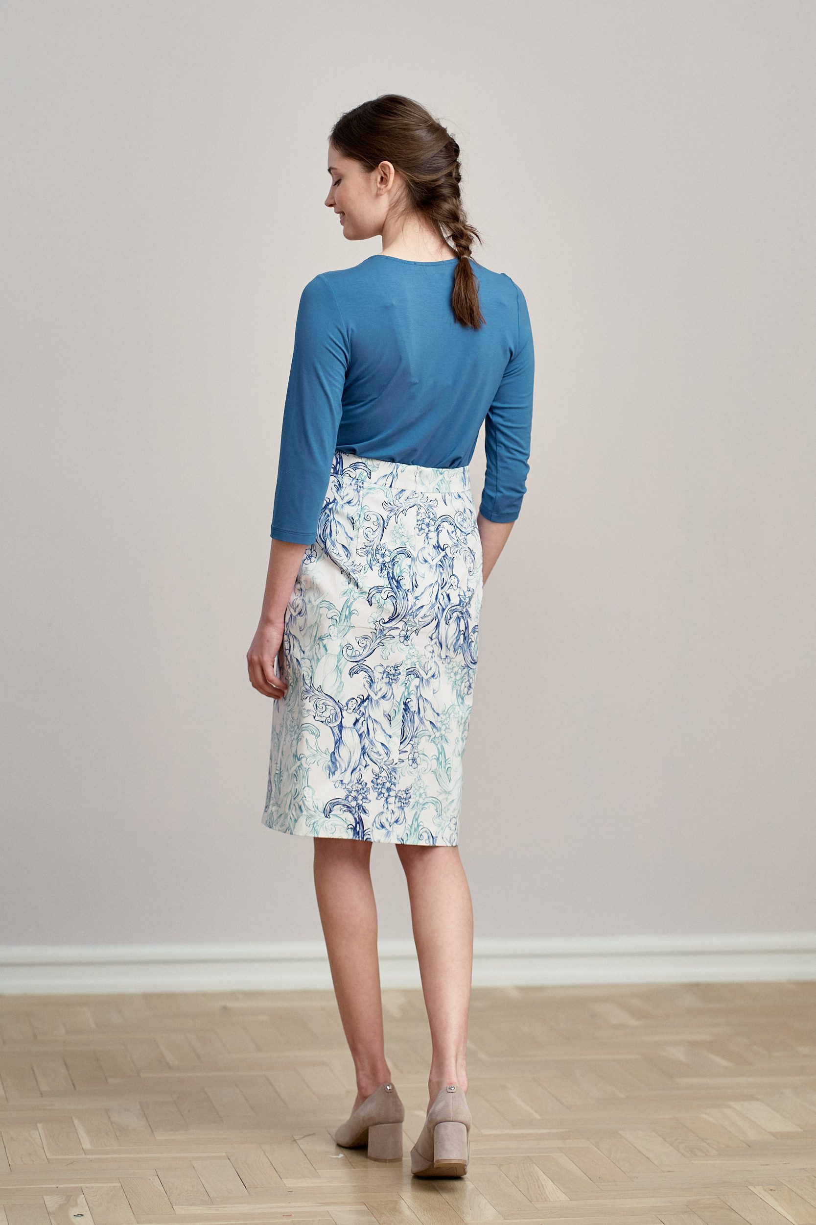 Leto to ołówkowa spódnica o długości za kolano, z odcinanym pasem. Cztery zaszewki doskonale modelują i wysmuklają sylwetkę. Z tyłu spódnica posiada rozporek na zakładkę.