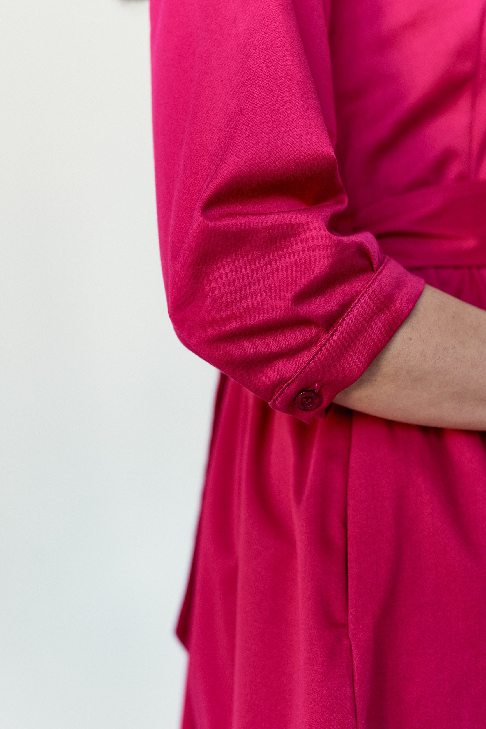 Aglaia to delikatnie rozkloszowana sukienka z marszczeniem w talii, wygodnym rękawem o długości za łokieć, dekoltem w stójkę, z krytą plisą zakończoną oryginalnym ozdobnikiem. Zapinana na perłowe guziki, również przy mankietach wykończonych lekkim marszczeniem. Dodatkowa szarfa o szerokości 5,5 cm pozwala na idealne dopasowanie sukienki w talii, a także nadaje jej szyk. Z pewnością sprawi, że poczujesz się wyjątkowo!