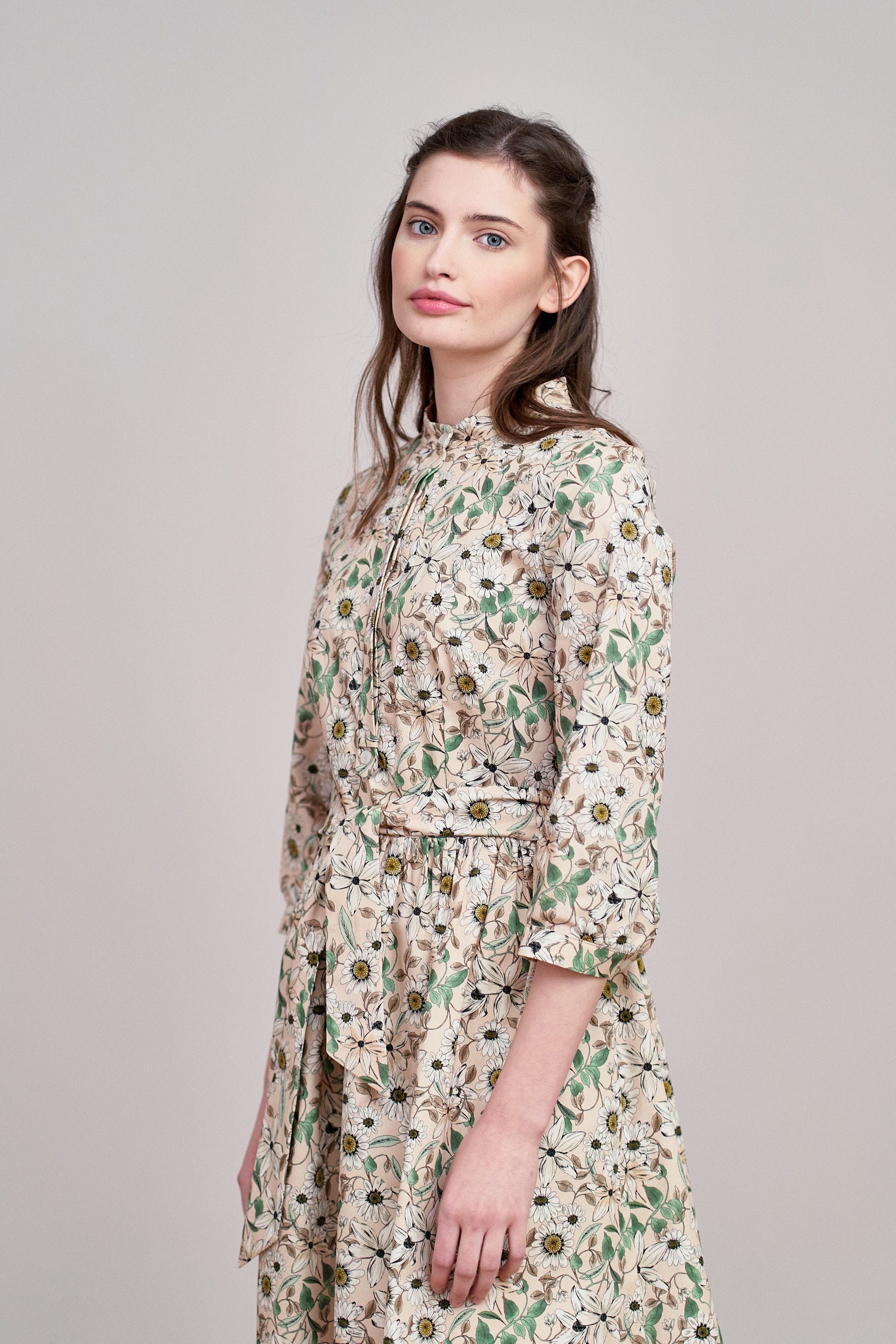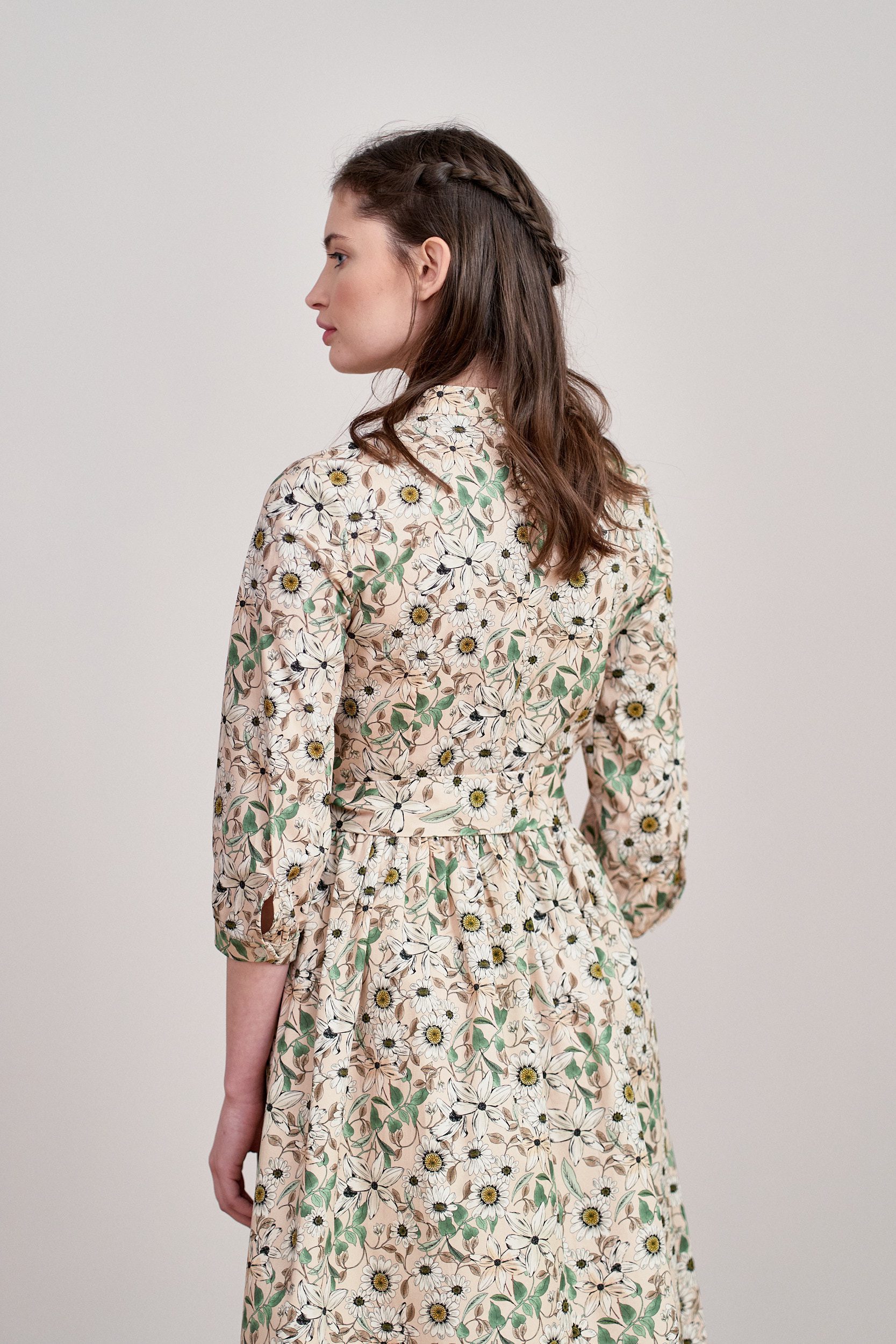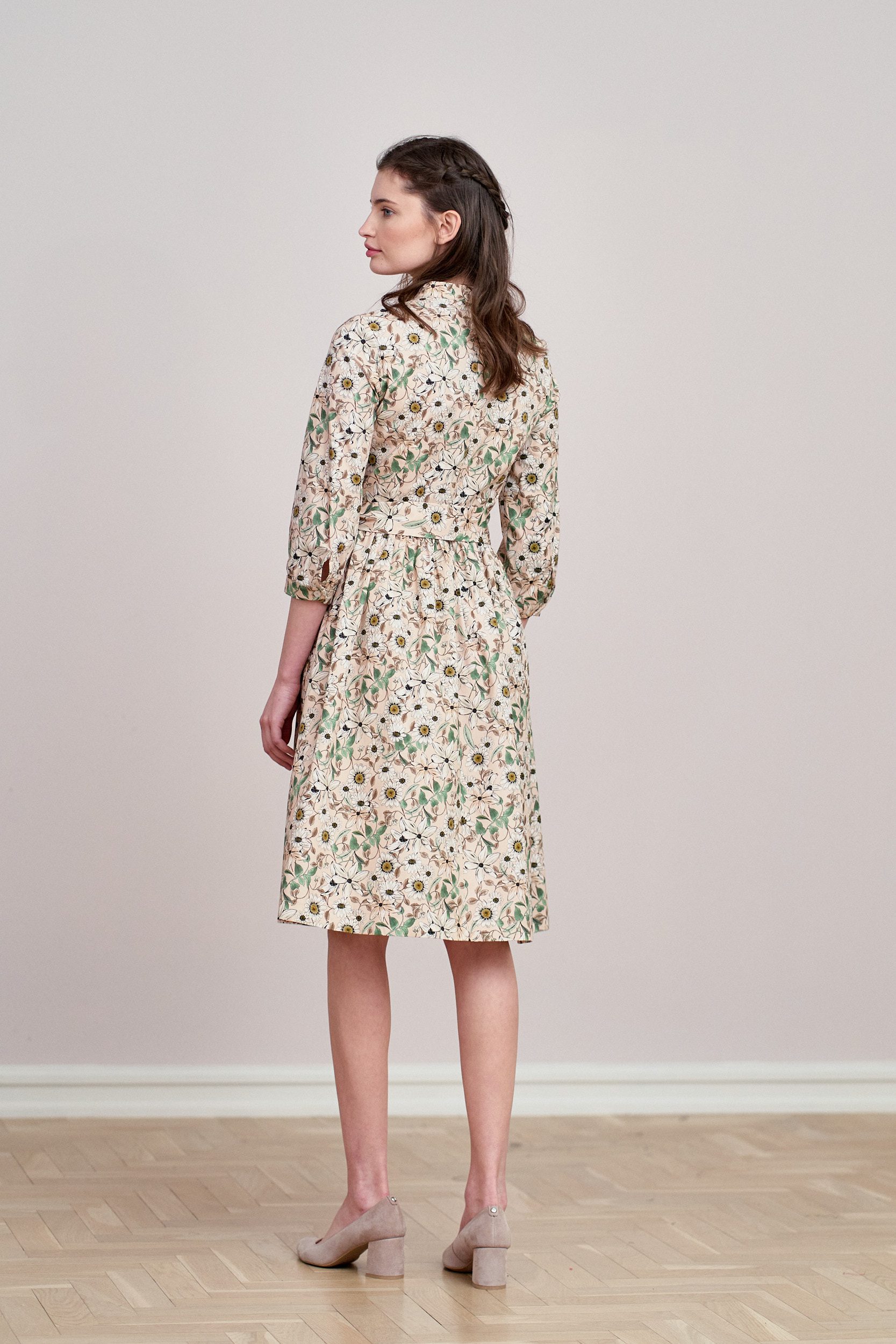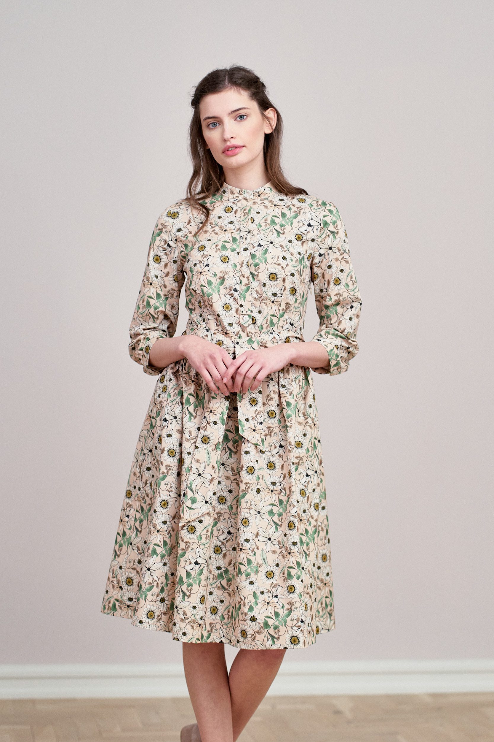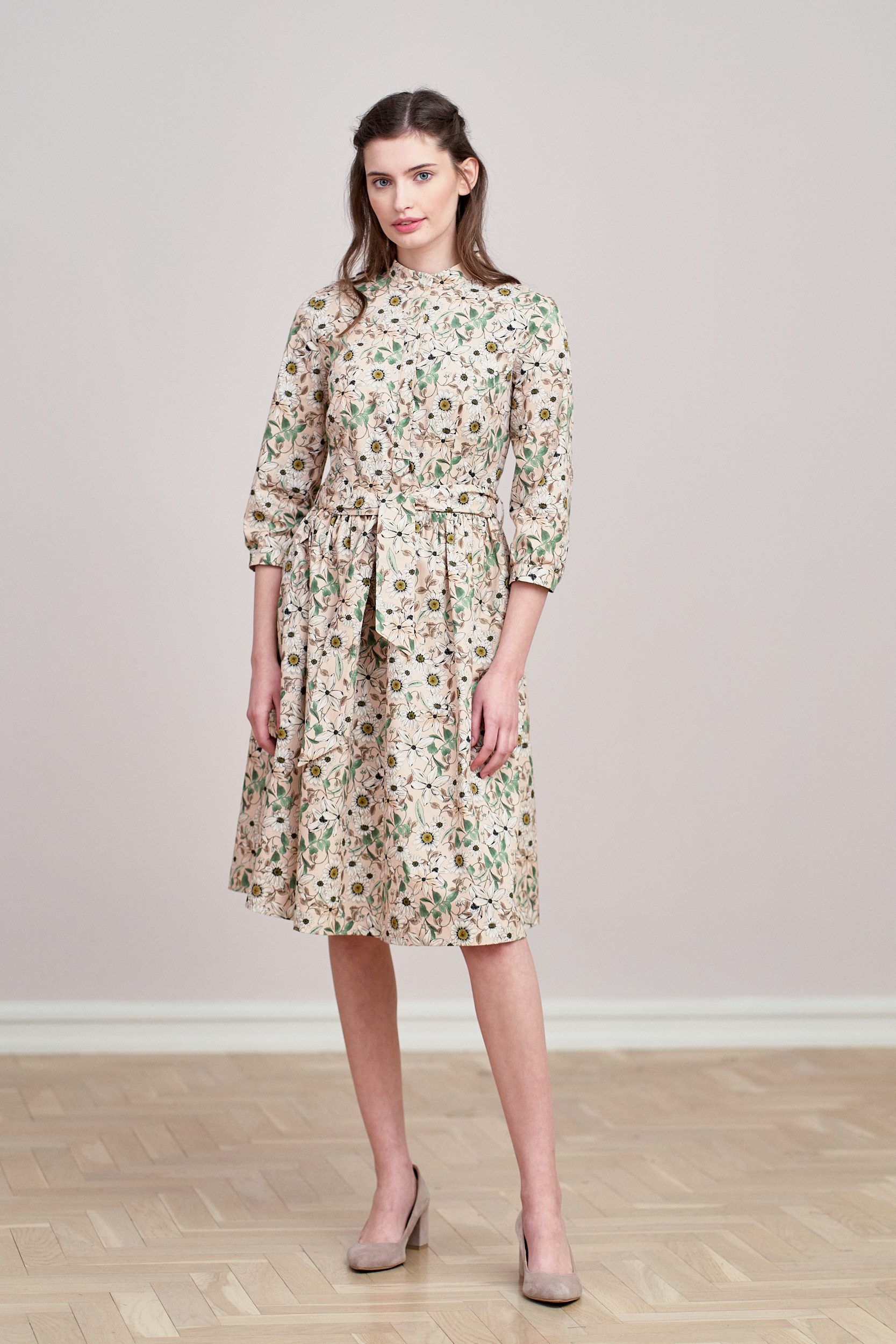 Aglaia to delikatnie rozkloszowana sukienka z marszczeniem w talii, wygodnym rękawem o długości za łokieć, dekoltem w stójkę, z krytą plisą zakończoną oryginalnym ozdobnikiem. Zapinana na perłowe guziki, również przy mankietach wykończonych lekkim marszczeniem. Dodatkowa szarfa o szerokości 5,5 cm pozwala na idealne dopasowanie sukienki w talii, a także nadaje jej szyk. Z pewnością sprawi, że poczujesz się wyjątkowo!