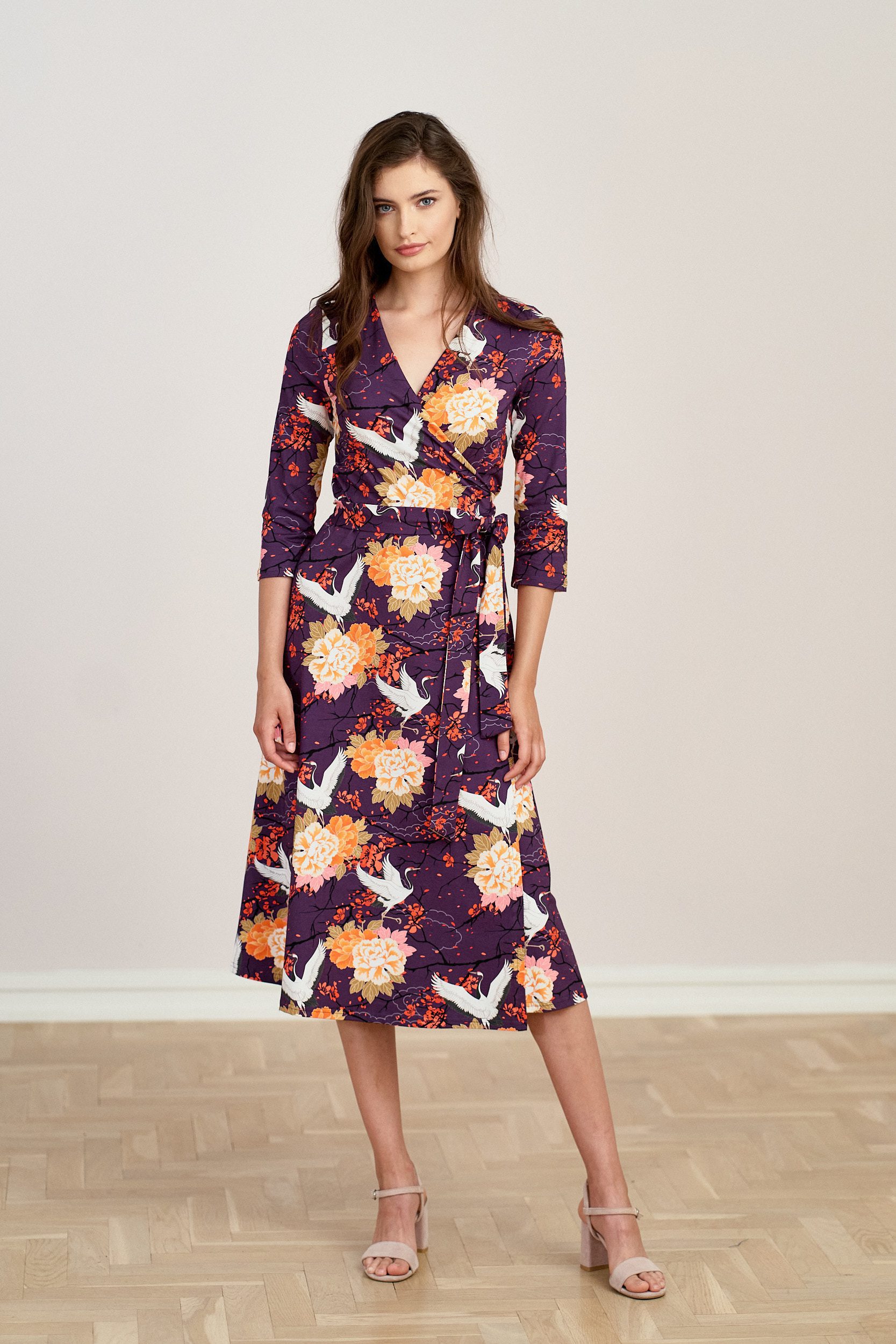 Aida to dzianinowa sukienka o prostym, kopertowym kroju; w talii przewiązywana paskiem. By dobrze ją dopasować, możesz sukienkę całkowicie rozwinąć.