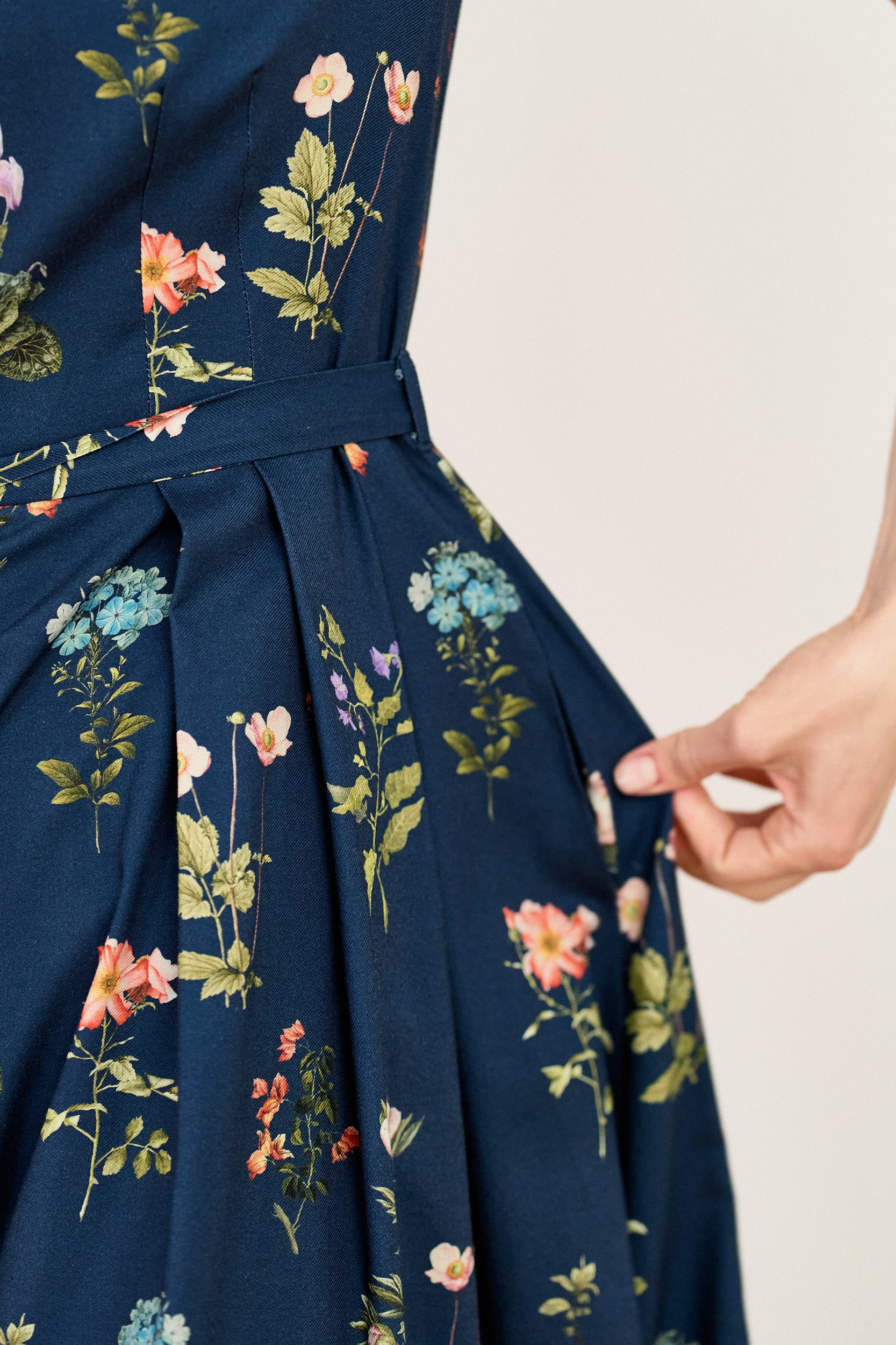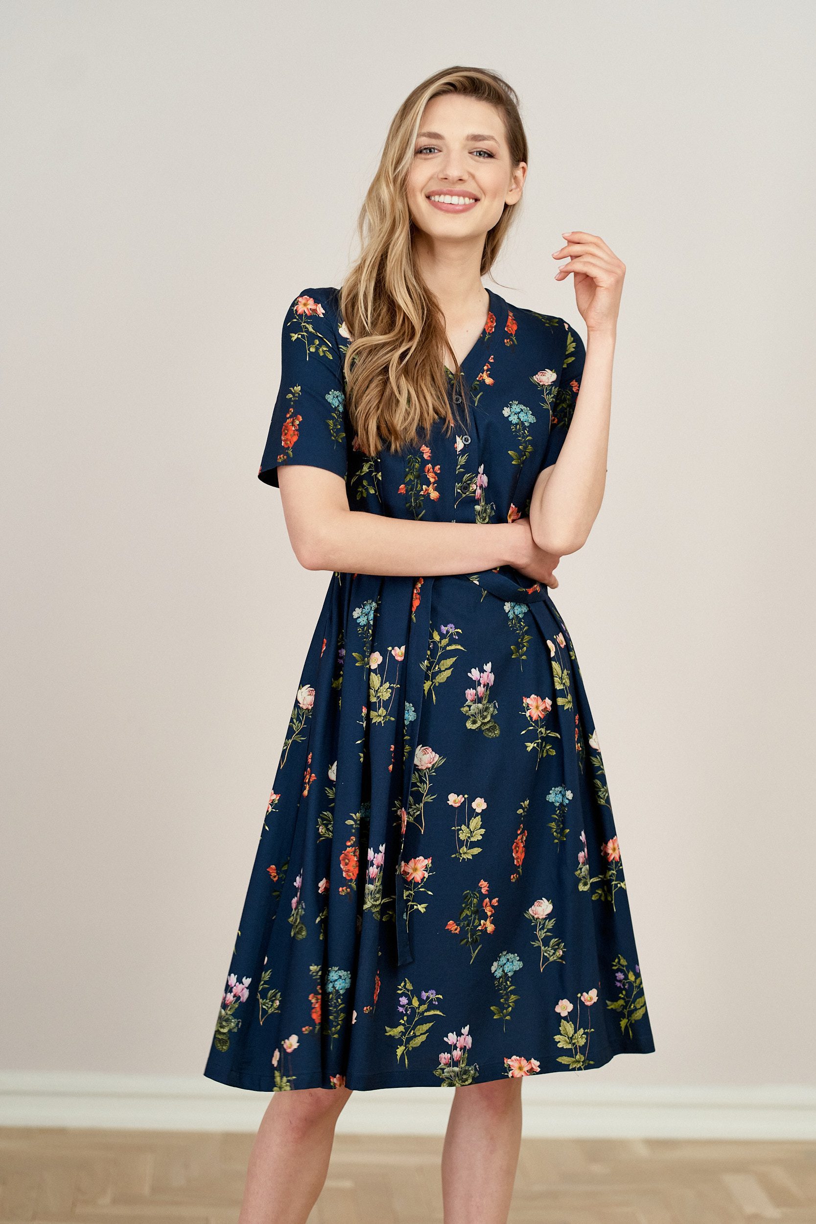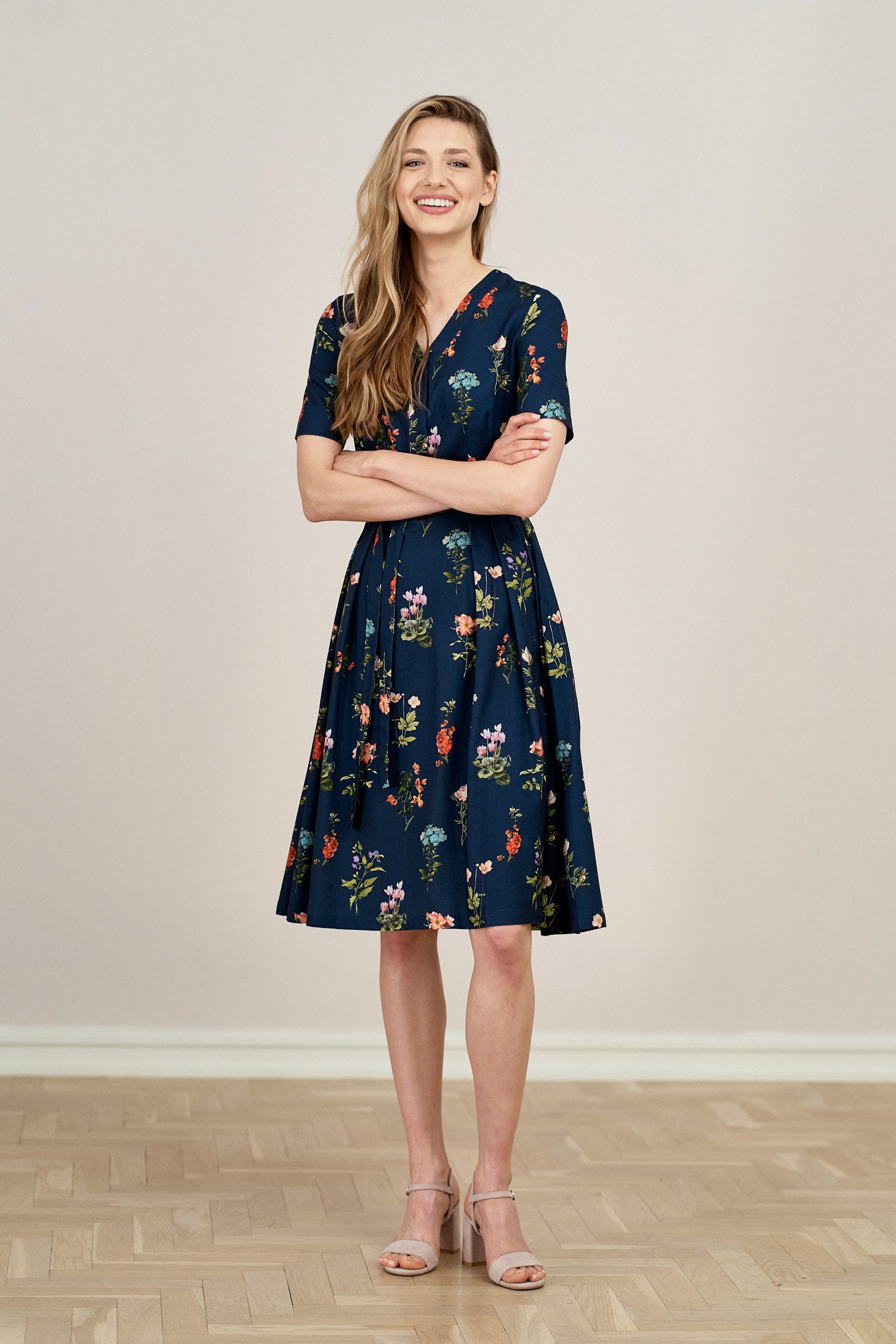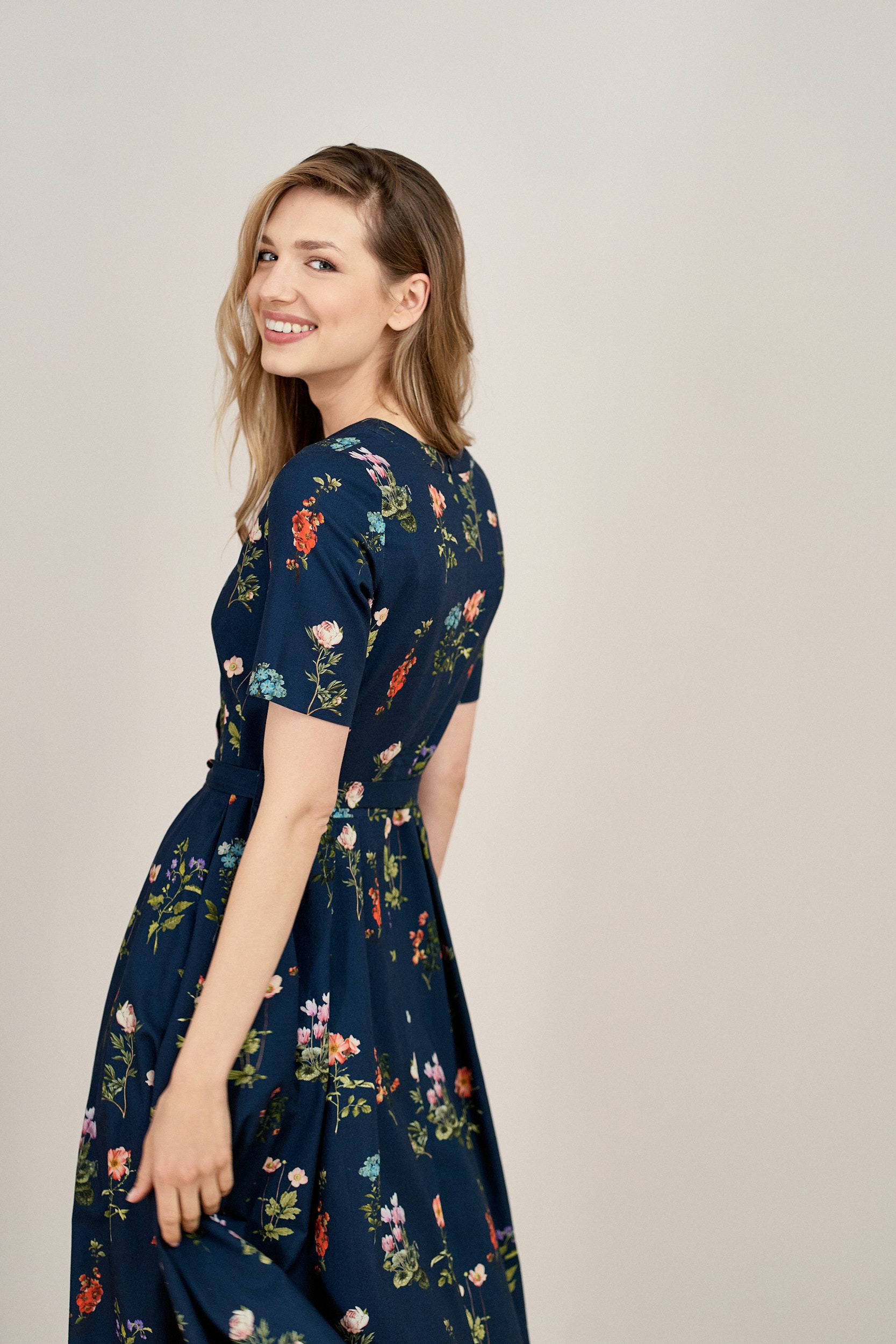 Alodia to rozkloszowana sukienka z zakładkami, rękawami 3/4, dekoltem w literę V, wykończona plisą z perłowymi guzikami, z dołączonym paskiem do wiązania w talii.