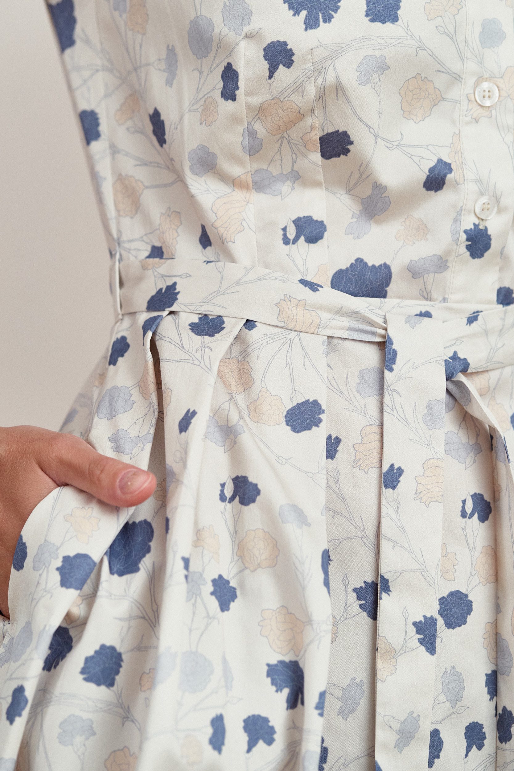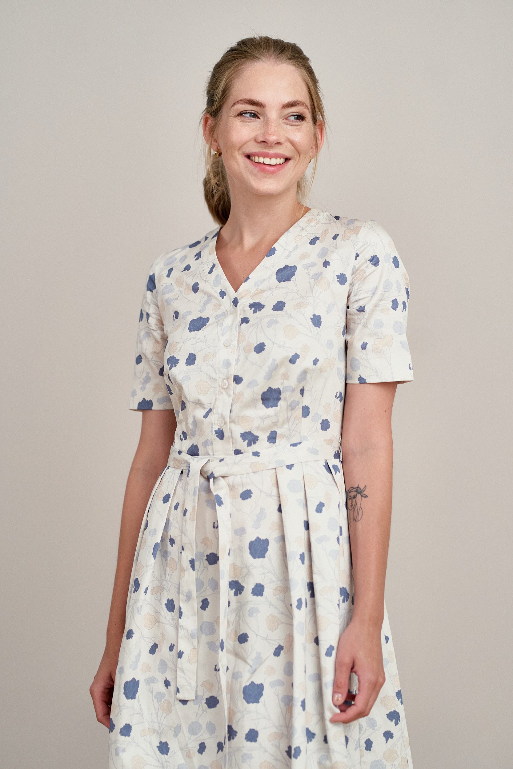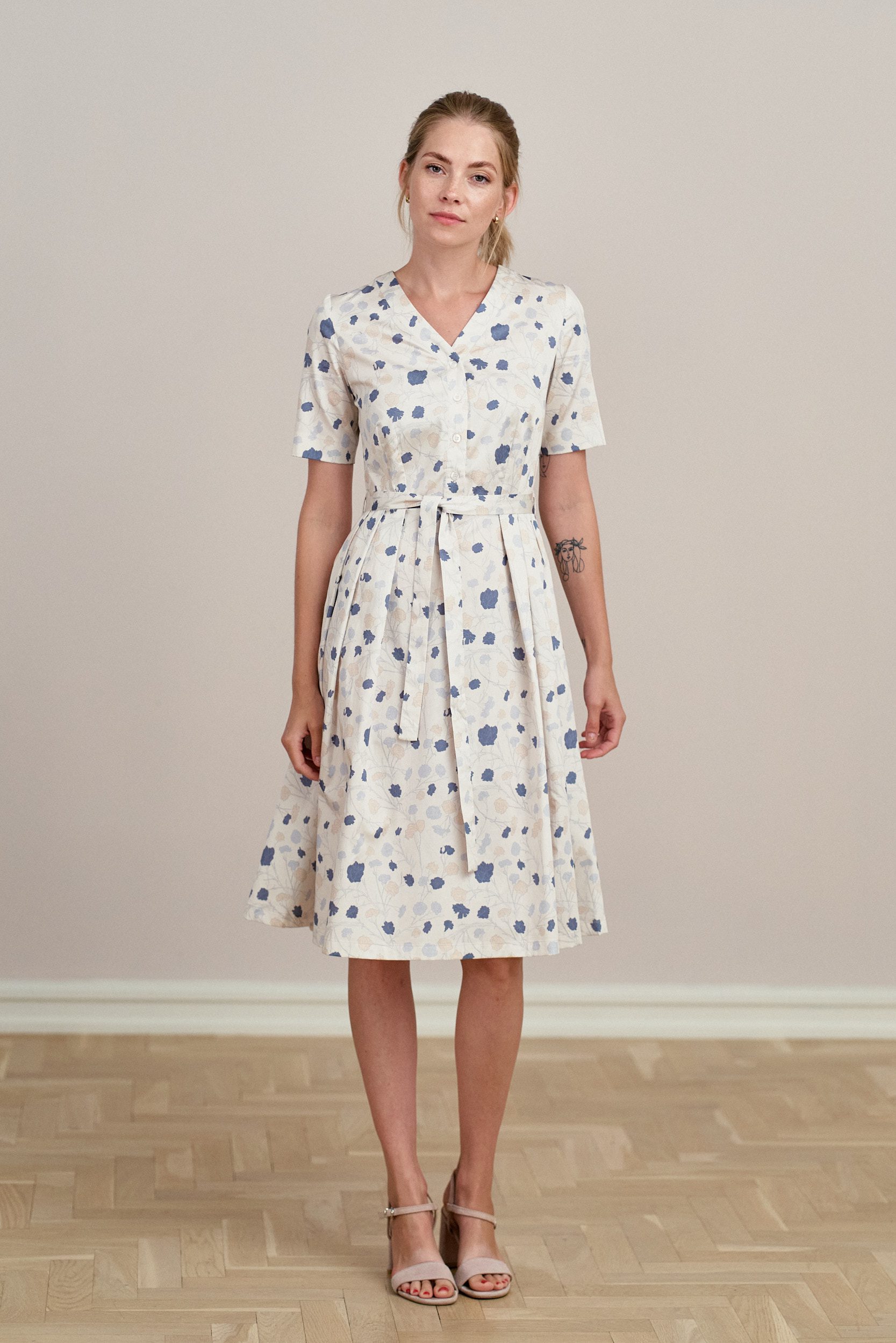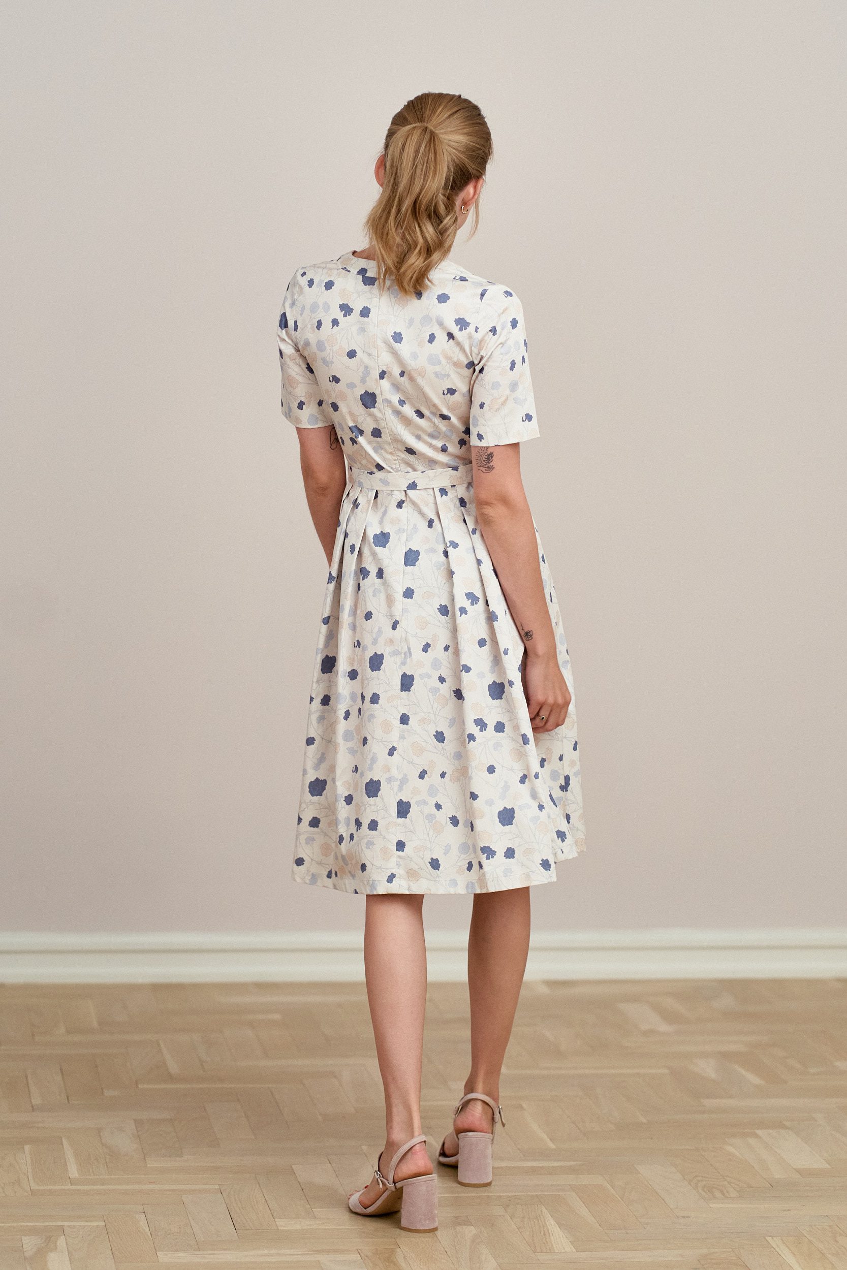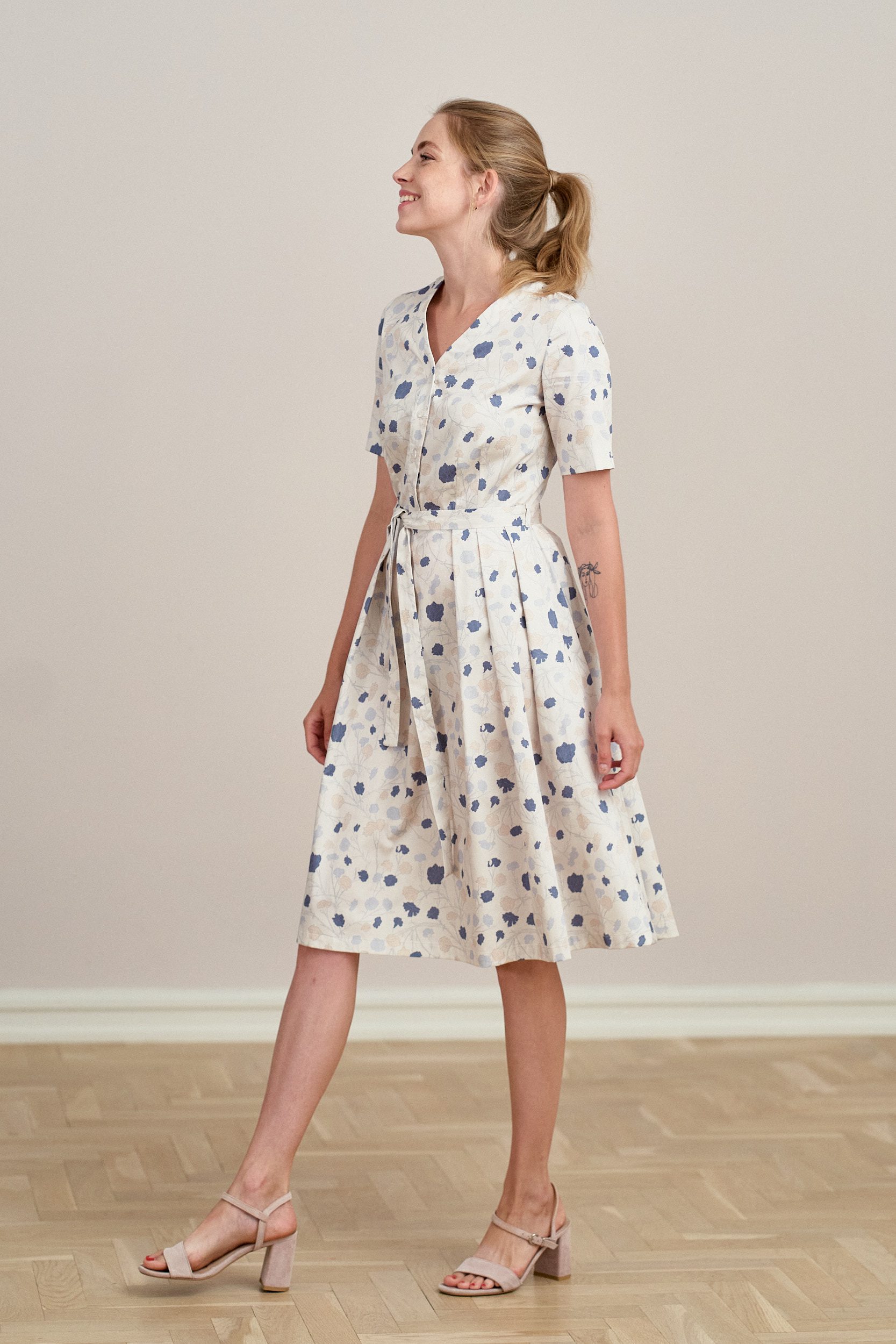 Alodia to rozkloszowana sukienka z zakładkami, krótkimi rękawami, dekoltem w literę V, wykończona plisą z perłowymi guzikami, z dołączonym paskiem do wiązania w talii.