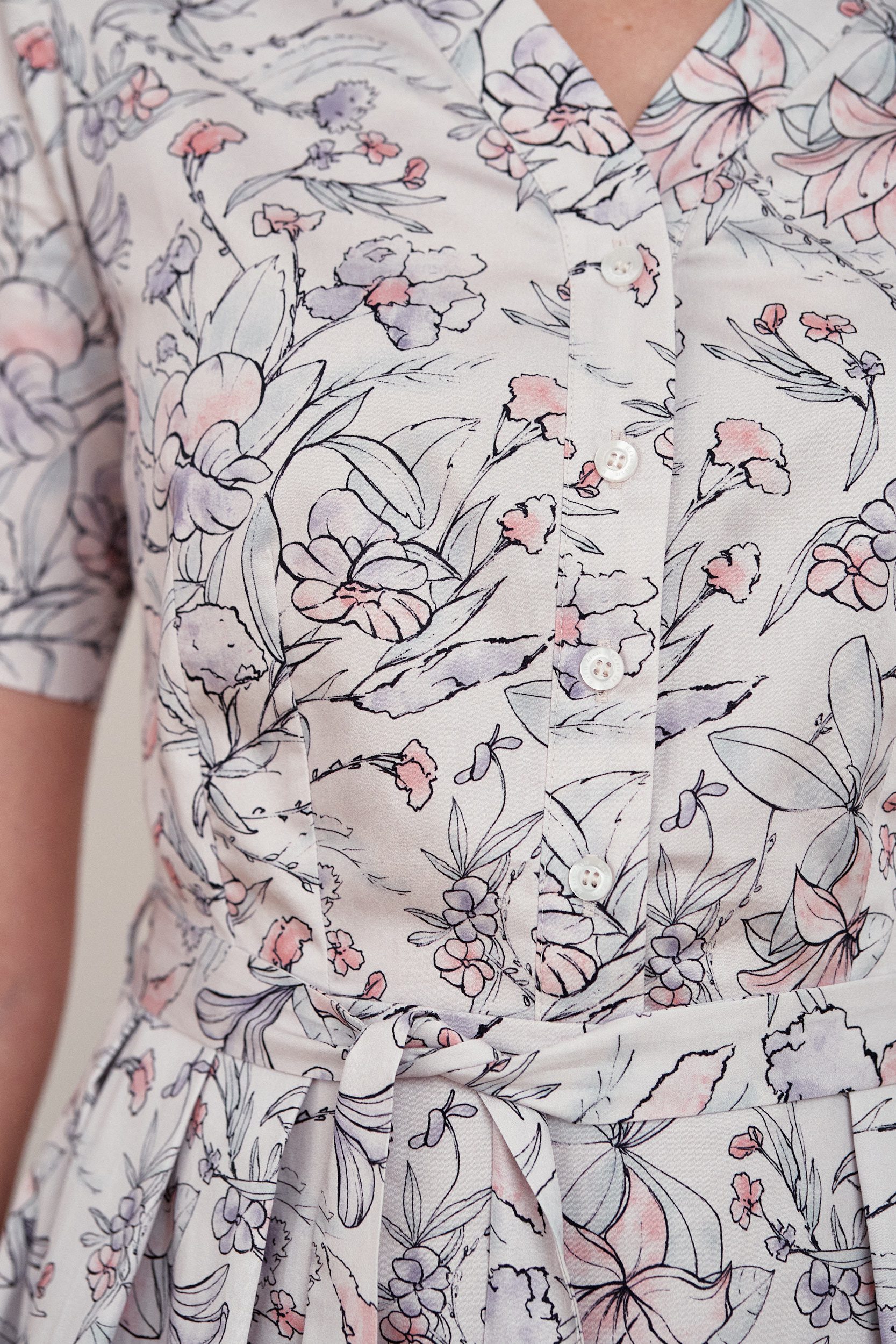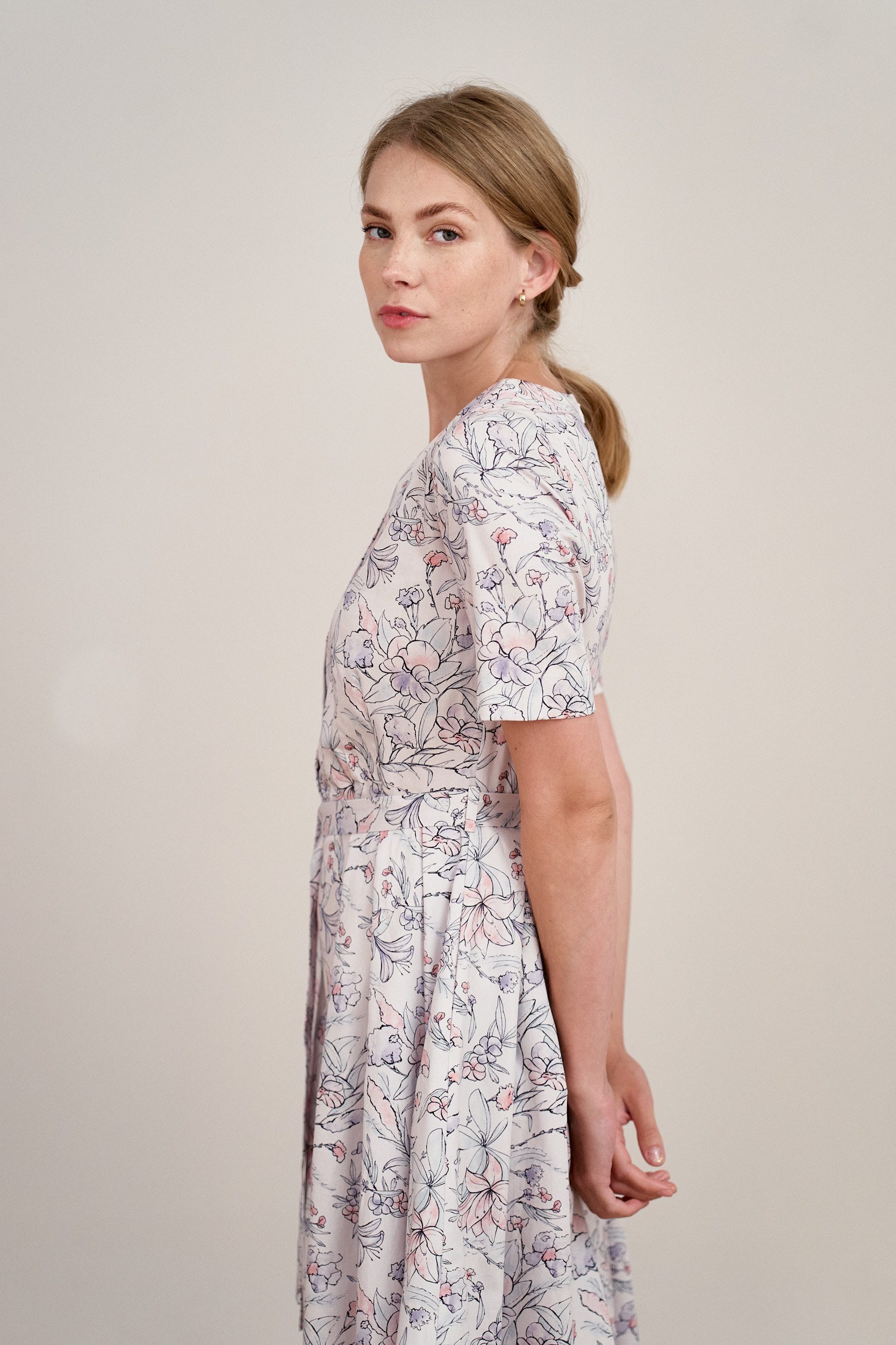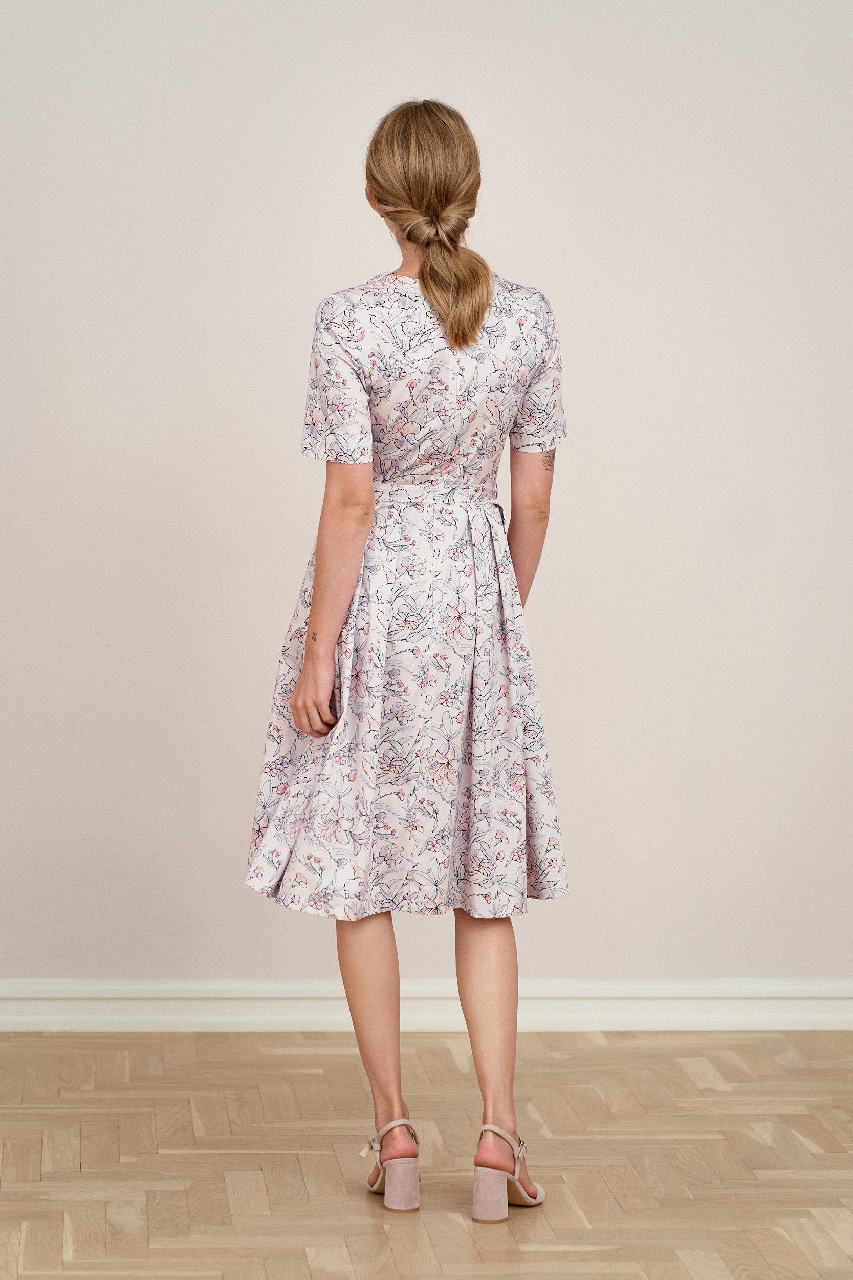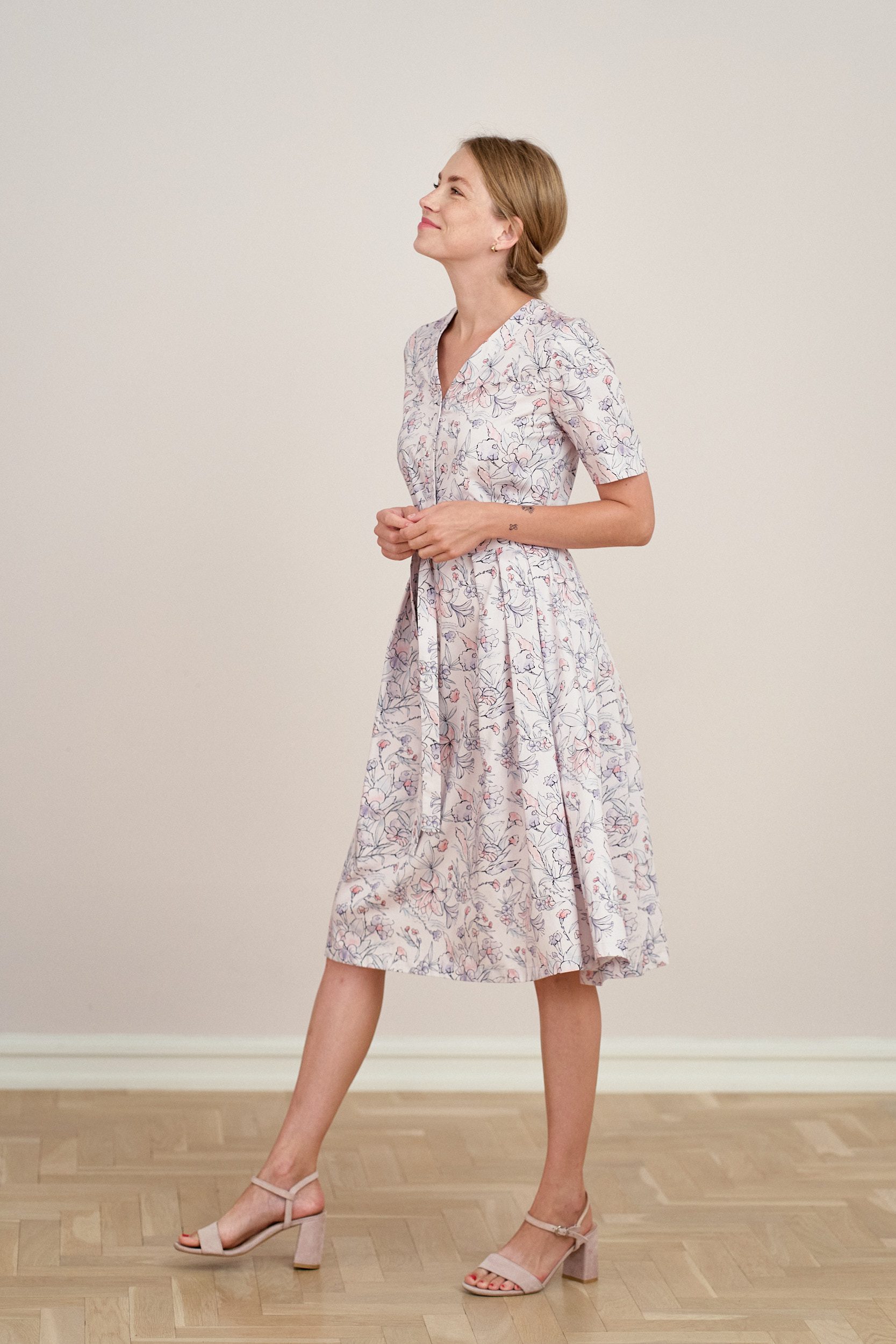 Alodia to rozkloszowana sukienka z zakładkami, krótkimi rękawami, dekoltem w literę V, wykończona plisą z perłowymi guzikami, z dołączonym paskiem do wiązania w talii.