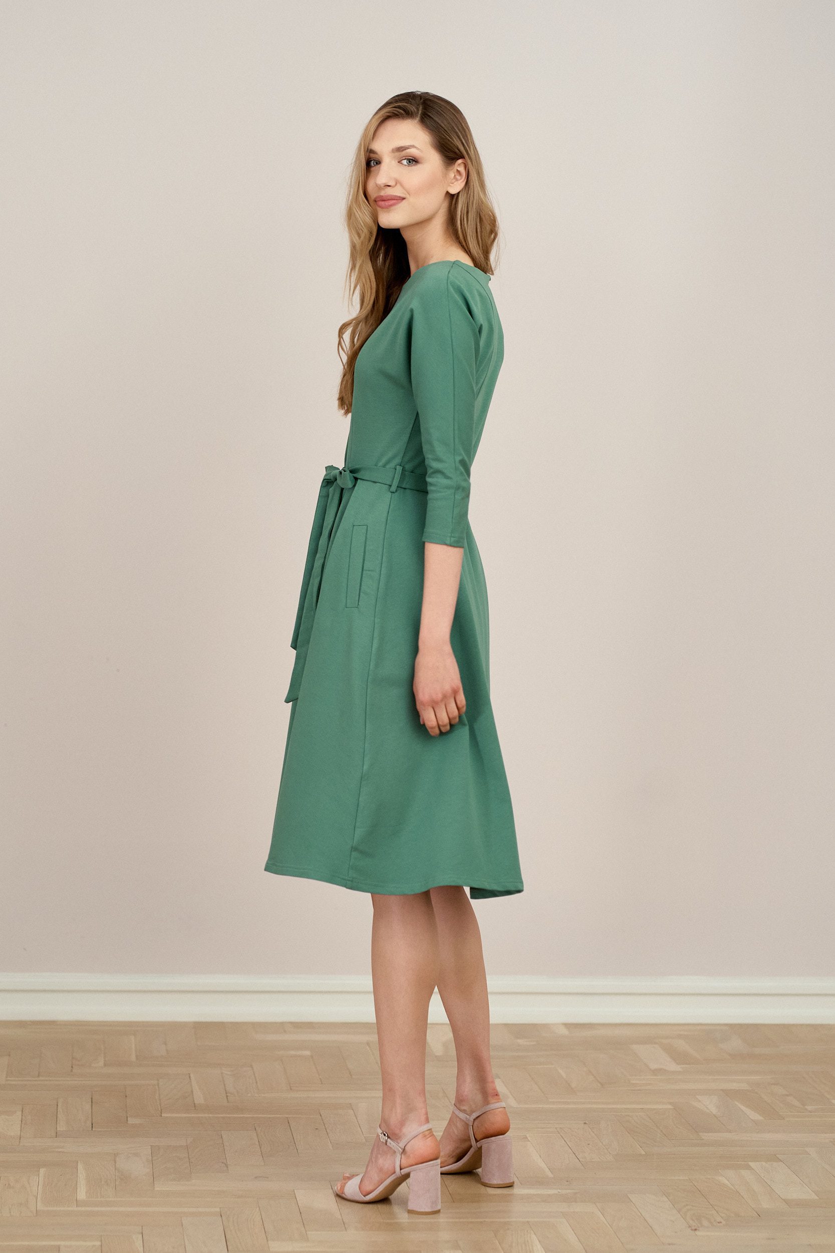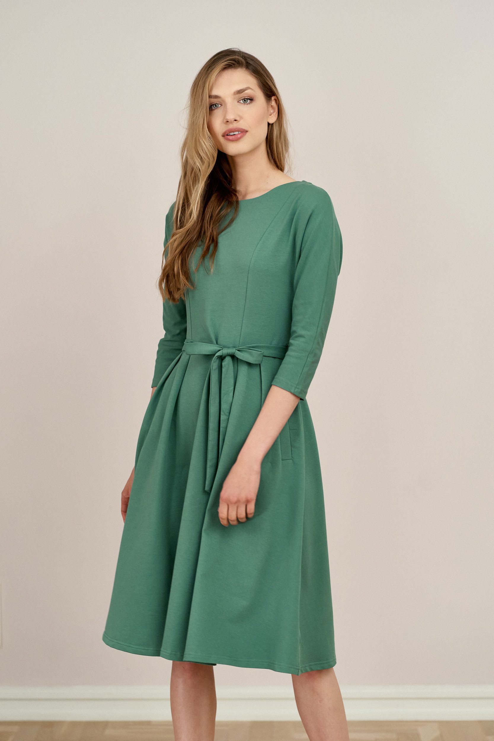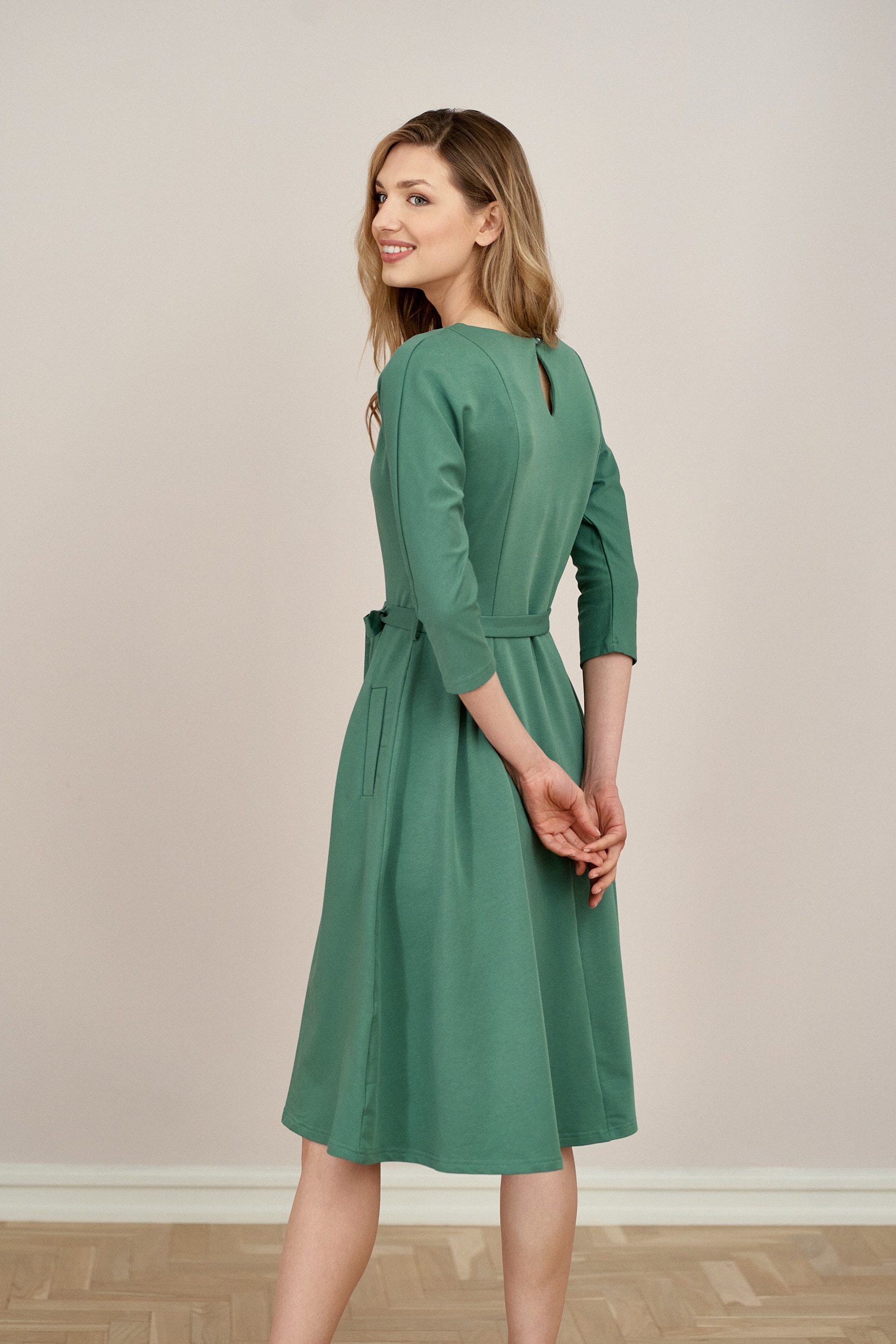 Anastazja to klasyczna sukienka dzianinowa z rękawem 3/4, dekoltem w łódkę i pionowymi cięciami z przodu i z tyłu. Na plecach sukienka ma ozdobne rozcięcie zakończane guzikiem. Dół jest rozkloszowany z zakładkami. Talię podkreśla paseczek dzianinowy, który umożliwia idealne dopasowanie sukienki do figury. Sukienka zaopatrzona jest w dwie kieszenie.