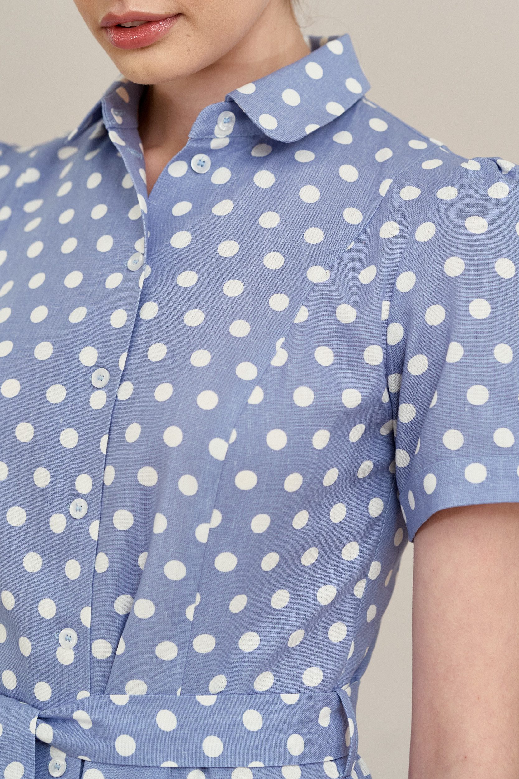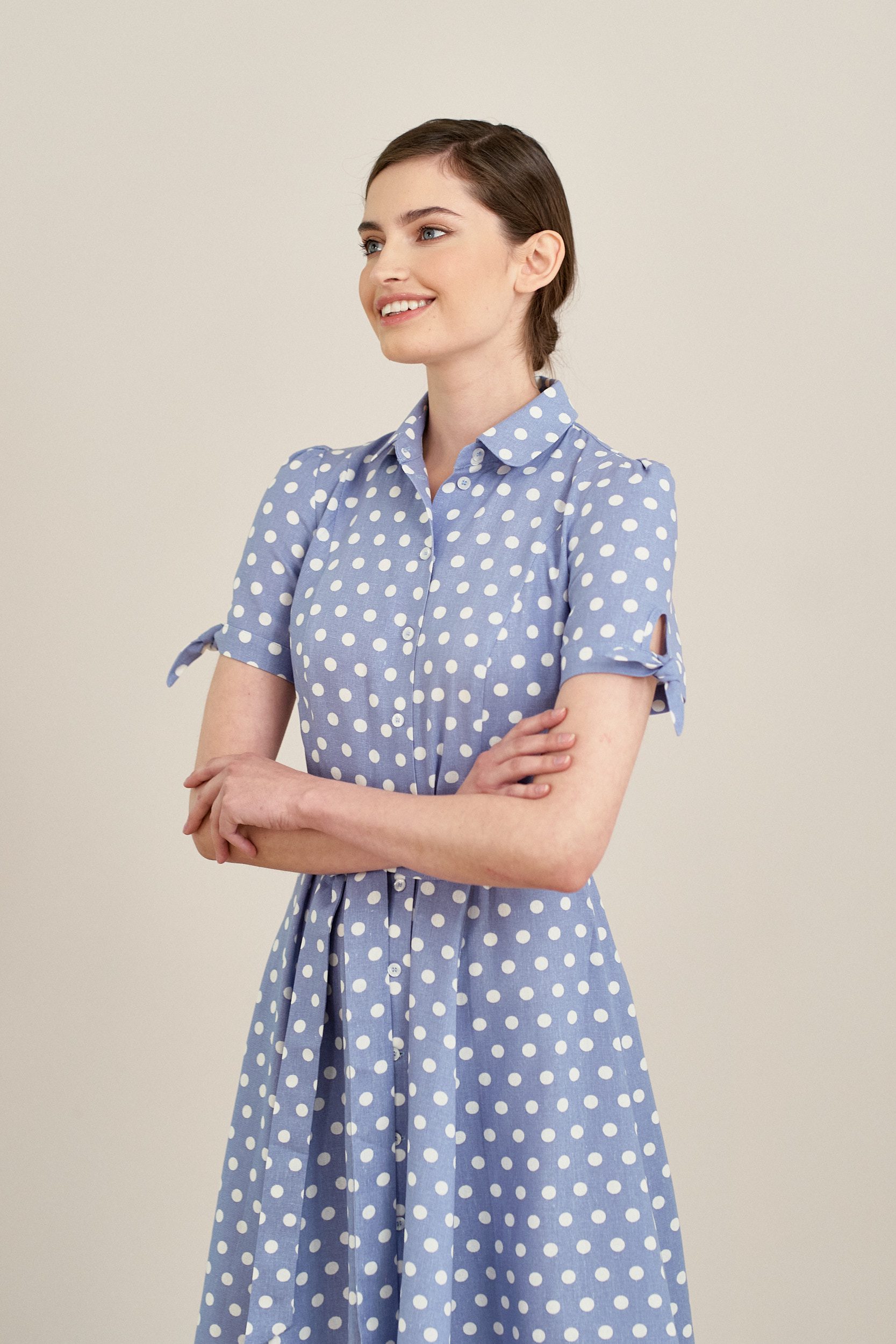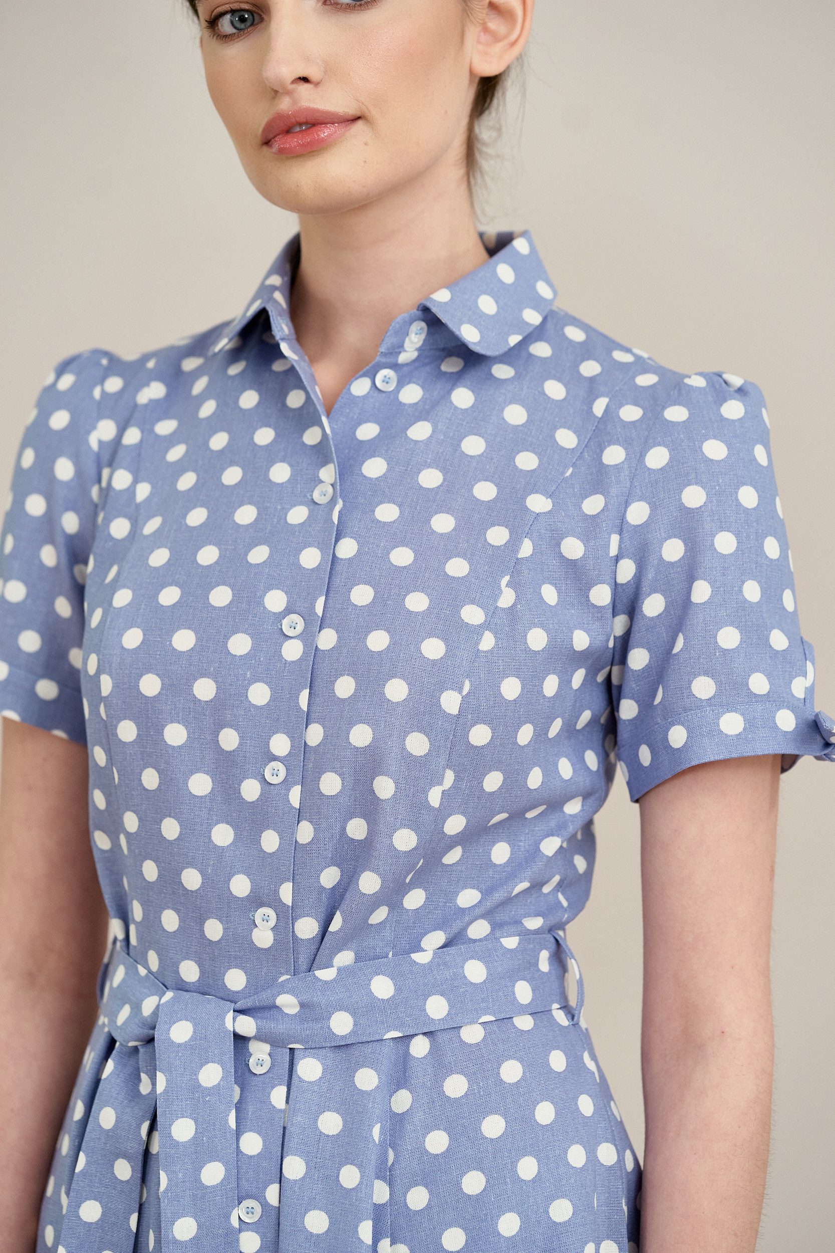 Ariana to zapinana na guziki szmizjerka z trapezowym dołem, z kołnierzykiem i krótkim rękawem wykończonym ozdobnym wiązaniem.