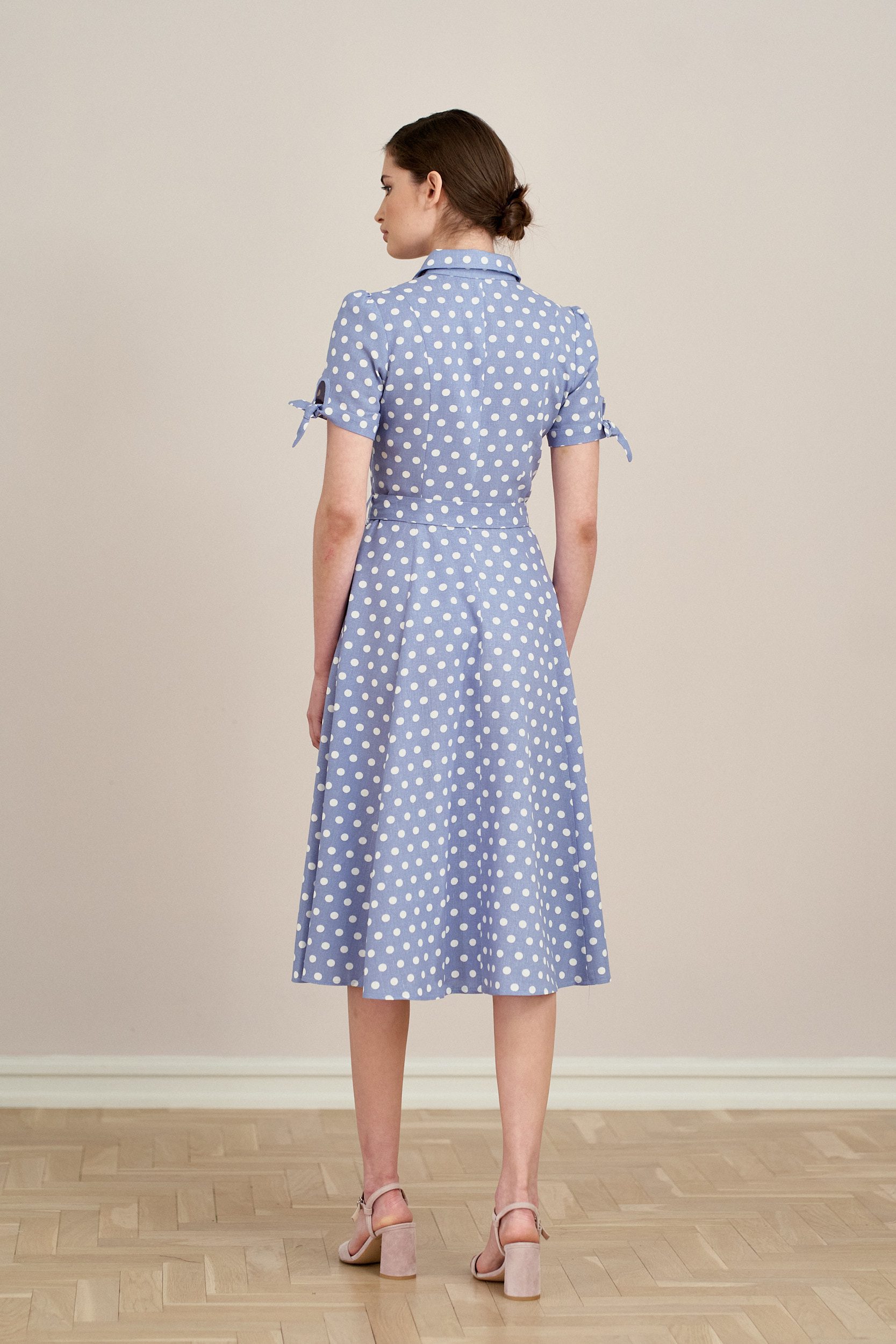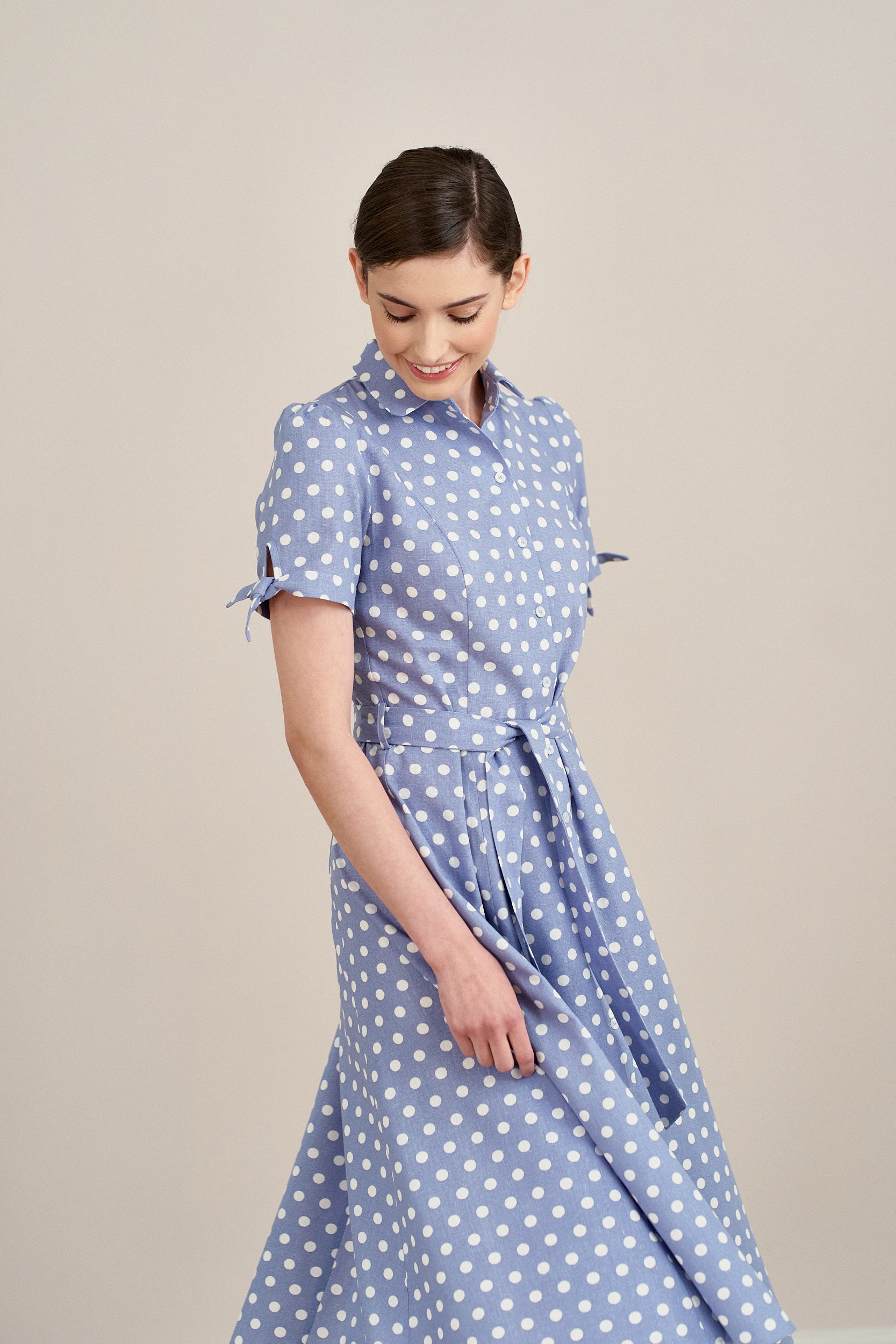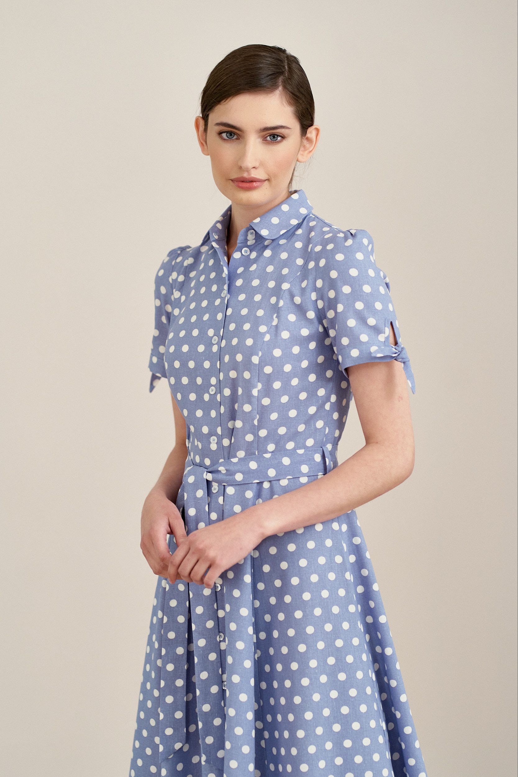 Ariana to zapinana na guziki szmizjerka z trapezowym dołem, z kołnierzykiem i krótkim rękawem wykończonym ozdobnym wiązaniem.