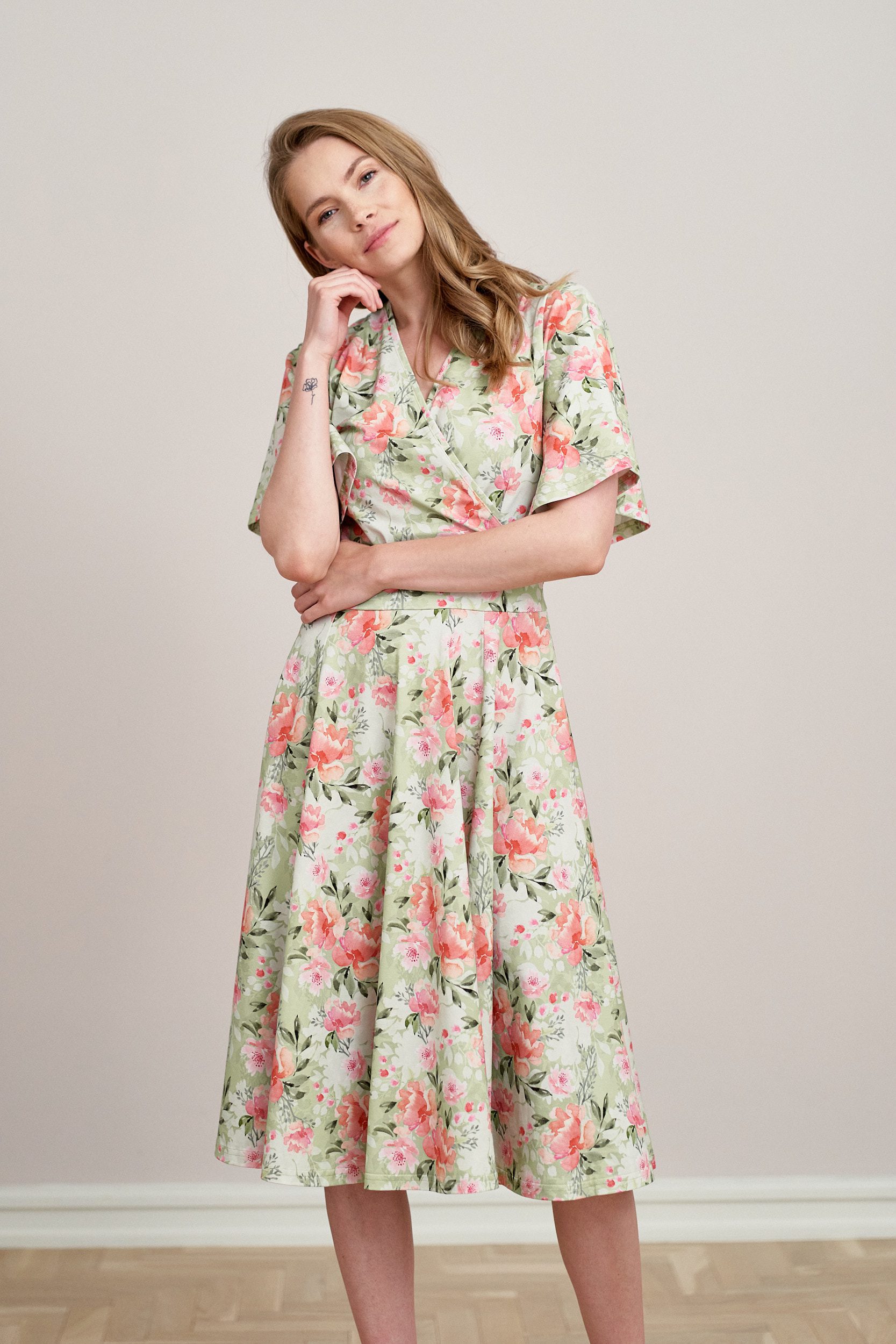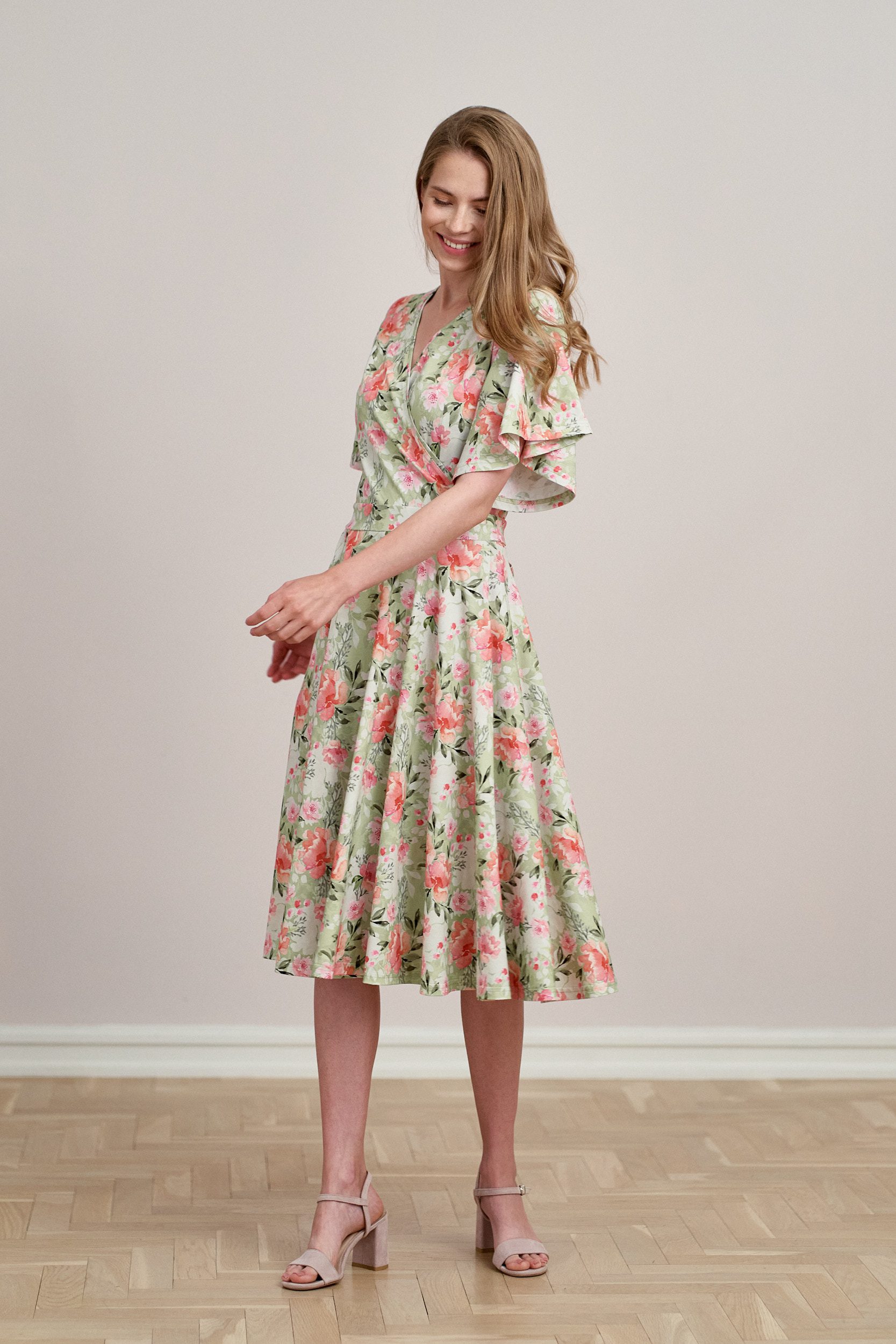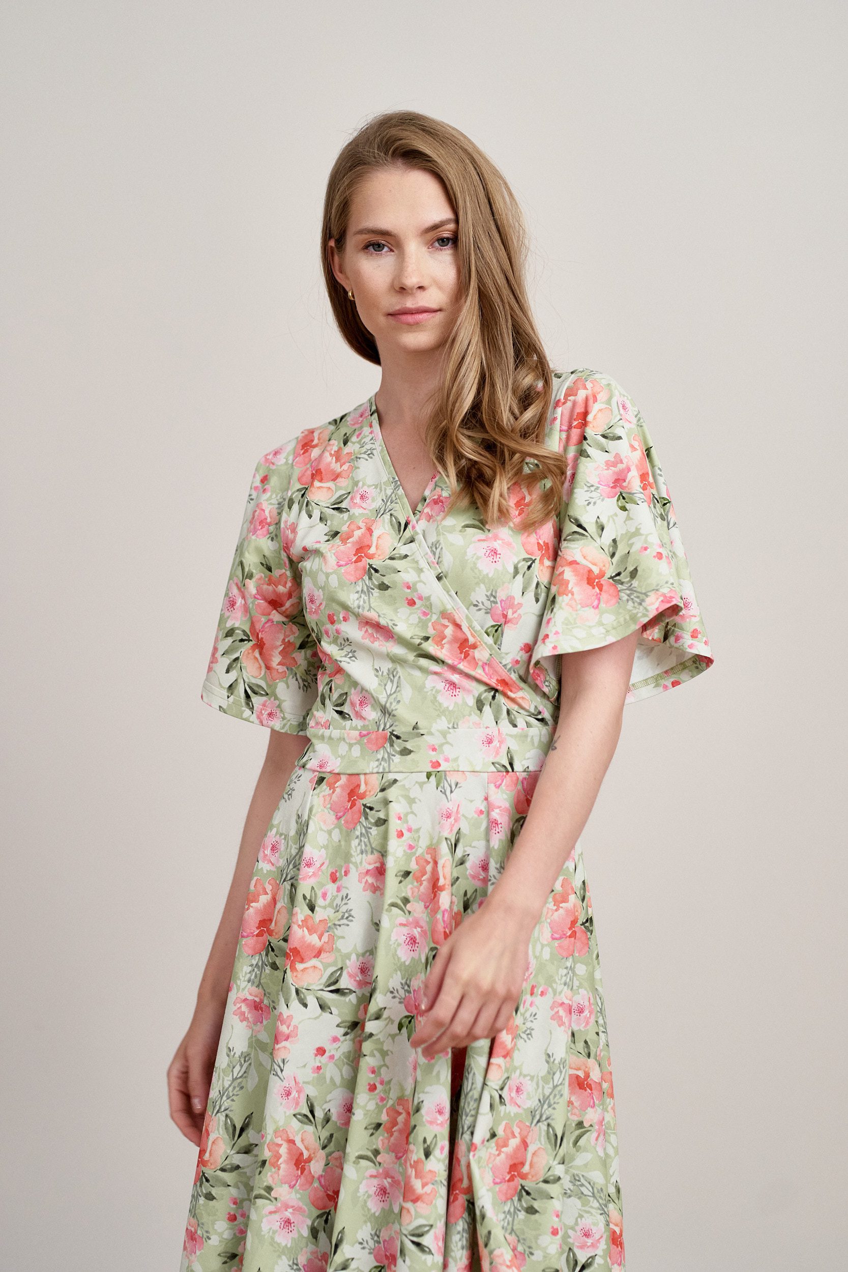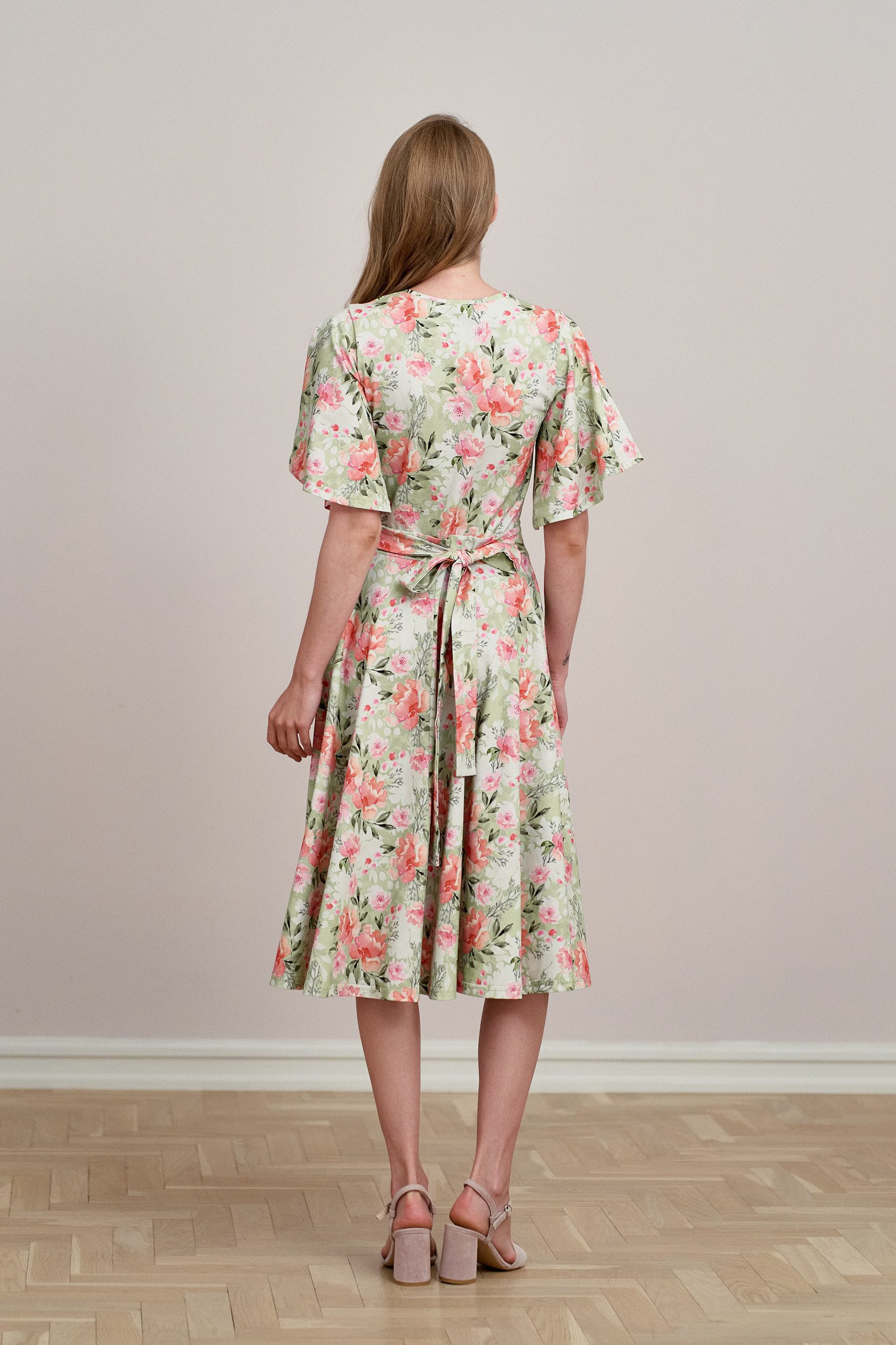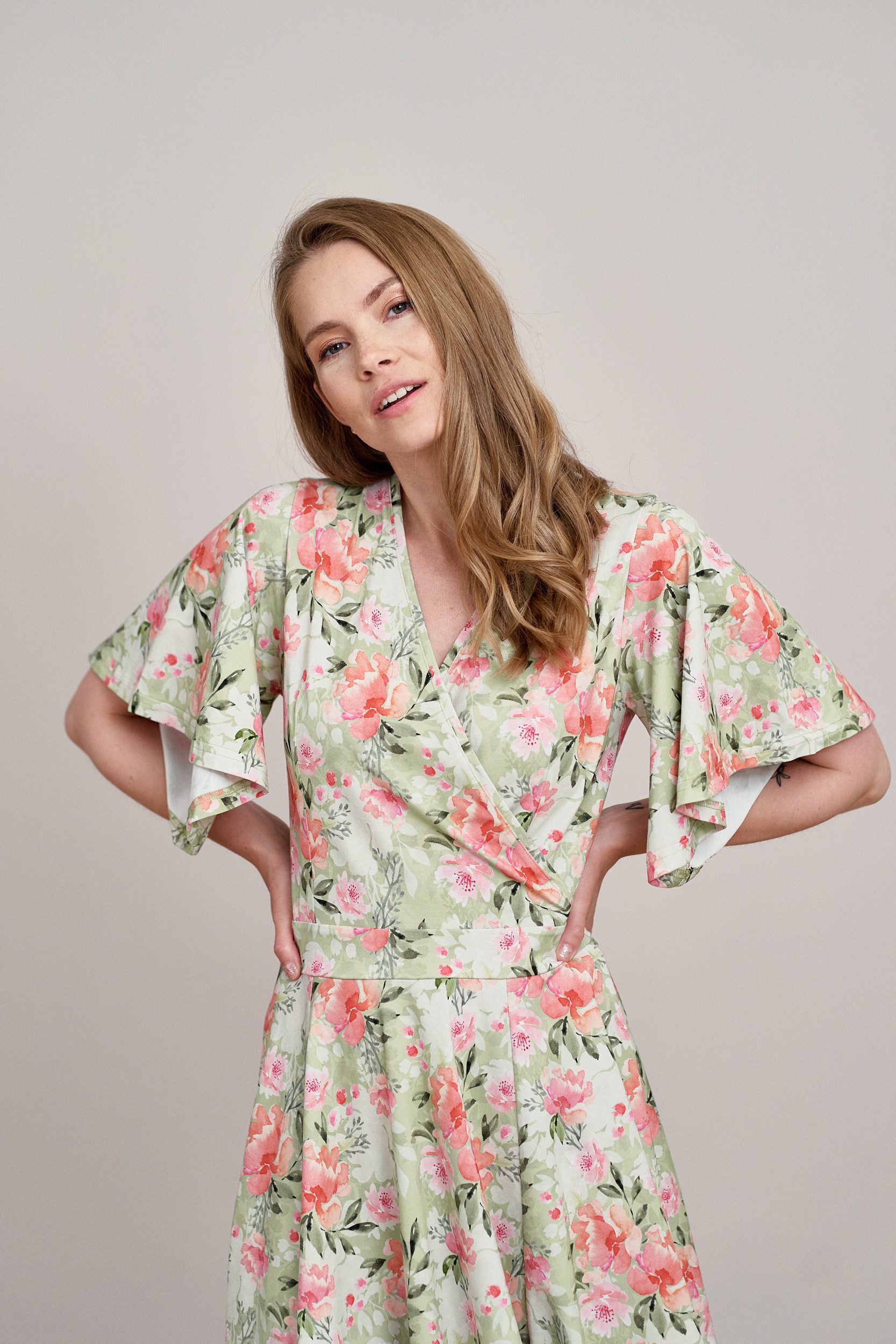 Eudora to dzianinowa sukienka o kopertowym dekolcie i lekko marszczonym dole z klosza. Uroku dodają jej zwiewne, motylkowe rękawy oraz wiązanie w pasie. Dzięki doszytej szarfie bez problemu dopasujesz ją do swojej talii!