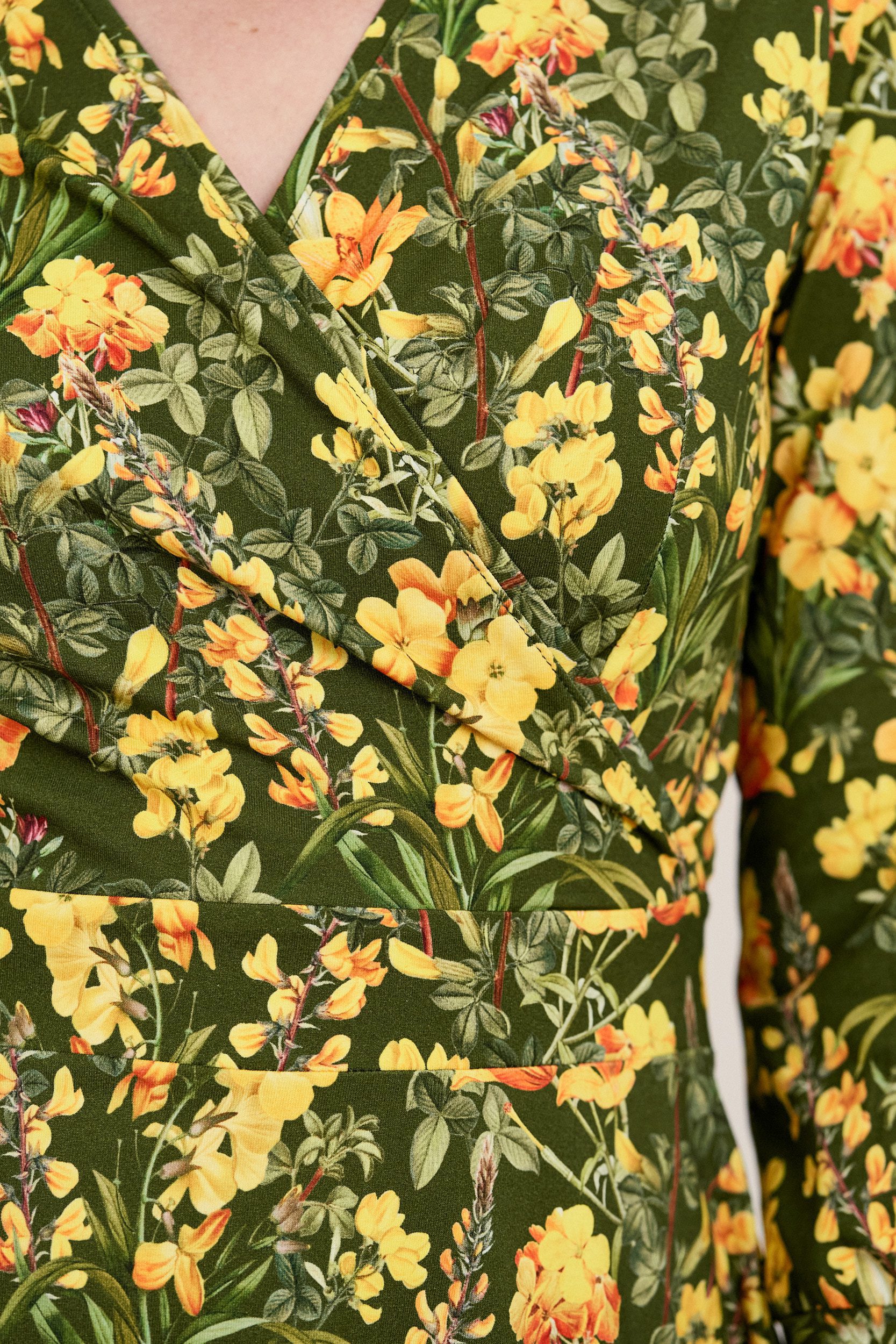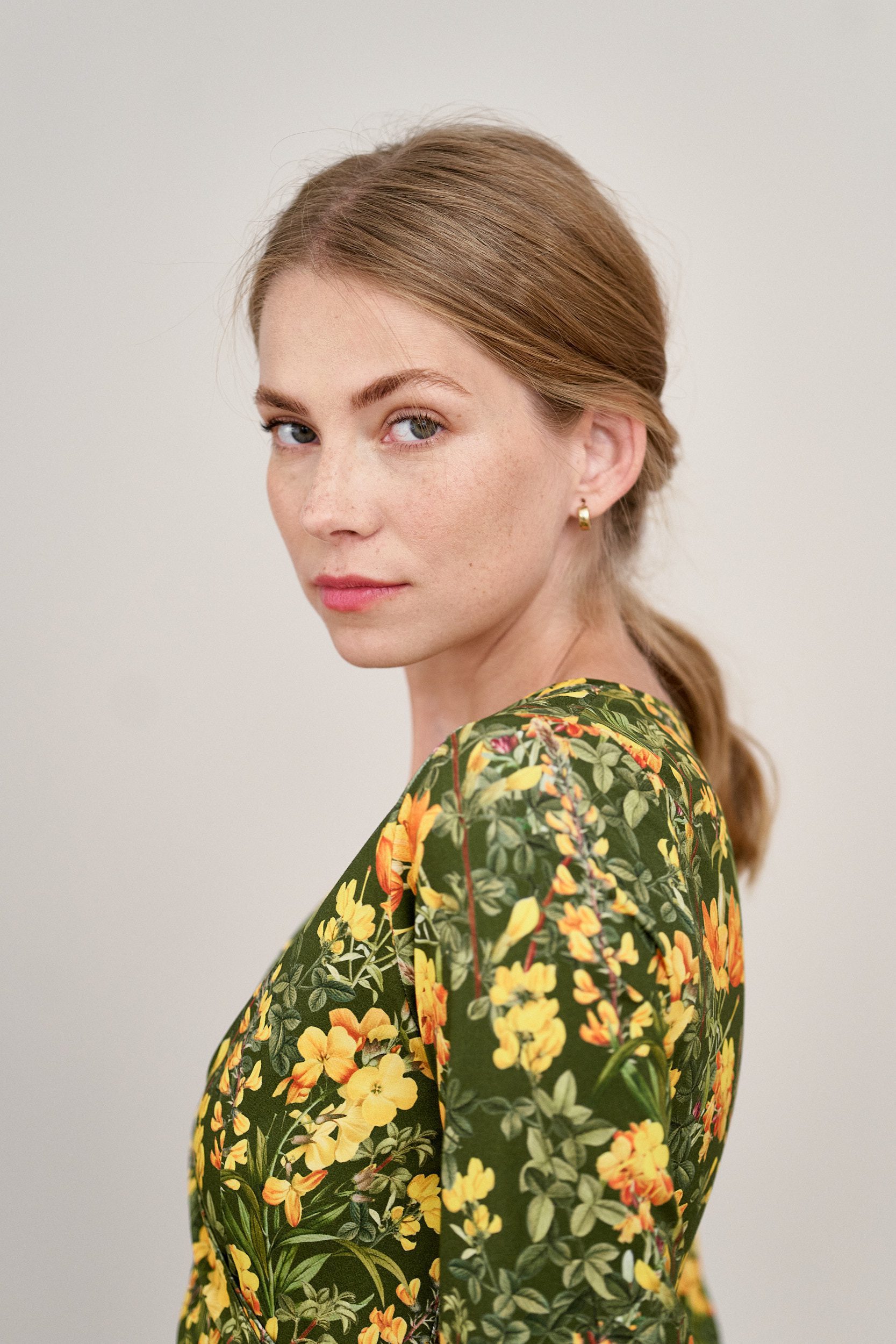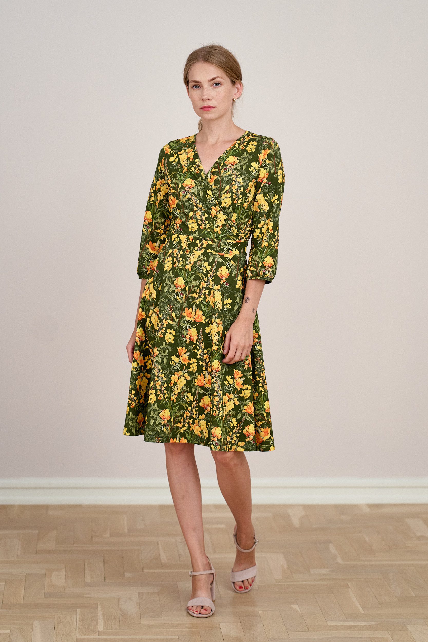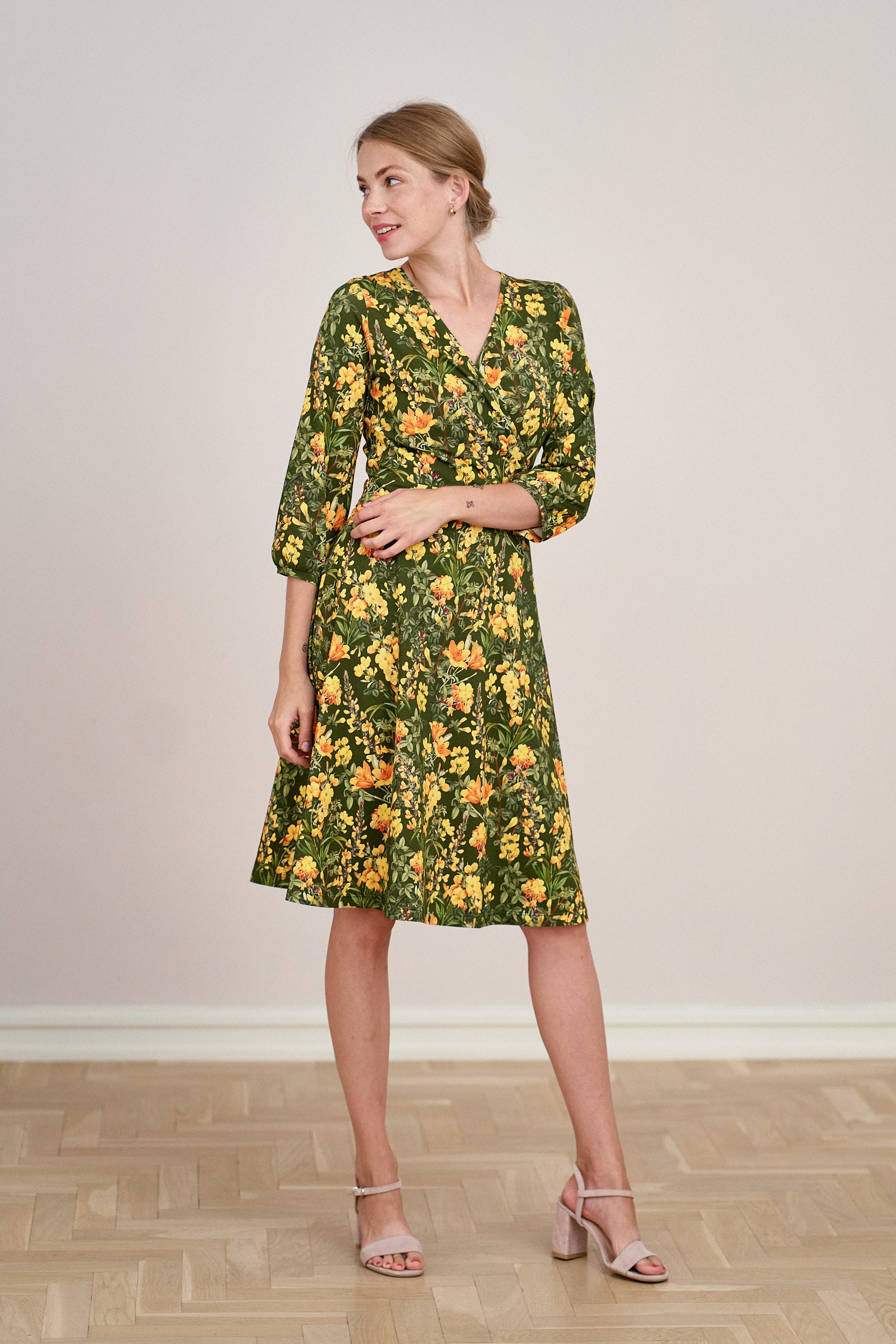 Hermia – dzianinowa sukienka o kopertowym dekolcie i lekko marszczonym dole z klosza. Ma rękawki o długości 3/4 z delikatną bufką i marszczeniem przy ramieniu. Dzięki doszytej szarfie idealnie dopasujesz ją do swojej talii!