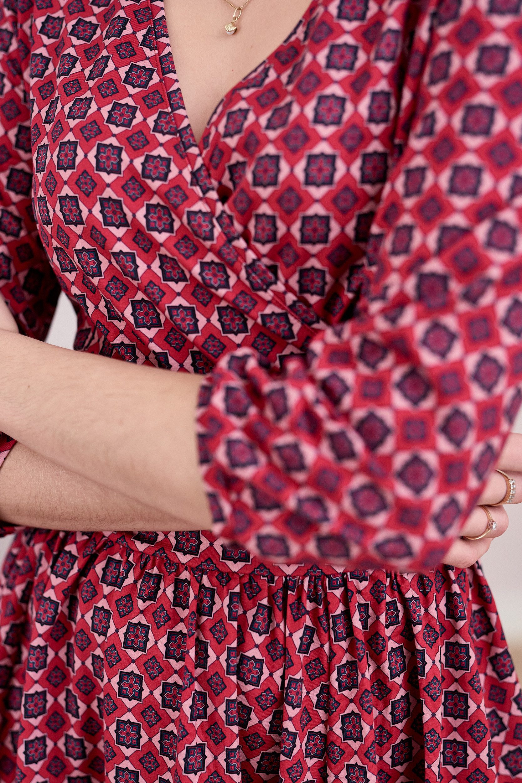 Larissa to dzianinowa sukienka o kopertowym dekolcie i rozkloszowanym, marszczonym dole z klosza. Ma rękawki o długości 3/4 z delikatną bufką i marszczeniem przy ramieniu. Talię podkreśla wszyty pas oddzielający dolną partię sukienki. Długość za kolano dodaje elegancji i pewności siebie. Pięknie się układa, faluje wokół sylwetki i wysmukla ją. To bardzo kobiecy krój, w którym z pewnością poczujesz się wyjątkowo.
