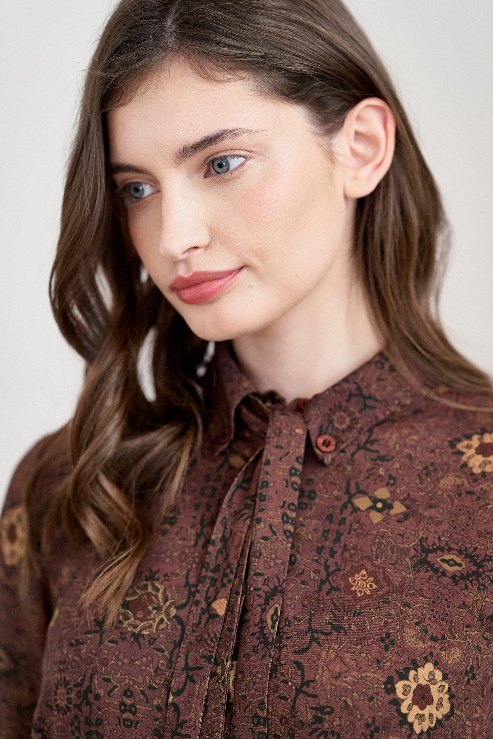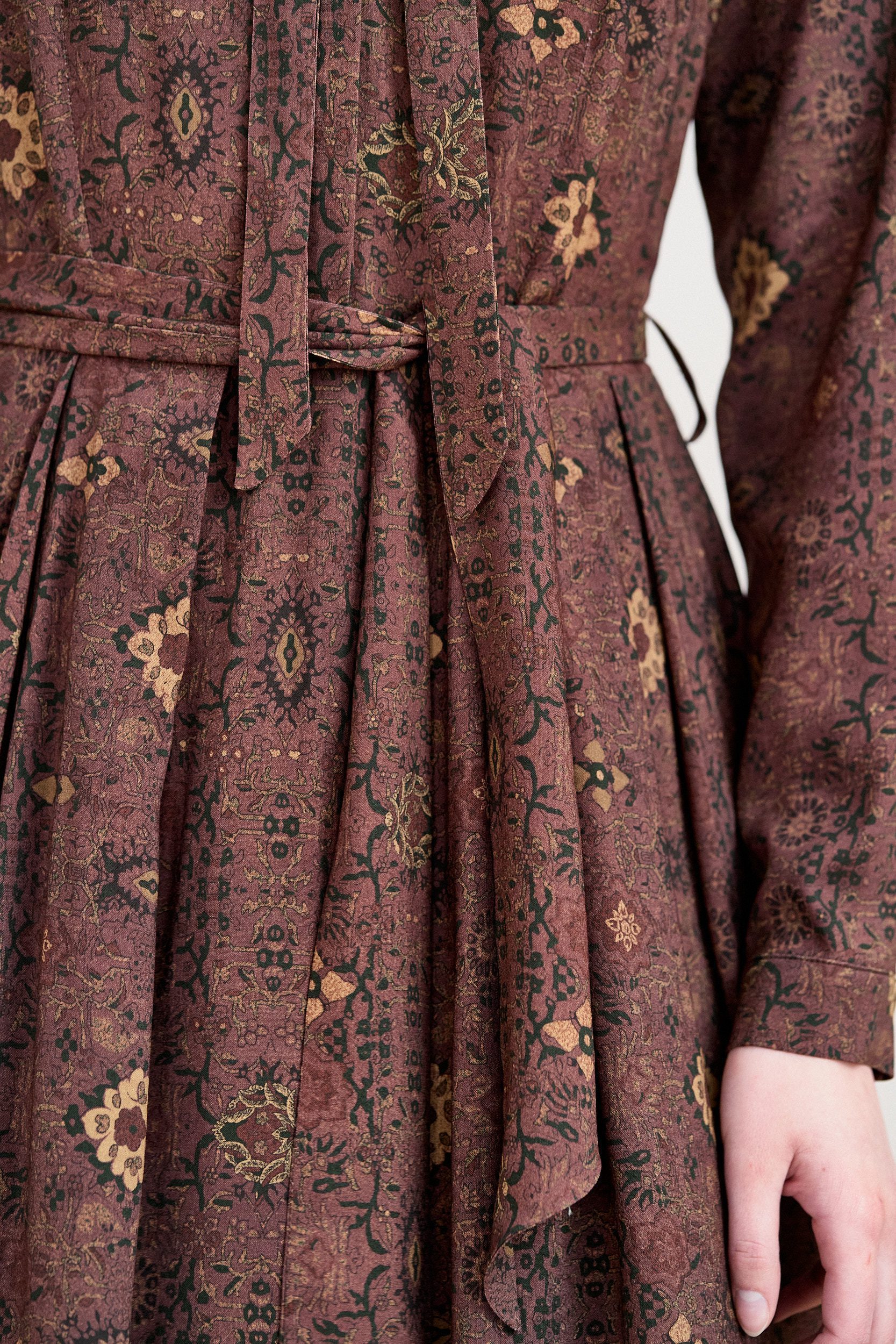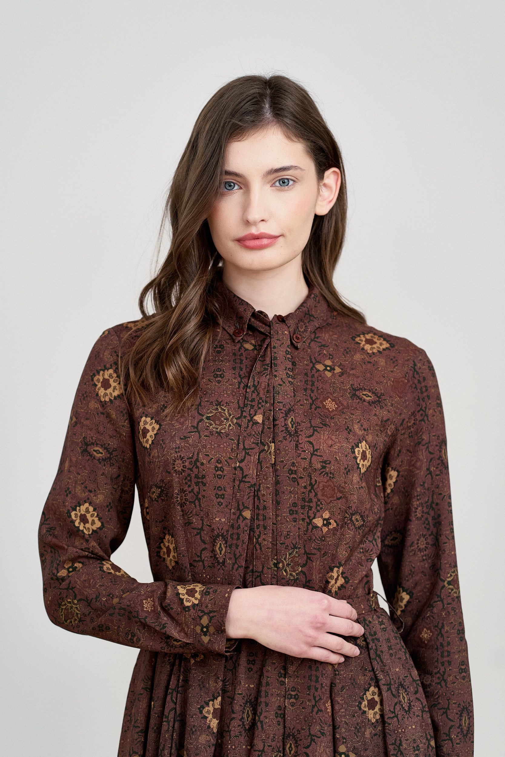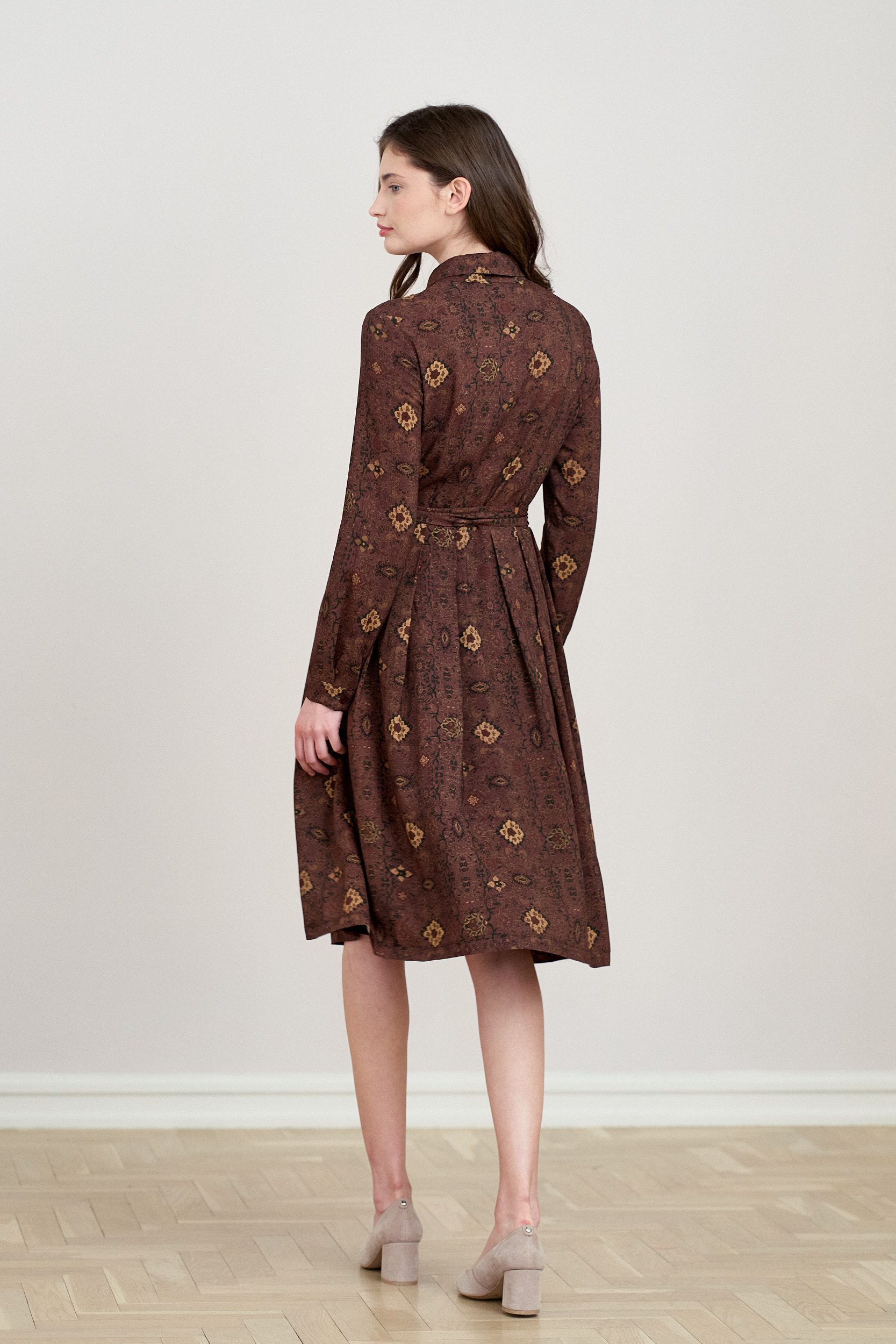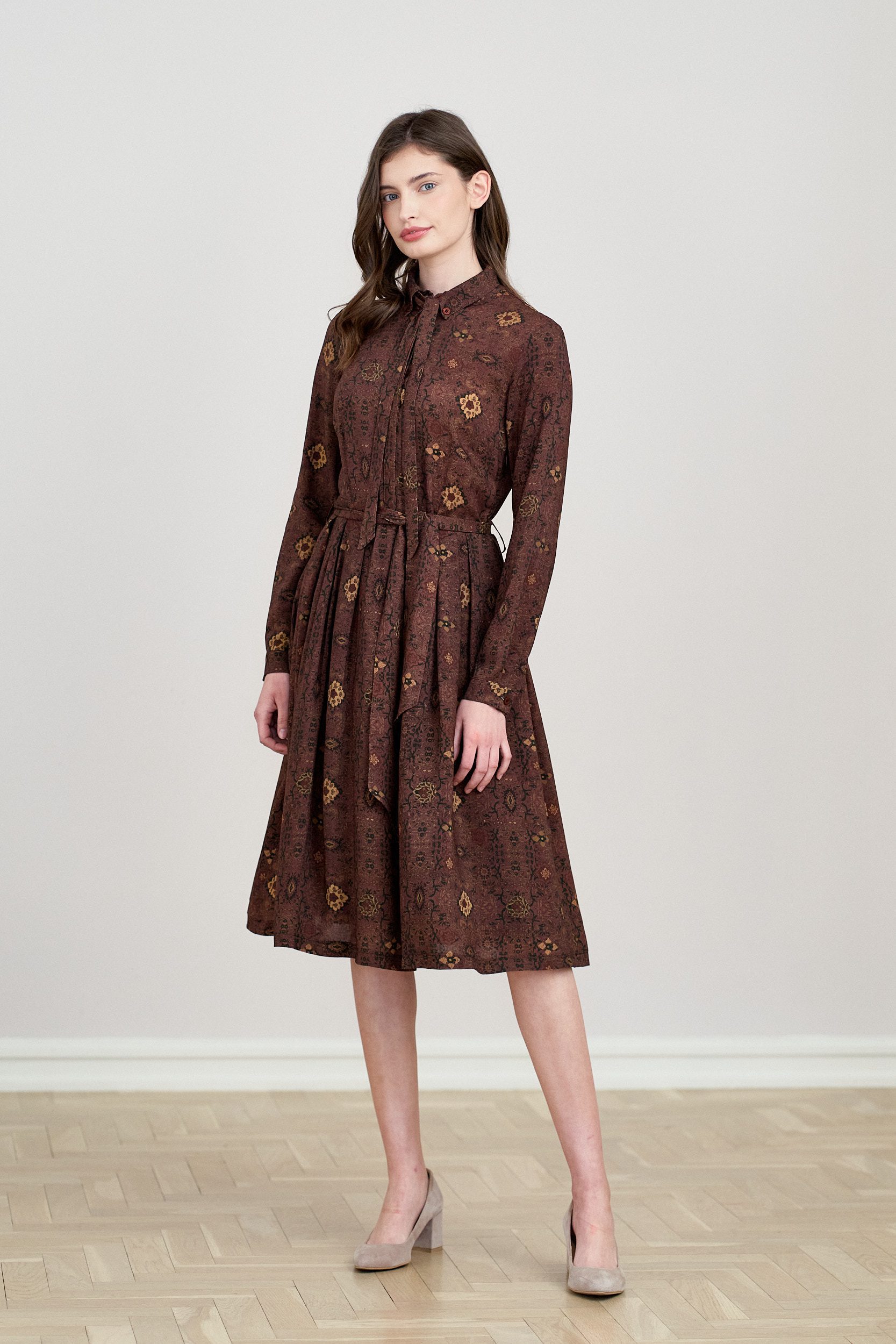 Rozkloszowana sukienka z zakładkami, długimi rękawami zapinanymi na guziczek, kołnierzykiem, zapinana na guziki z wykończeniem krytą plisą, z dołączonym paskiem do wiązania przy kołnierzyku, z kwiatowym wzorem. Sukienka uszyta z tkaniny wiskozowej, podszewka na całej długości.