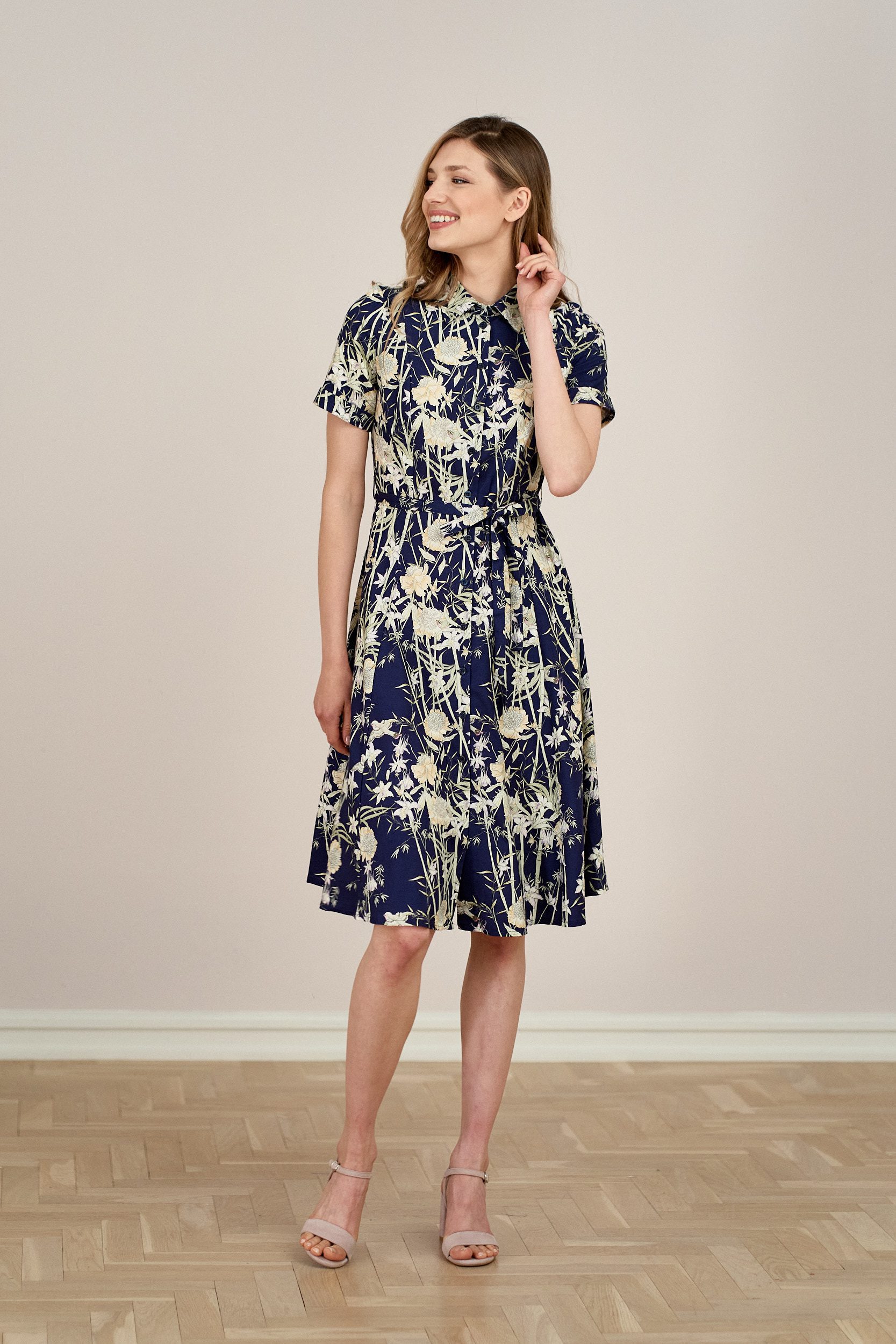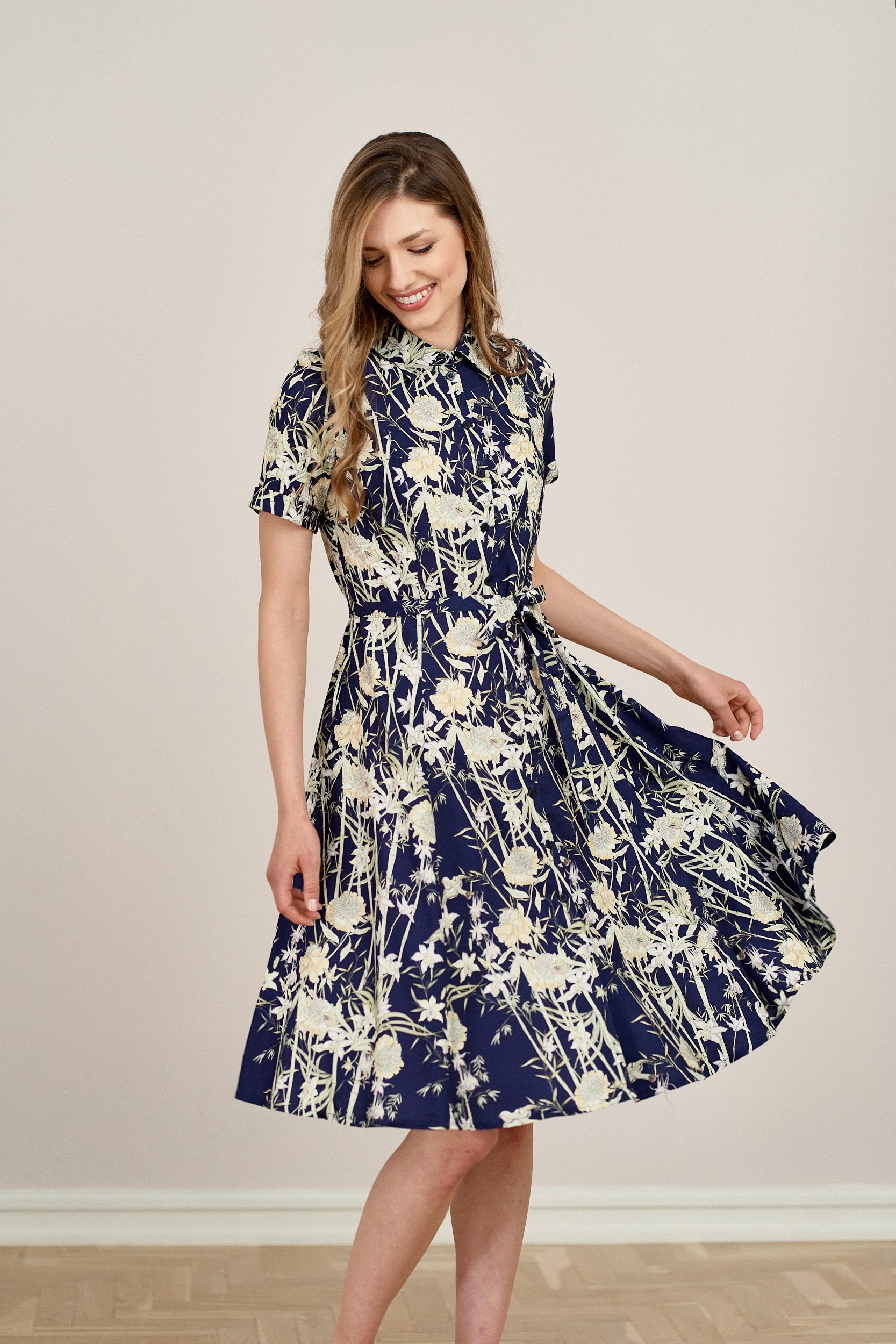Marina to rozkloszowana szmizjerka zapinana na guziczki, z rękawem 3/4 i kołnierzykiem. Uszyta jest z przewiewnej, idealnej na lato mieszanki bawełny i wiskozy, która lekko się układa i ładnie opływa ciało. Do sukienki dołączony jest wąski paseczek materiałowy. Sukienka posiada dwie boczne kieszenie oraz dwie mniejsze na przodzie. Rozpinane guziczki umożliwią dyskretne karmienie.