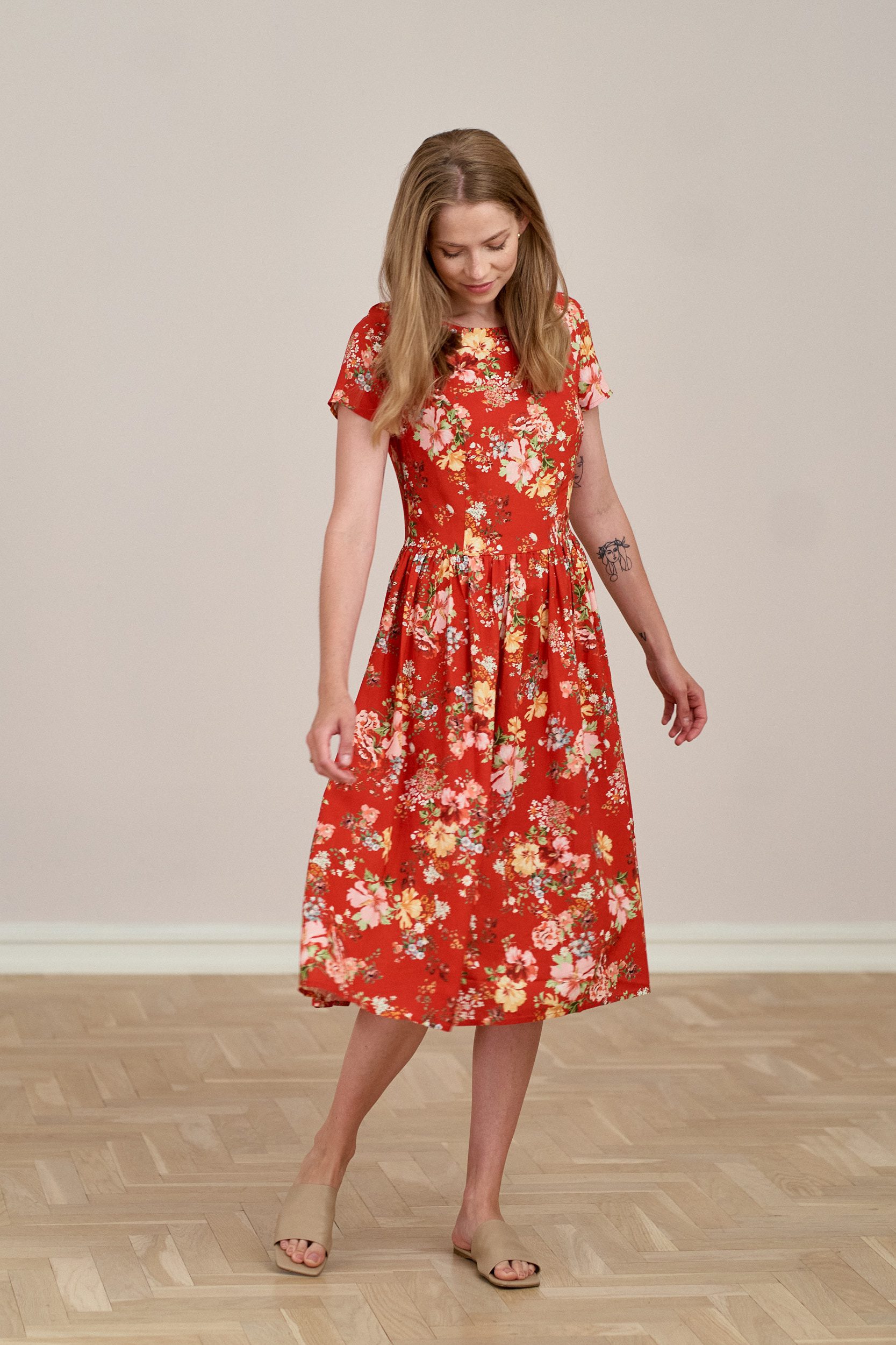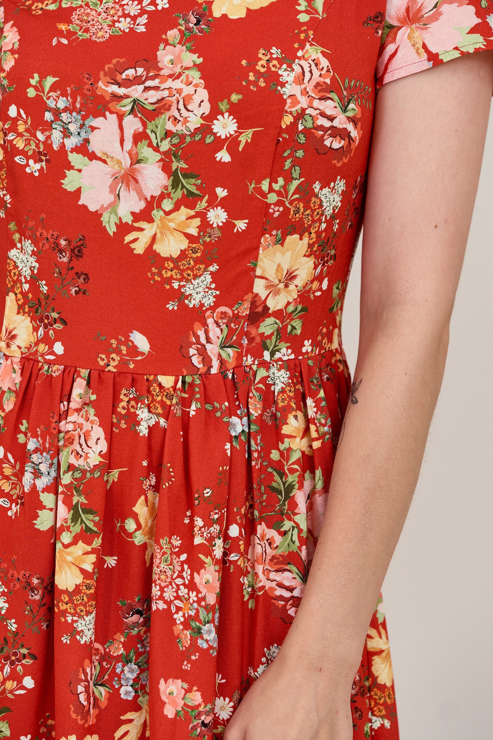 Sukienka uszyta jest z tkaniny wiskozowo-lnianej – dzięki temu łączy w sobie atuty i wiskozy, i lnu. Przepuszcza powietrze, jest higroskopijna, antyalergiczna i miękko się układa.