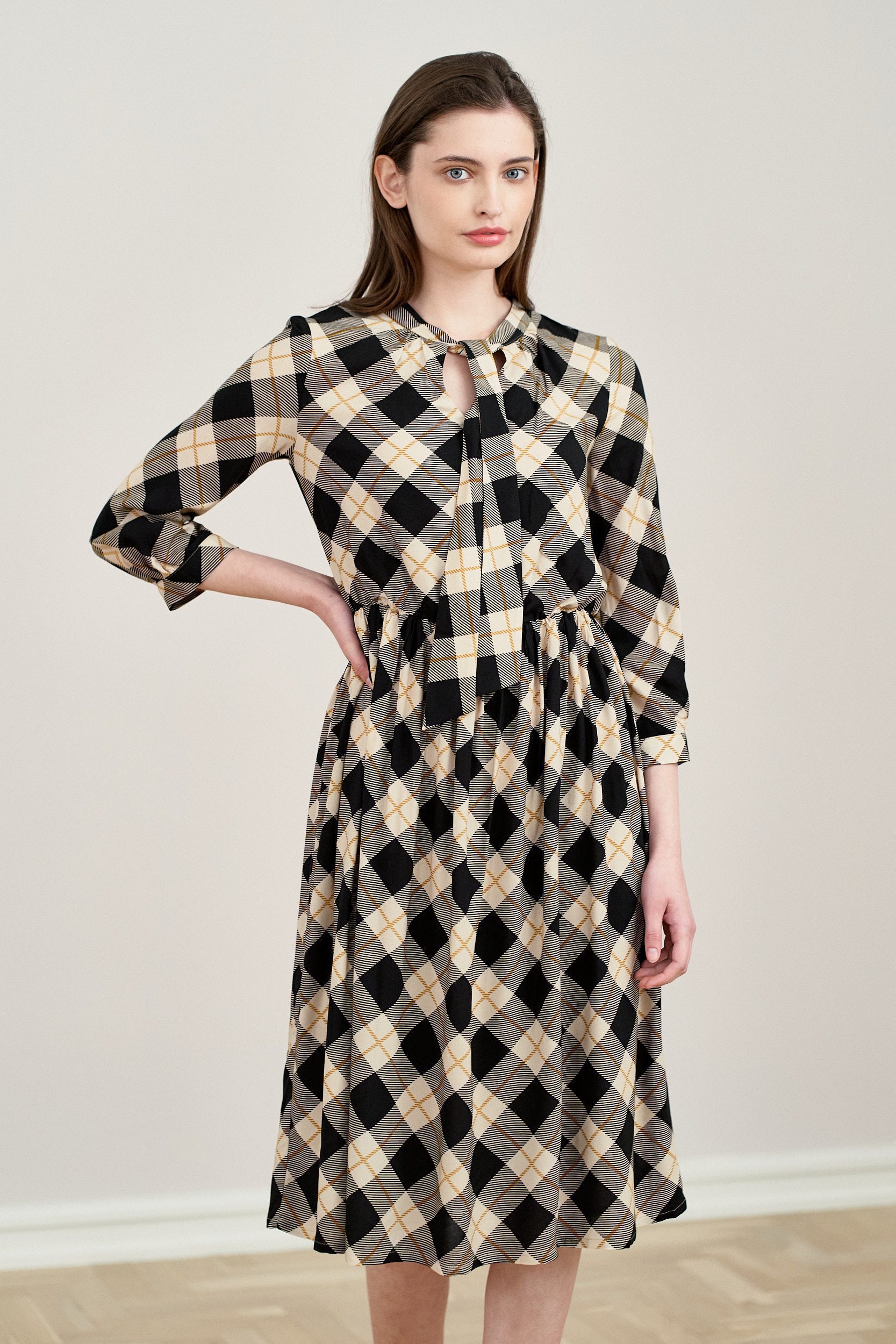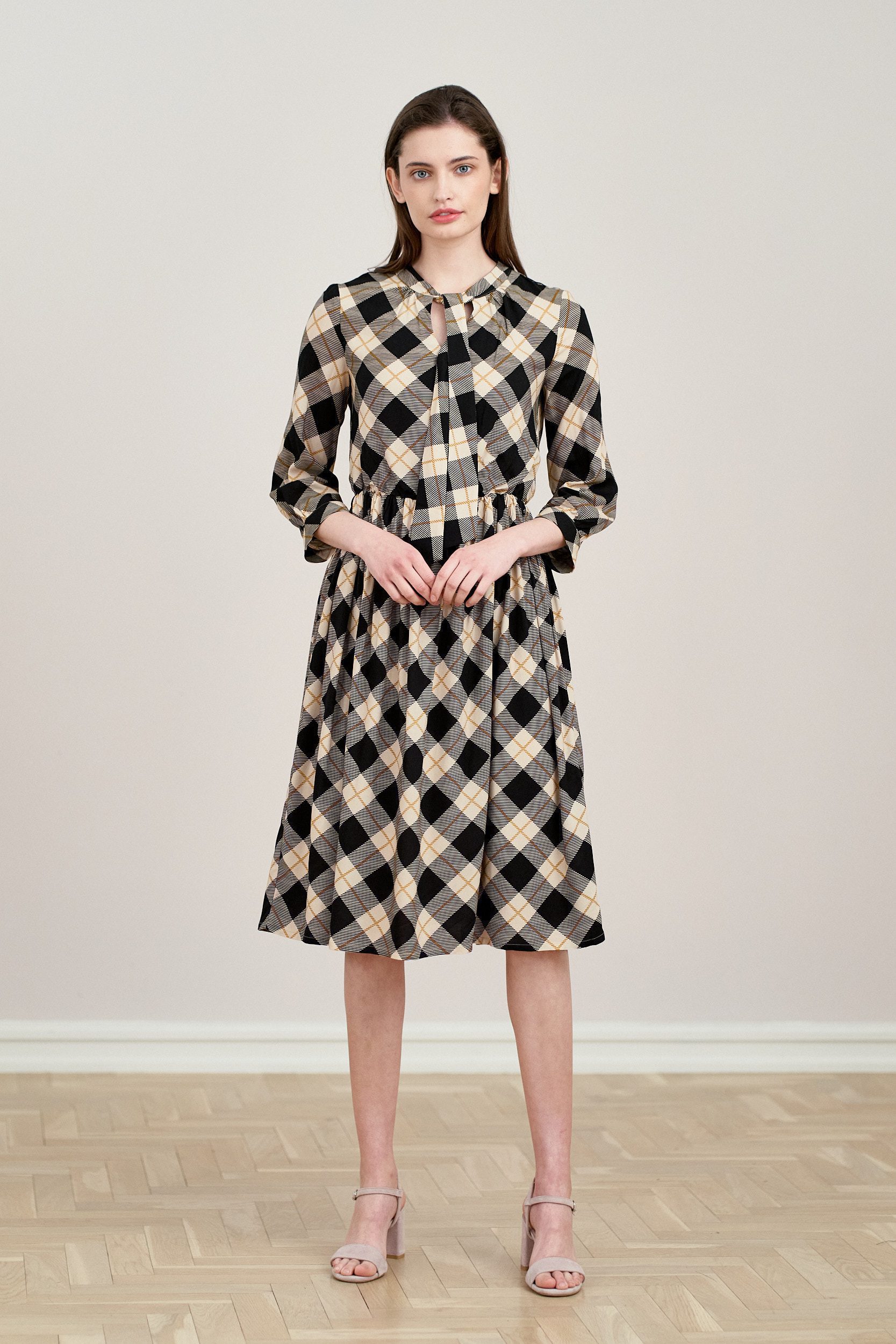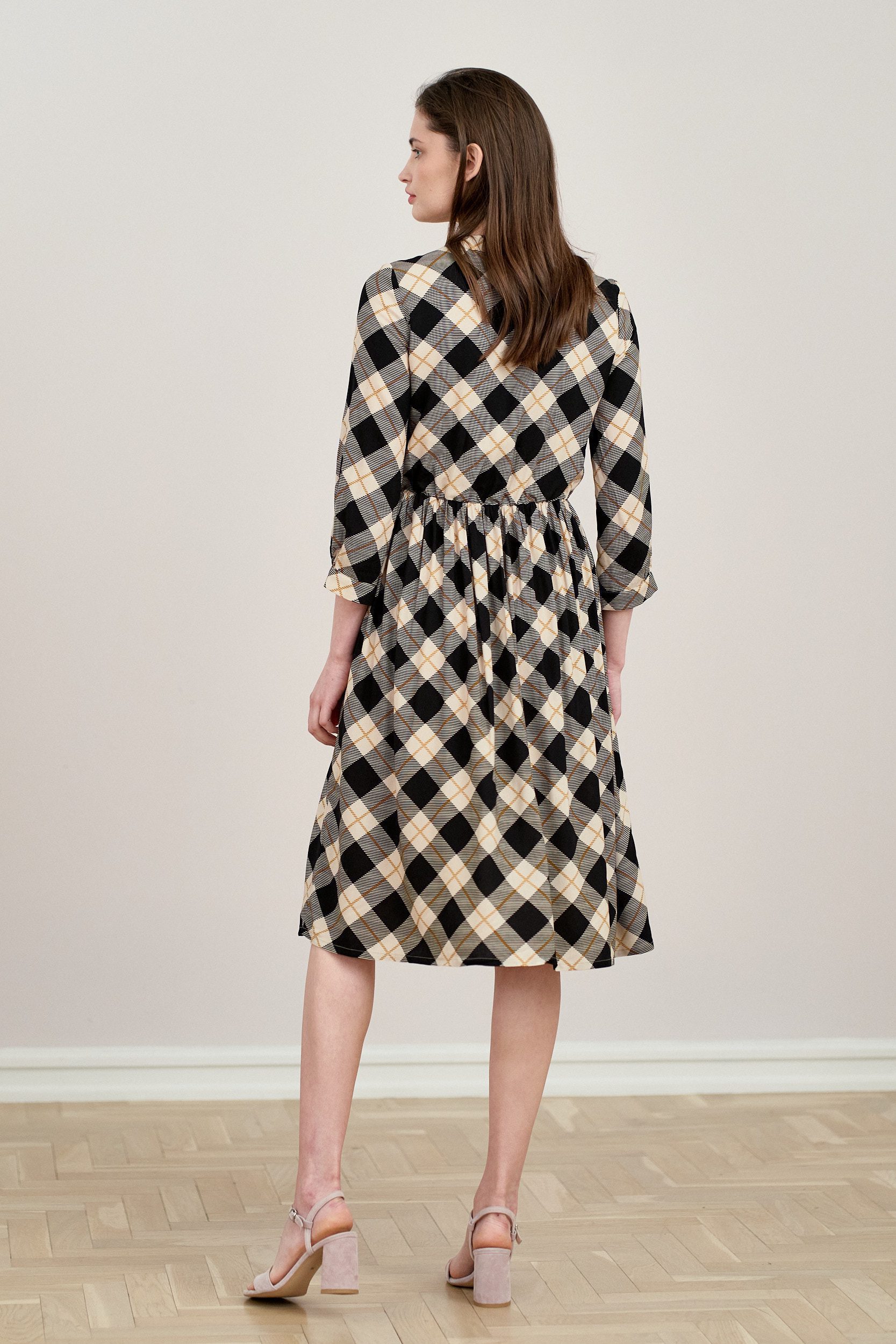 Noelia to sukienka z dekoltem w łezkę i wiązaną pod szyją szarfą. Ma rękaw 3/4, w talii posiada gumkę, dzięki której doskonale dopasuje się do figury.