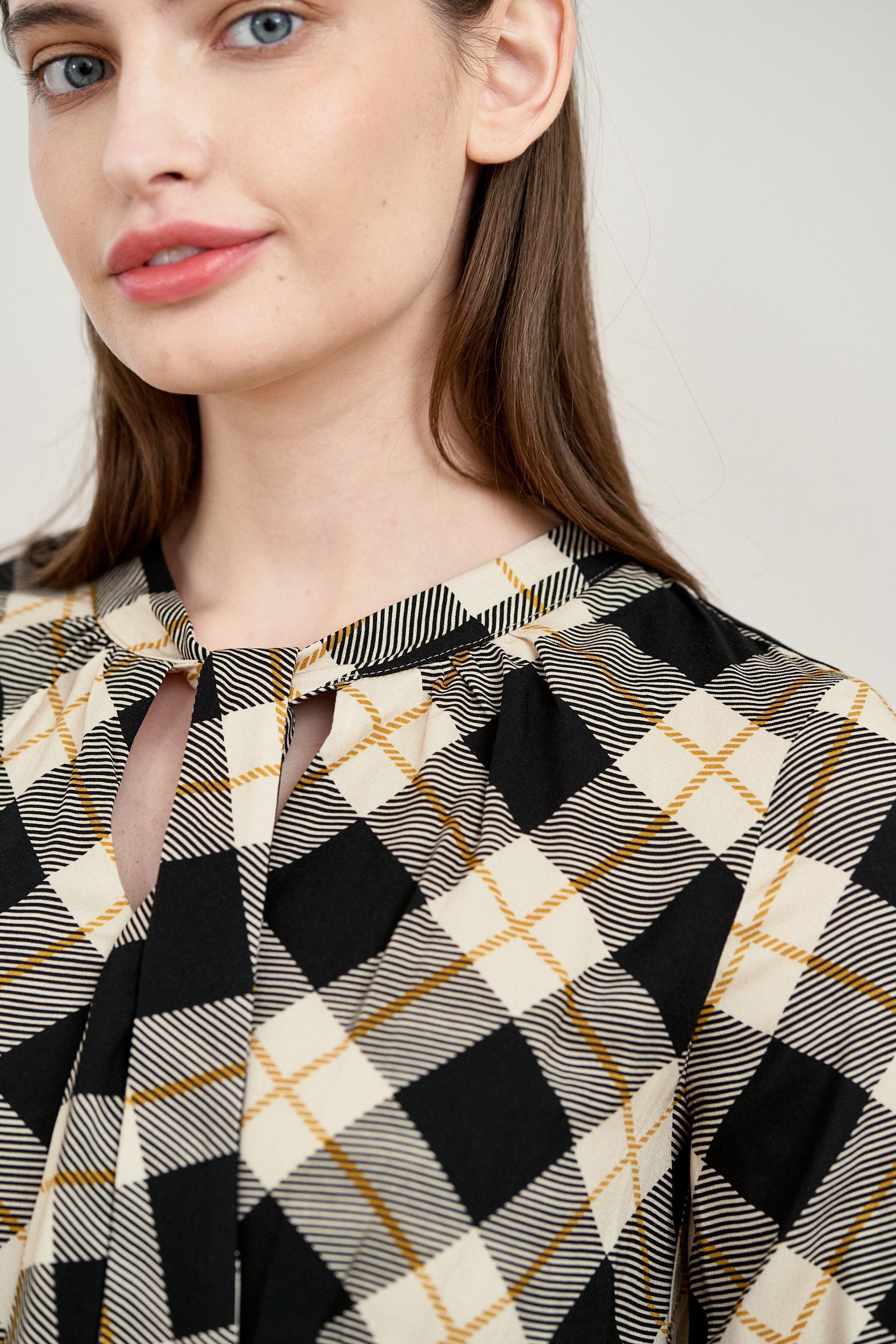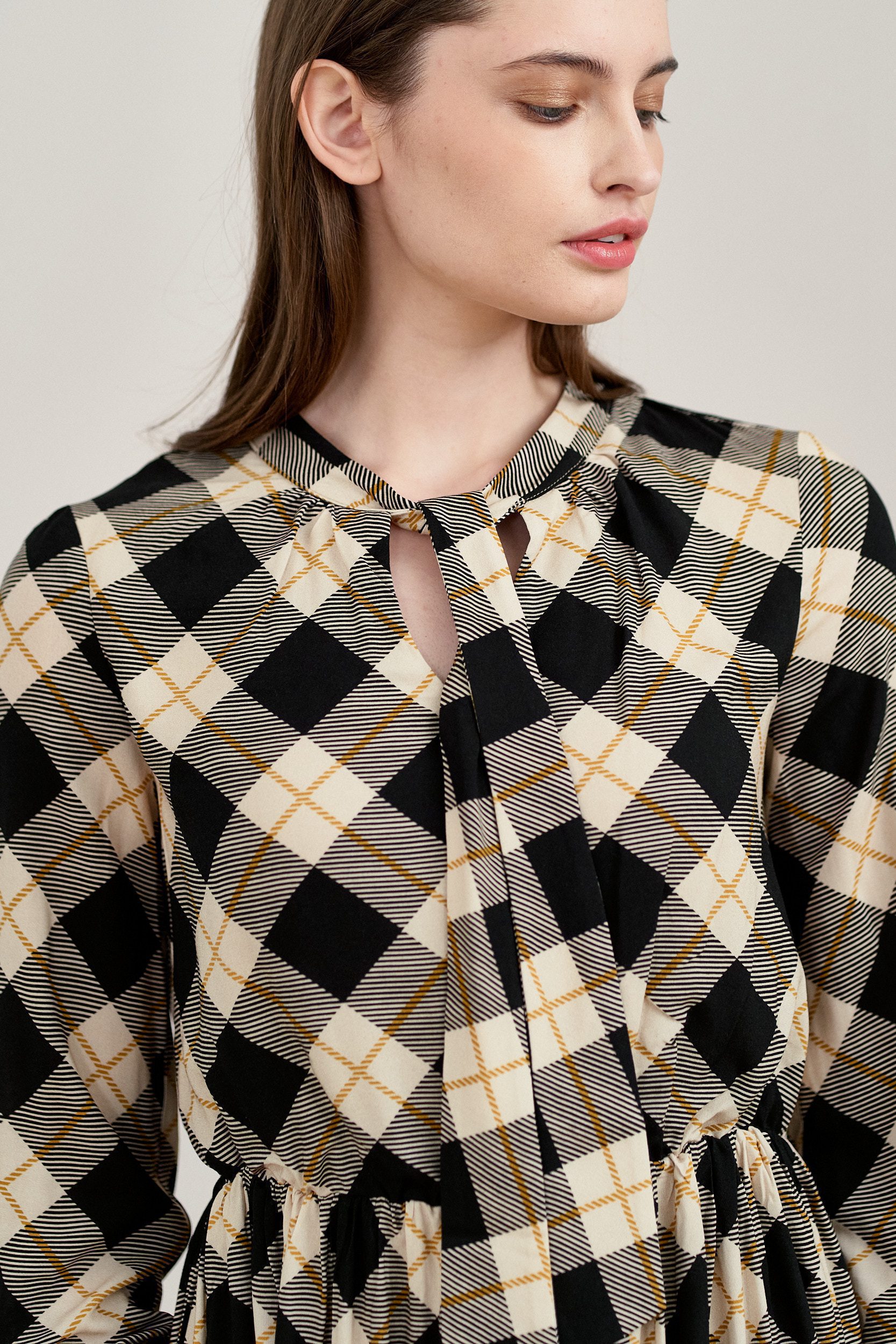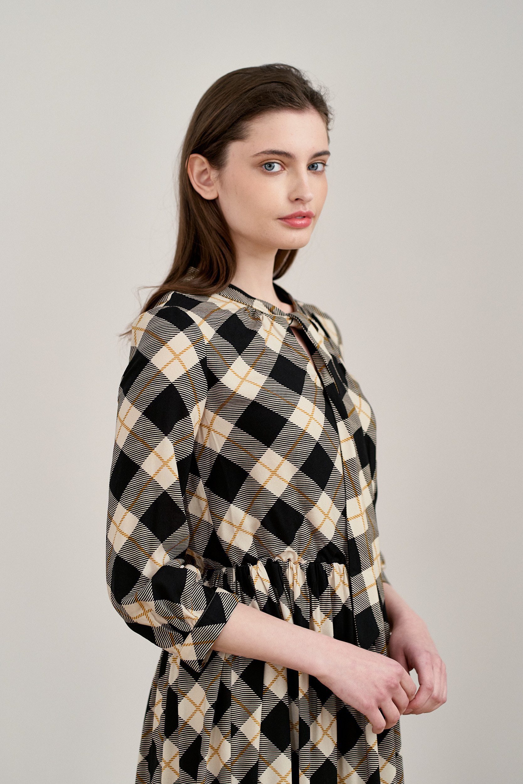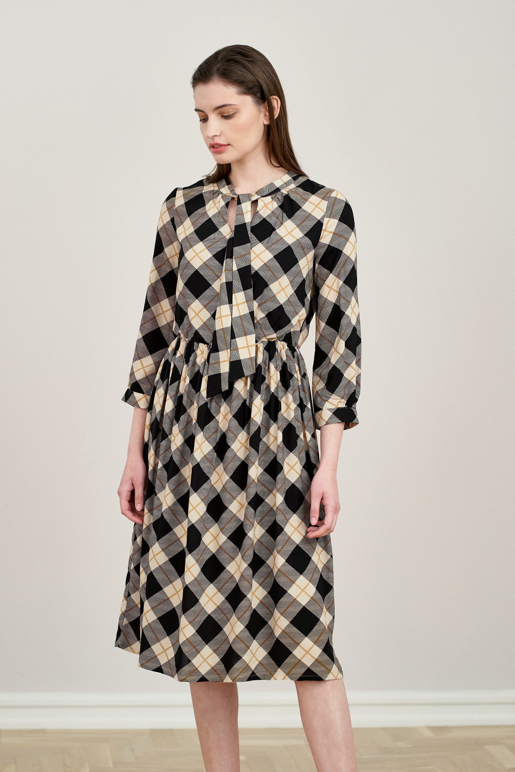 Noelia to sukienka z dekoltem w łezkę i wiązaną pod szyją szarfą. Ma rękaw 3/4, w talii posiada gumkę, dzięki której doskonale dopasuje się do figury.
