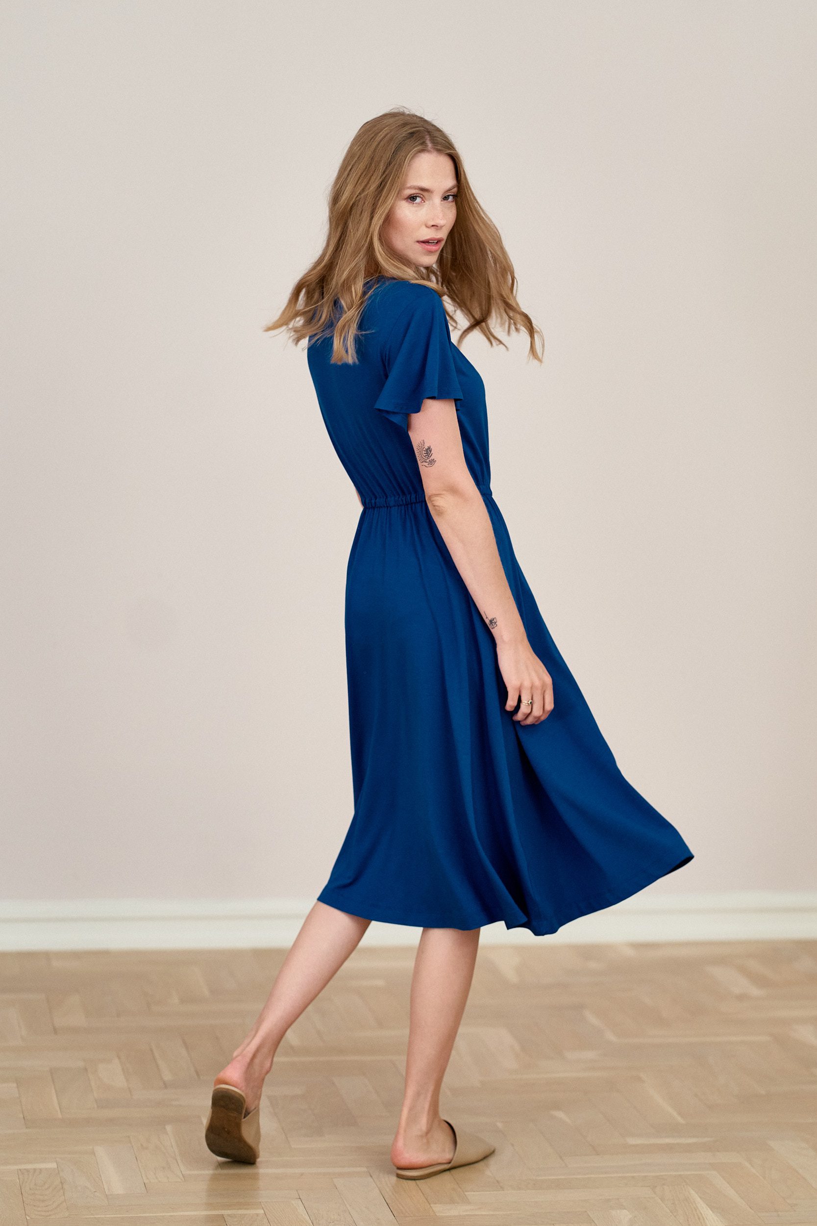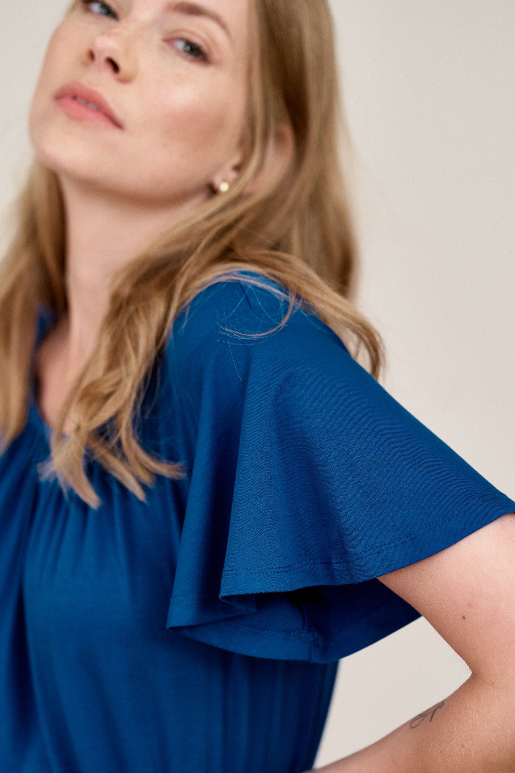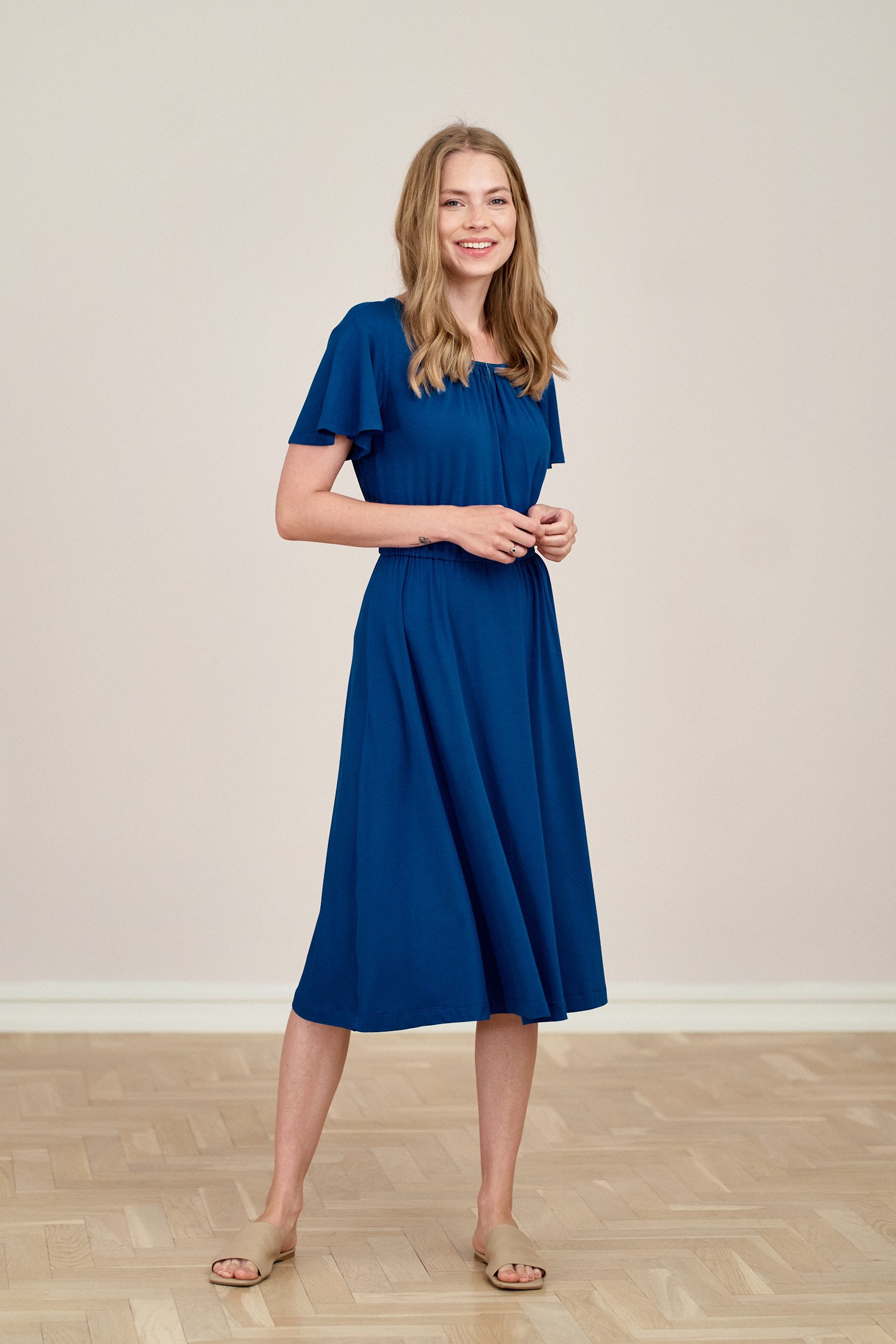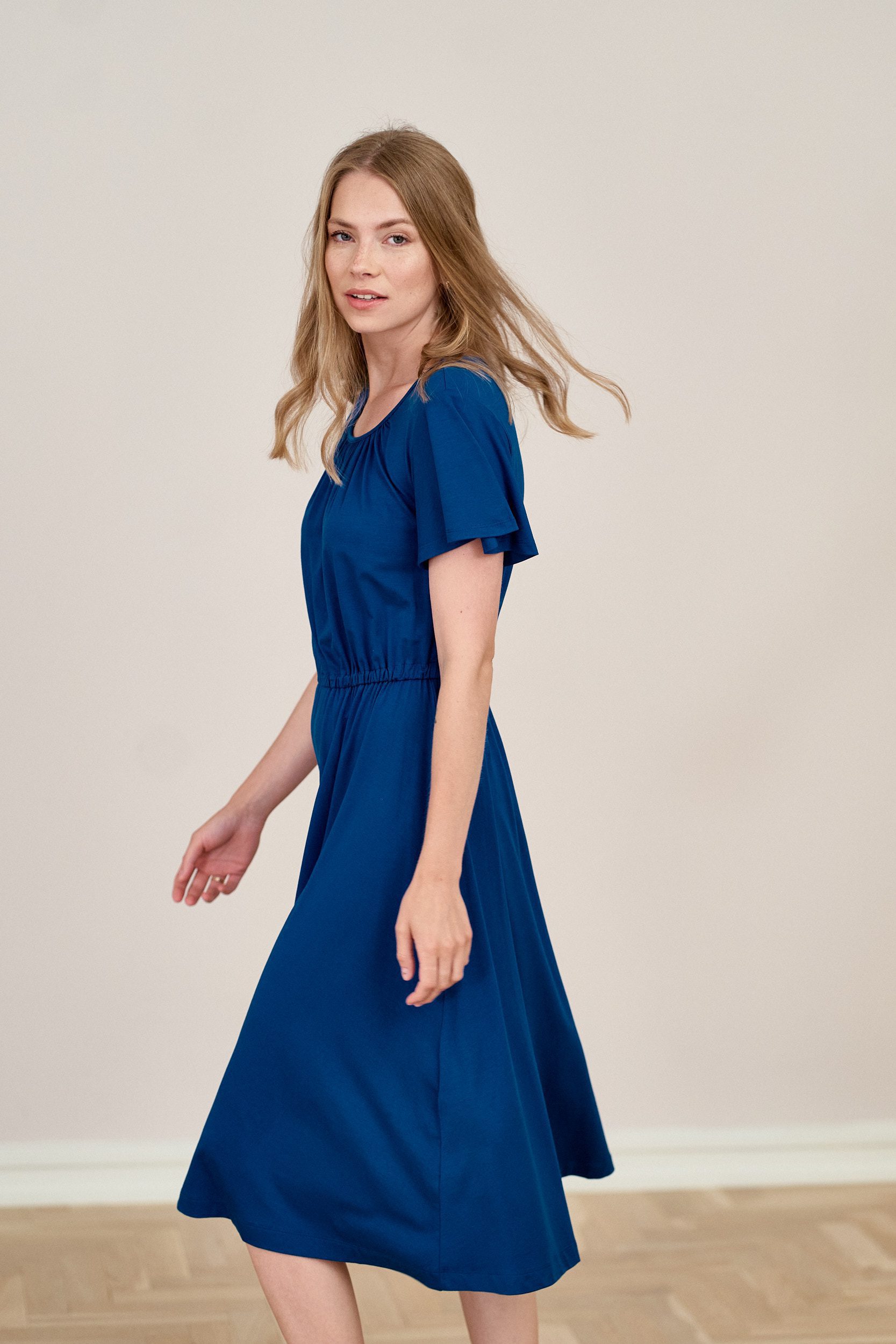 Pola to sukienka midi z krótkiem rękawem i okrągłym dekoltem. W talii sukienka ma gumkę, dzięki czemu świetnie dopasowuje się do sylwetki. Uroku dodają jej motylkowe krótkie rękawki.