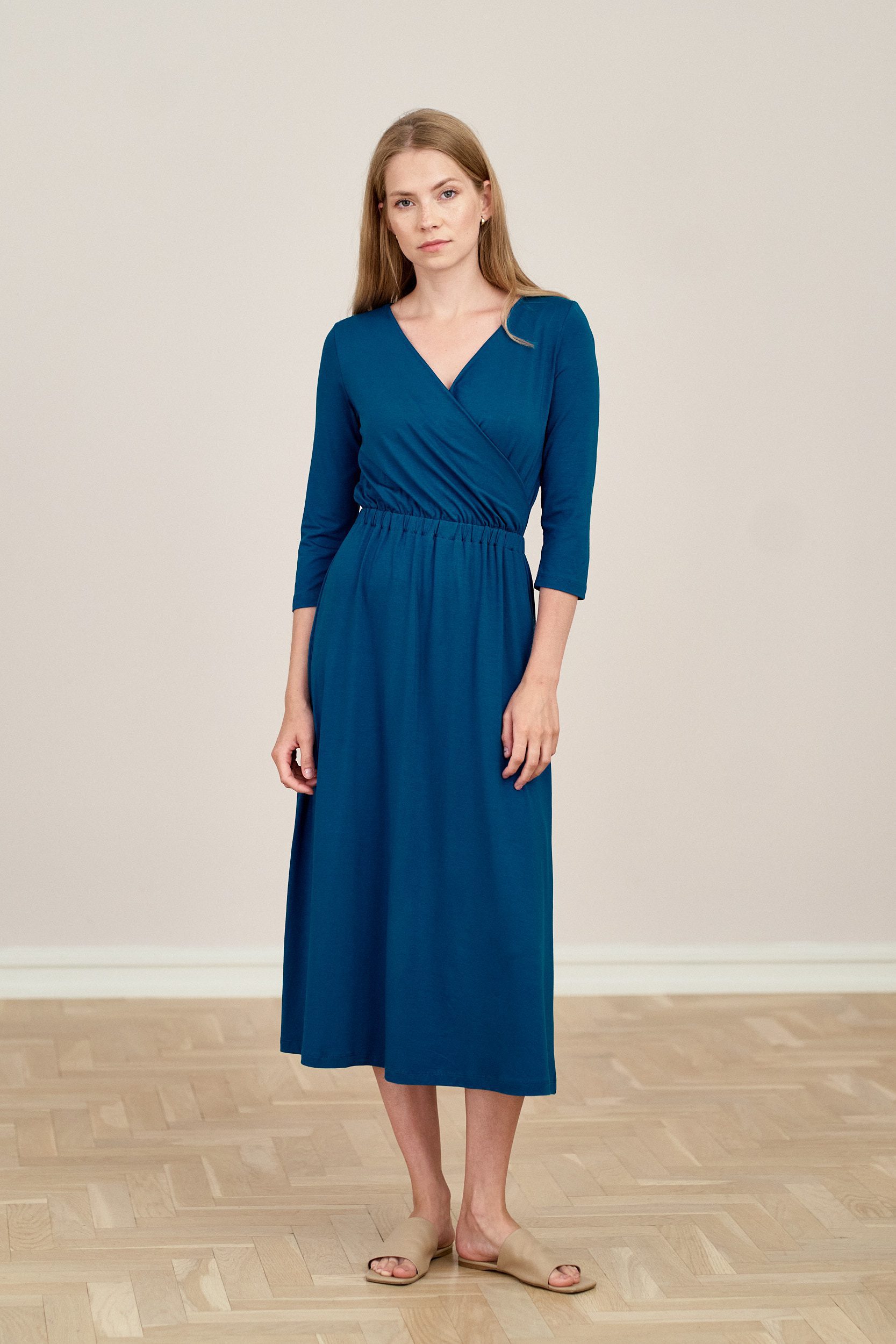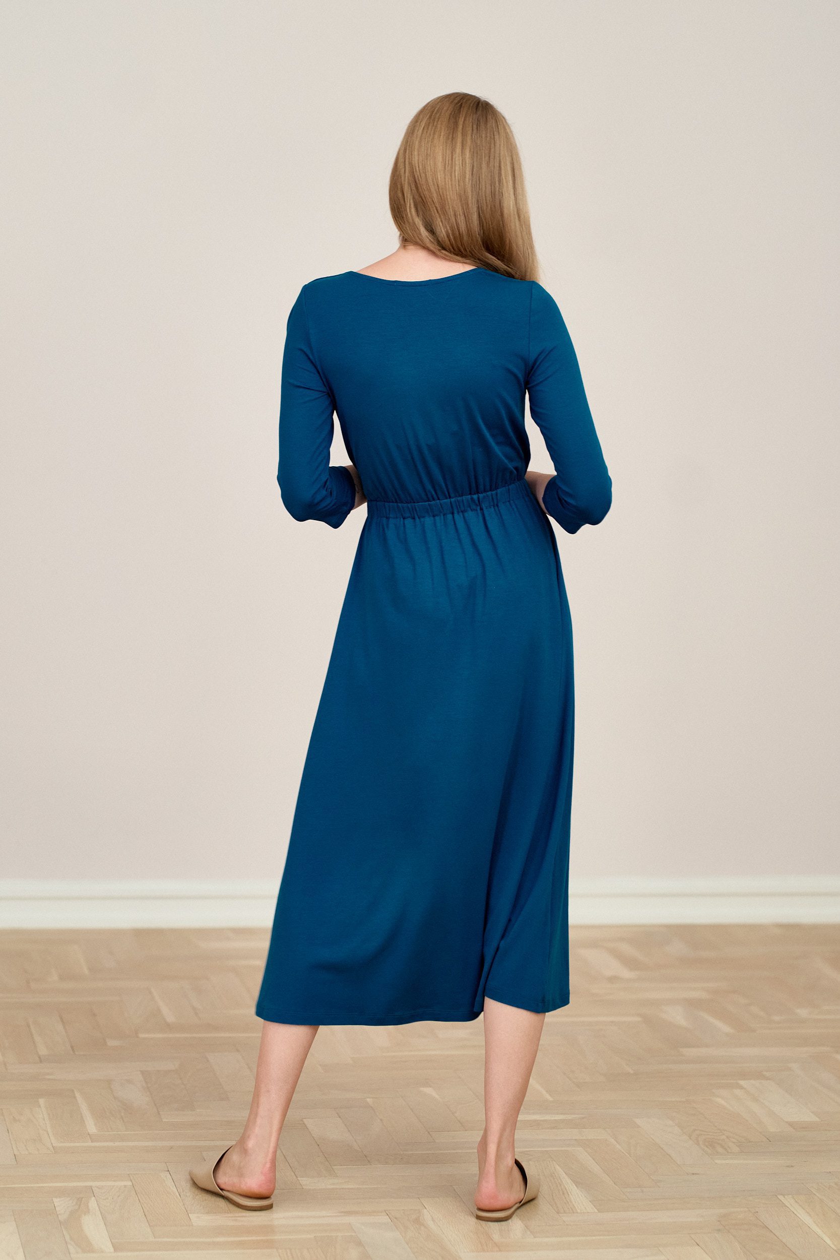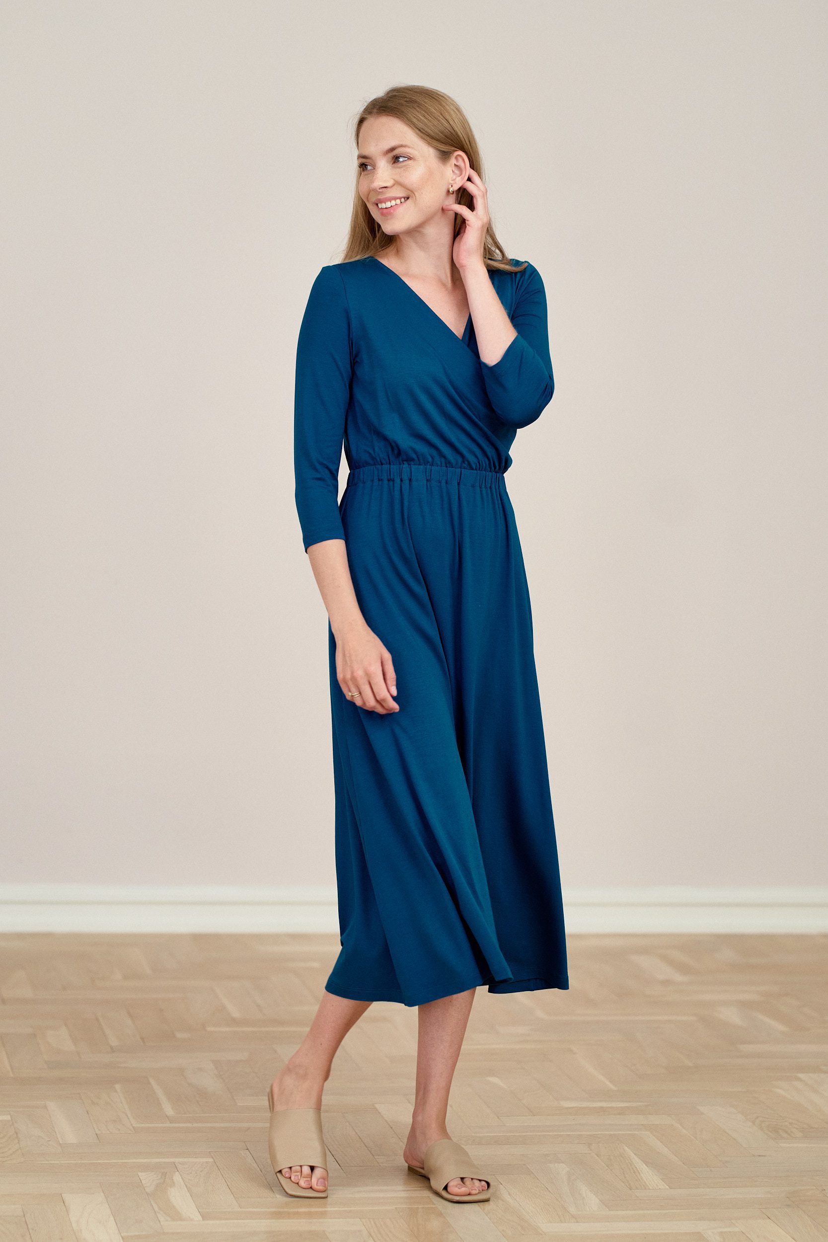 Rita to dzianinowa sukienka z prostymi rękawkami 3/4, o kopertowym dekolcie i rozkloszowanym, marszczonym dole. Talię podkreśla wszyta gumka oddzielająca dolną partię sukienki. Dzięki niej sukienka doskonale dopasuje się do Twojej sylwetki. Długość do połowy łydki dodaje elegancji i pewności siebie. Pięknie się układa, faluje wokół sylwetki i wysmukla ją. To bardzo kobiecy krój, w którym z pewnością poczujesz się wyjątkowo.