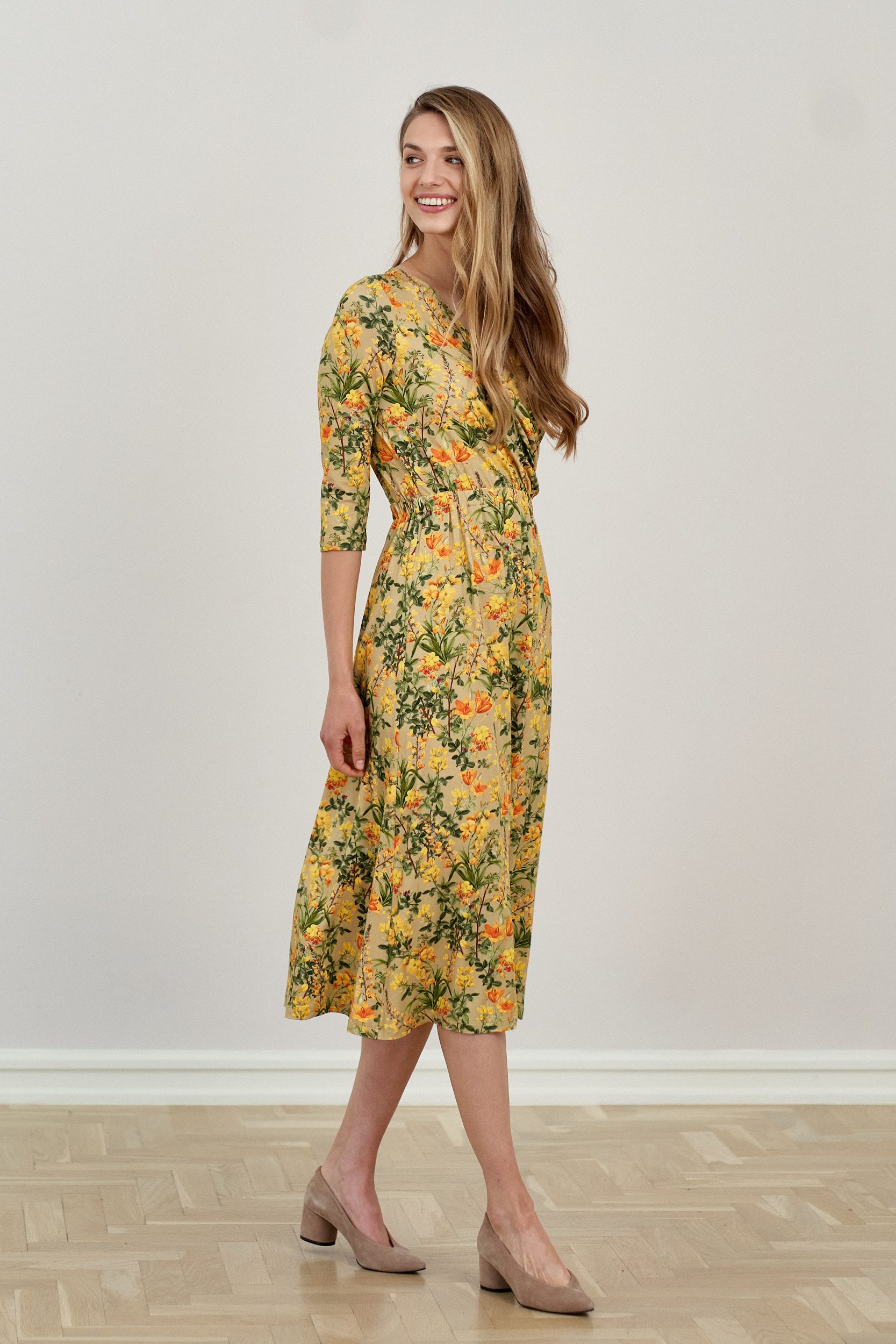 Rity nie trzeba specjalnie zachwalać, bo to nasz bestsellerowy model, który optycznie wyszczupla figurę i odejmuje kilogramy. W połączeniu z delikatnym wzorem w kwiaty – zapiera dech! Ta sukienka jest po prostu skazana na sukces.