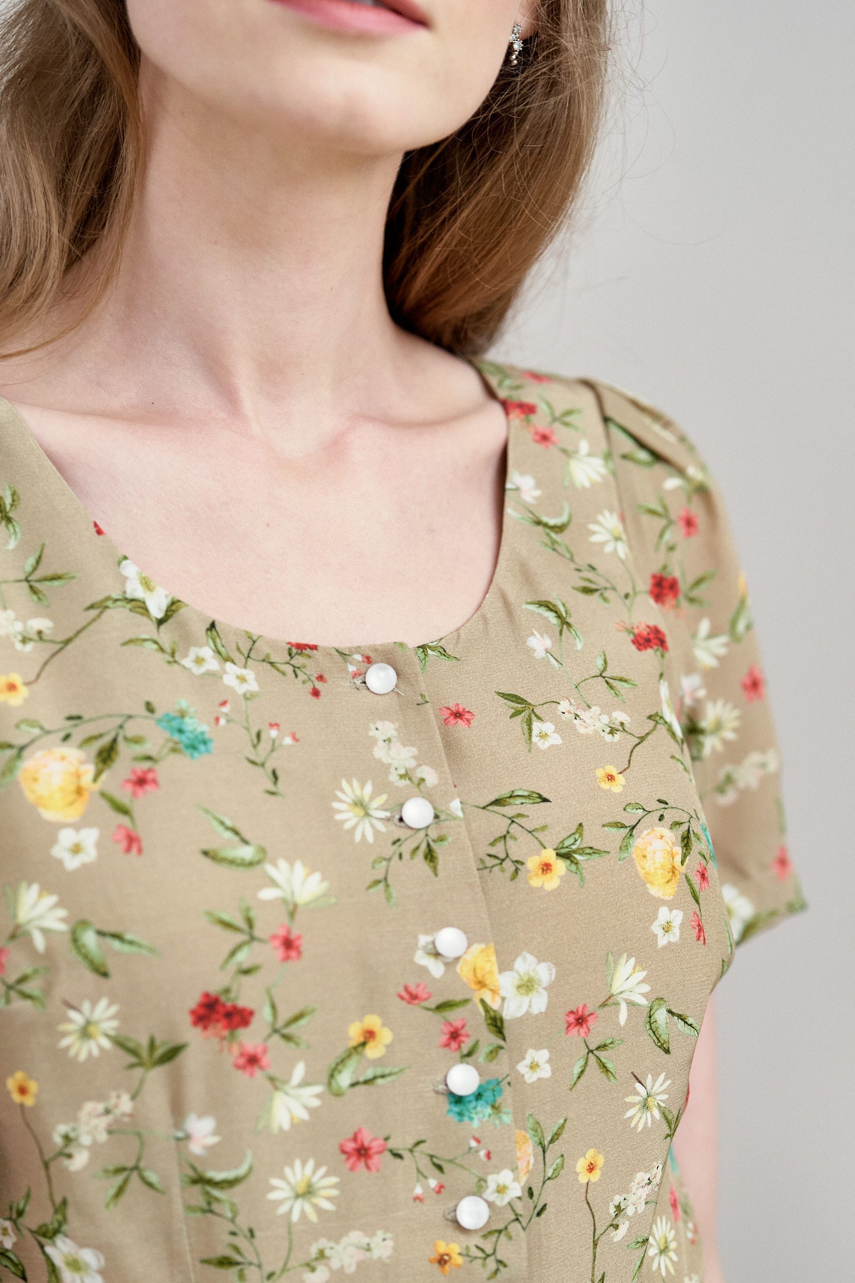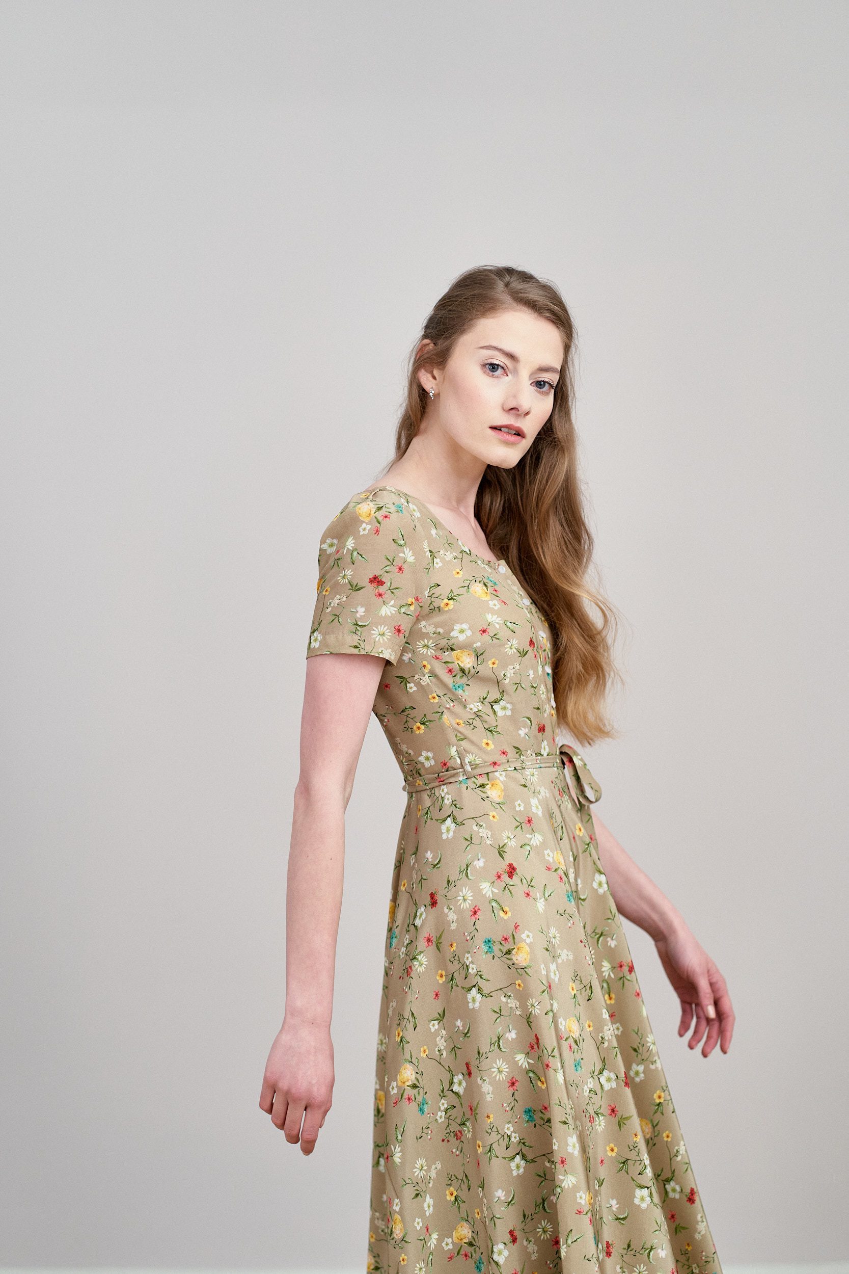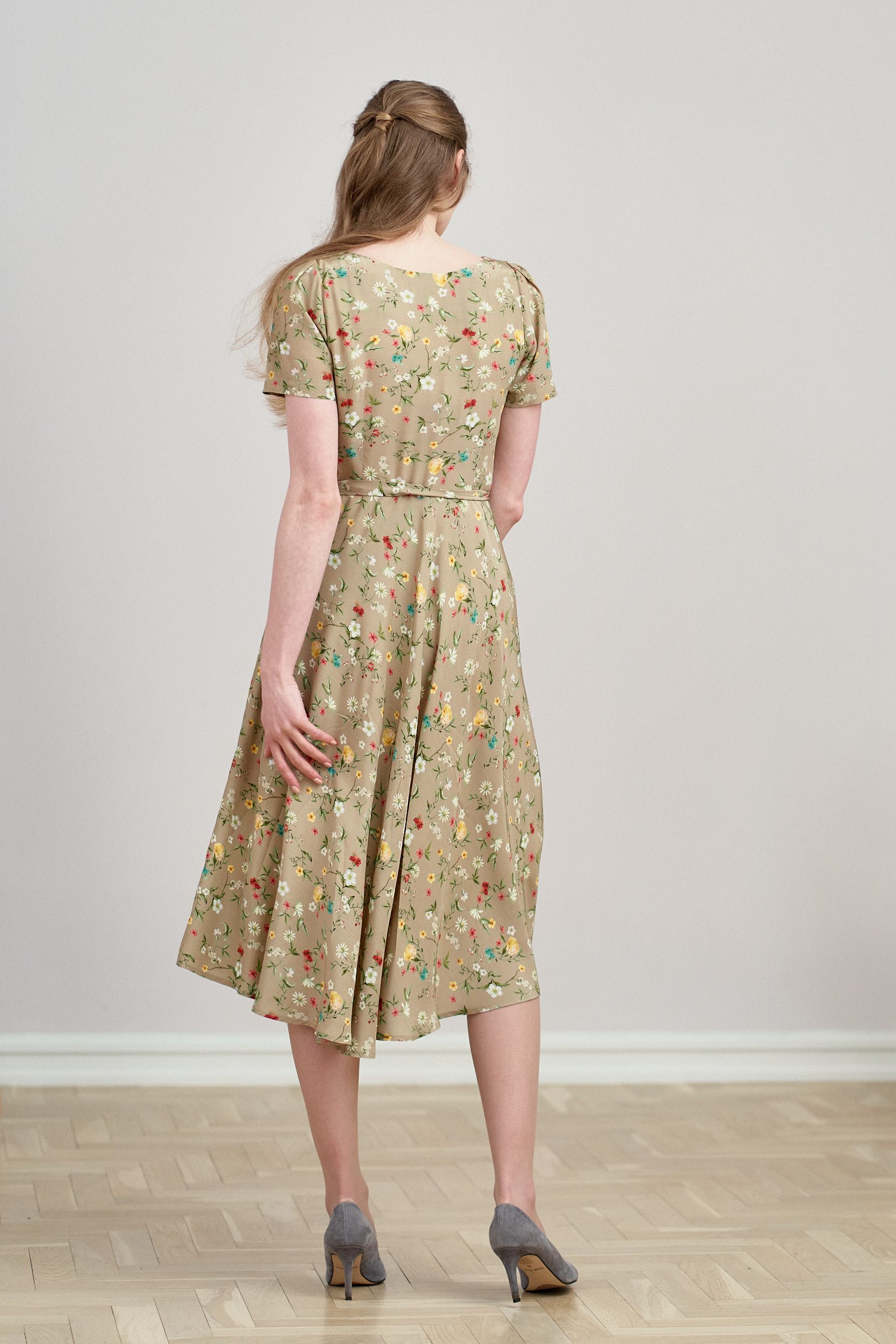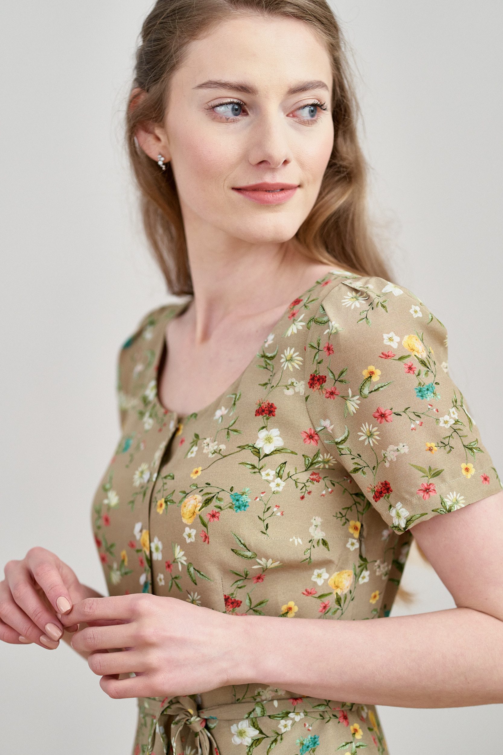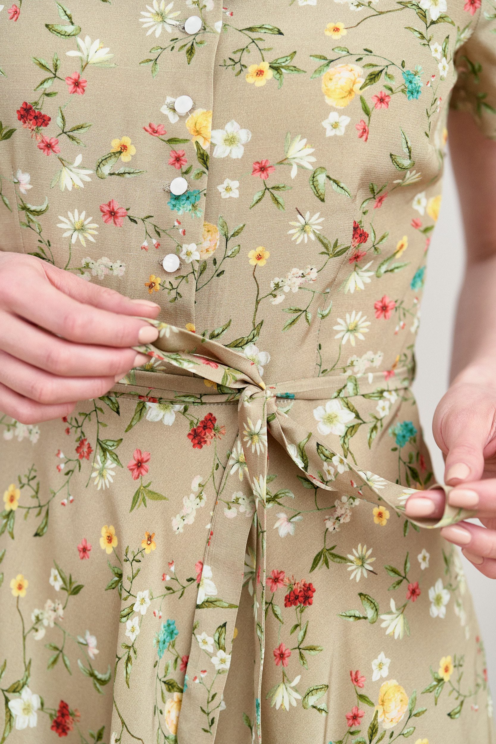 Rosa to sukienka midi z okrągłym dekoltem i krótkim rękawem zakończonym bufką. Góra zapinana jest na guziczki, w talii wszyty jest pasek, który możesz zawiązać w ozdobną kokardkę.