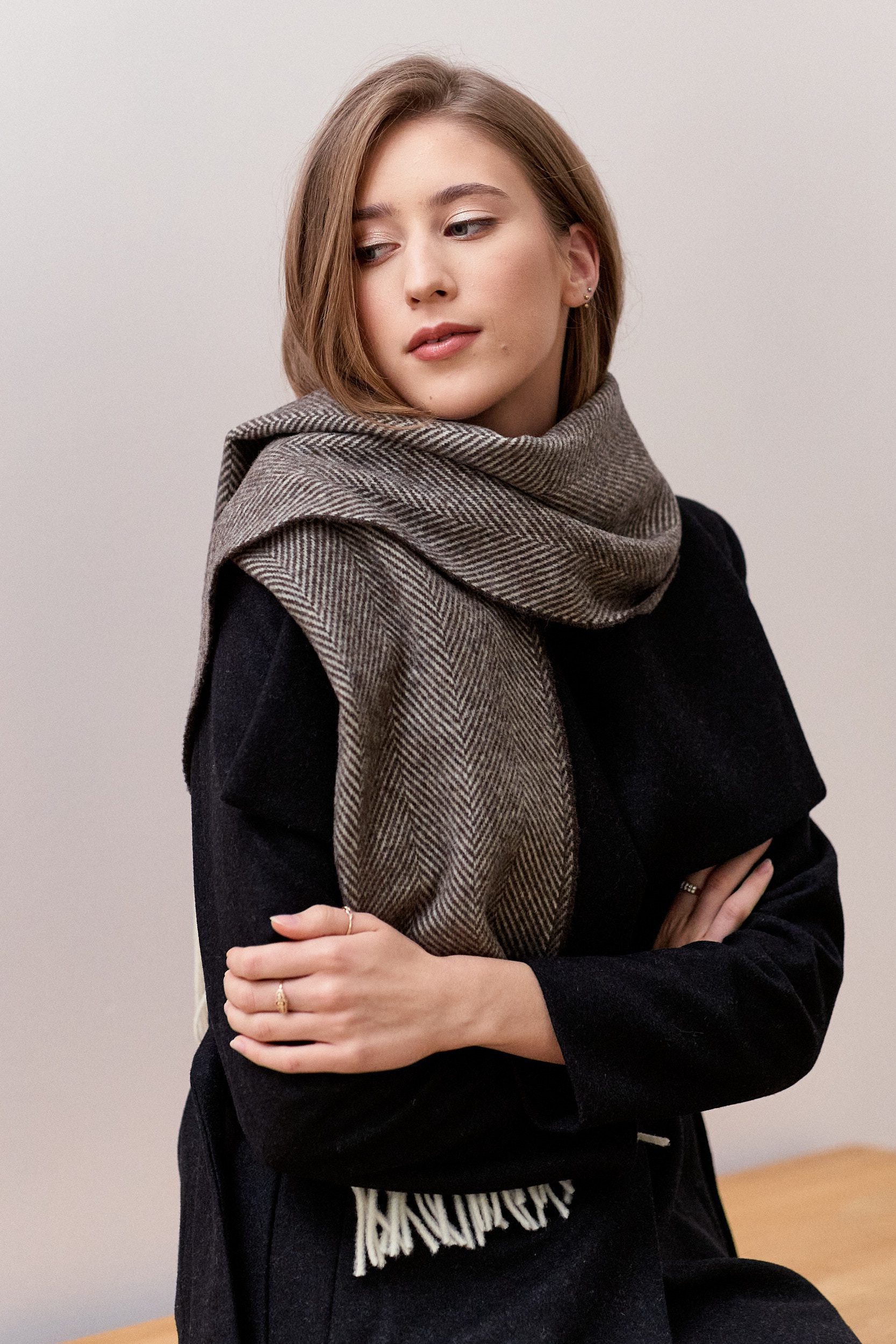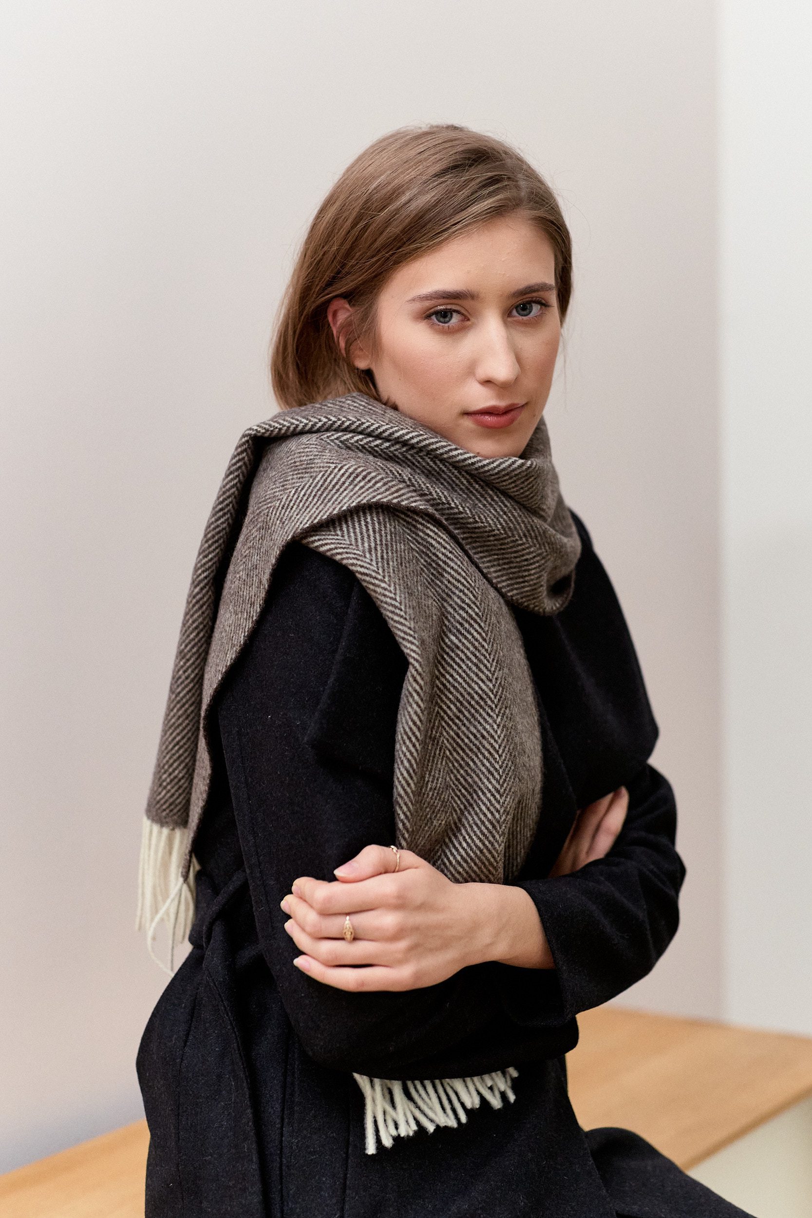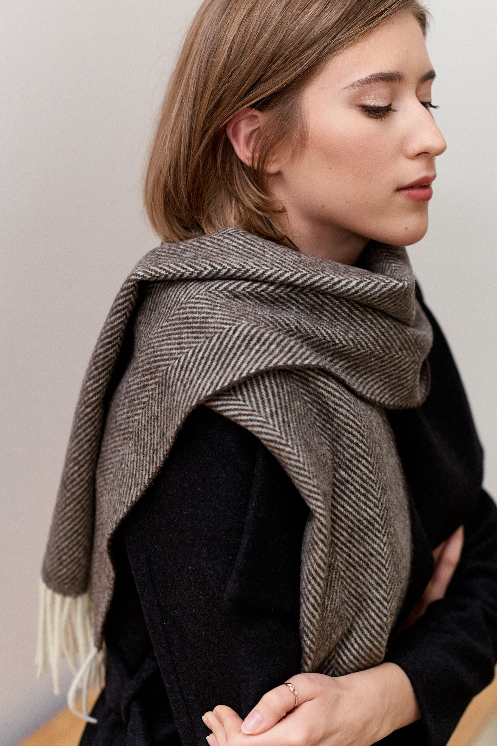 Szal wełniany w brązową jodełkę