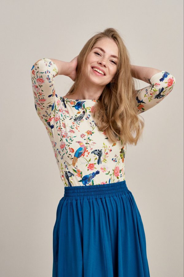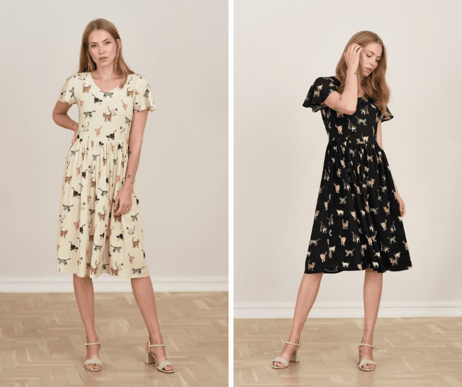 Odezwały się głosy, że takich niekwiatowych wzorów brakowało w naszej ofercie. Posypały się propozycje i życzenia na naszym fanpage’u – „uszyjcie coś w jaskółki”; „koty, koty – gdzie są koty?!”, „czy będą leśne zwierzęta?”, „marzy mi się wzór w chrabąszcze”… Zaczęliśmy zatem poszukiwania, które trwają do dziś. Jeśli tylko rzucą nam się w oczy jakieś zwierzęta, nie wahamy się długo. Lista zwierząt, które „wlazły” do szaf naszych klientek i się w nich zadomowiły, jest długa: pawie, mewy, żurawie, kaczki, motyle, ćmy, jaskółki, tygrysy, konie, koty, psy, a nawet węże. A lista wciąż niewyczerpana, więc można się spodziewać kolejnych perełek do kolekcji.